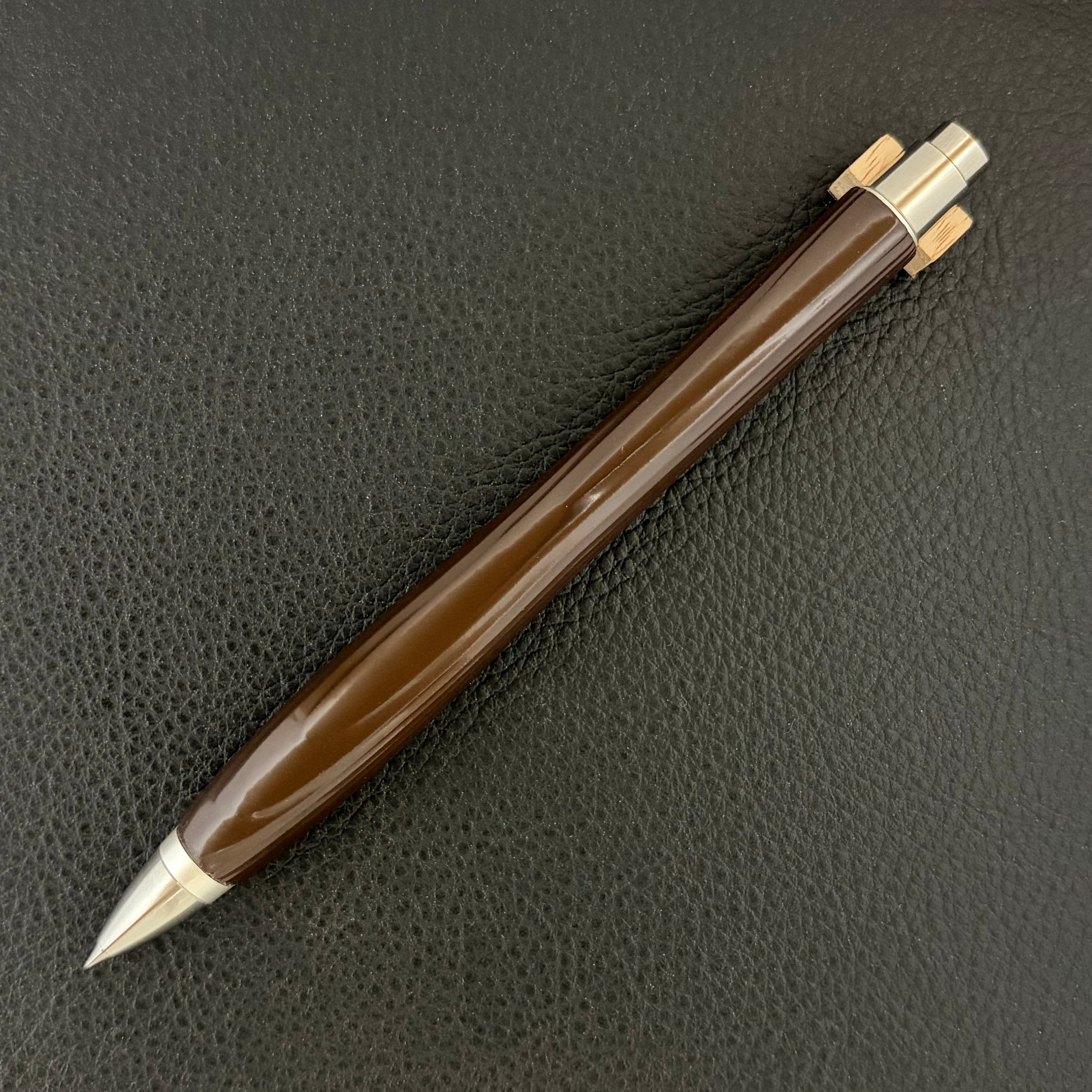 ボールペンのノックシステムは、ドイツ最高のクリックメカニズムを採用してあります。このメカニズムはユニークな機構のため、クリックしたときのカチカチ音が静かで、どんな場所でも気兼ねなく使うことができます。滑らかに動くこのプッシュ感覚を一度味わうと他には戻れなくなってしまうほどの魅力があります。 100分の1単位の加工精度で削り出されたペン先は、軸ブレも全くありません。