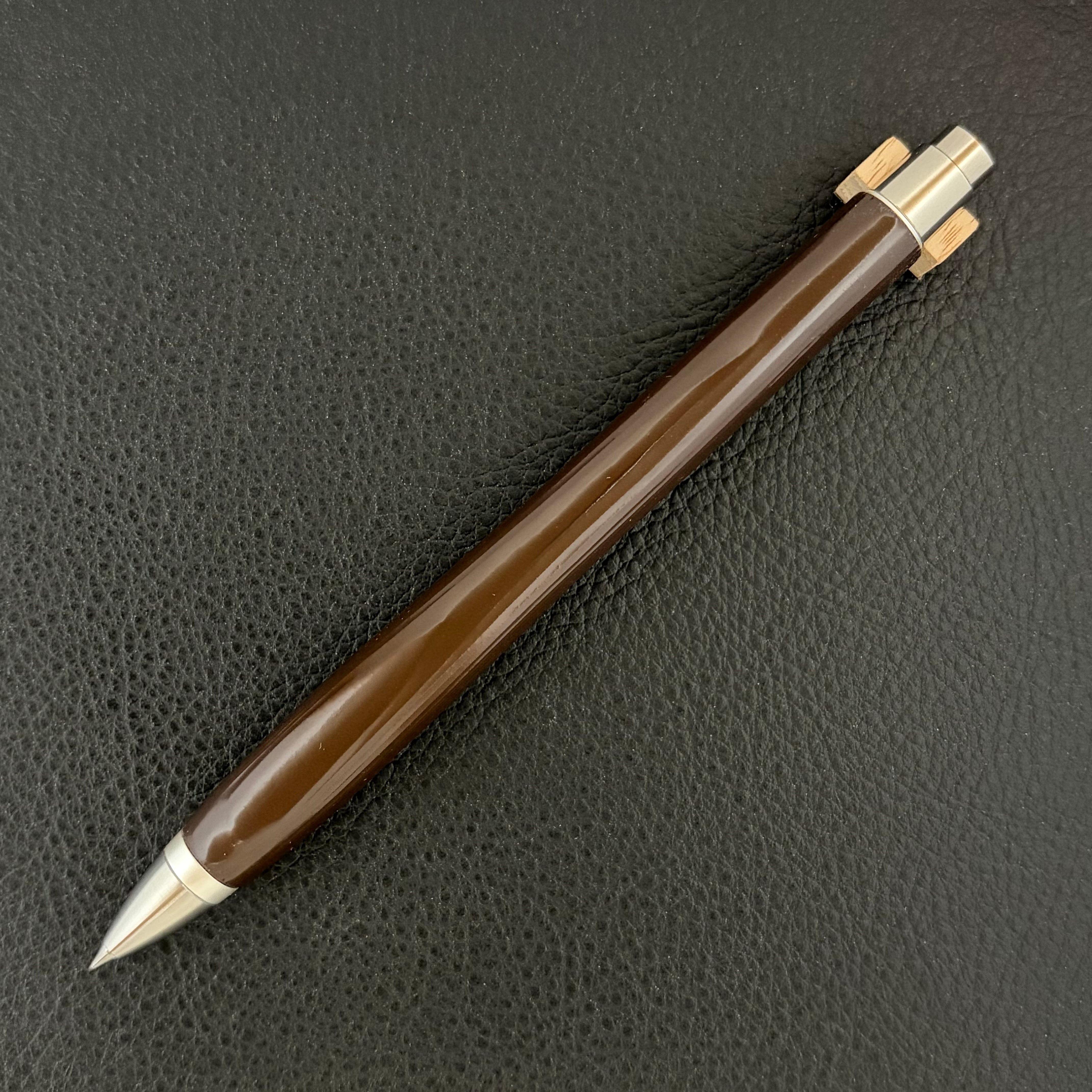 ボールペンのノックシステムは、ドイツ最高のクリックメカニズムを採用してあります。このメカニズムはユニークな機構のため、クリックしたときのカチカチ音が静かで、どんな場所でも気兼ねなく使うことができます。滑らかに動くこのプッシュ感覚を一度味わうと他には戻れなくなってしまうほどの魅力があります。 100分の1単位の加工精度で削り出されたペン先は、軸ブレも全くありません。