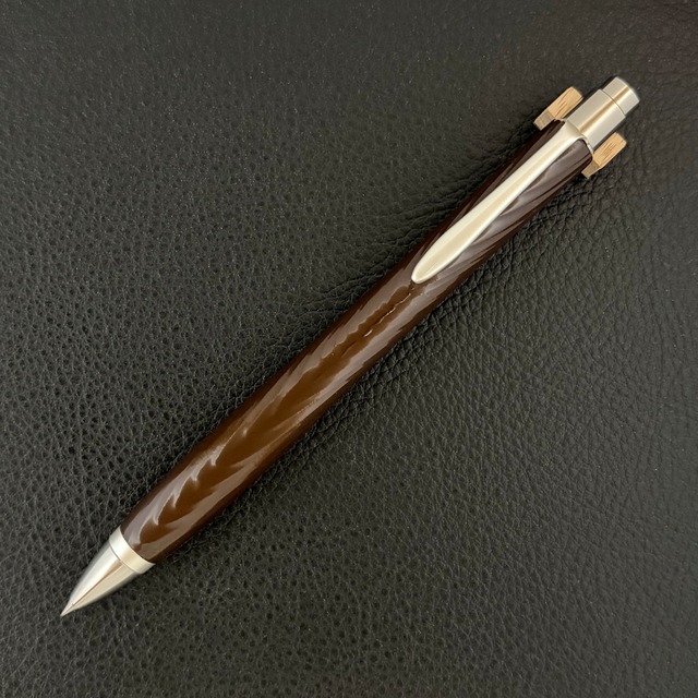 ボールペンのノックシステムは、ドイツ最高のクリックメカニズムを採用してあります。このメカニズムはユニークな機構のため、クリックしたときのカチカチ音が静かで、どんな場所でも気兼ねなく使うことができます。滑らかに動くこのプッシュ感覚を一度味わうと他には戻れなくなってしまうほどの魅力があります。 100分の1単位の加工精度で削り出されたペン先は、軸ブレも全くありません。