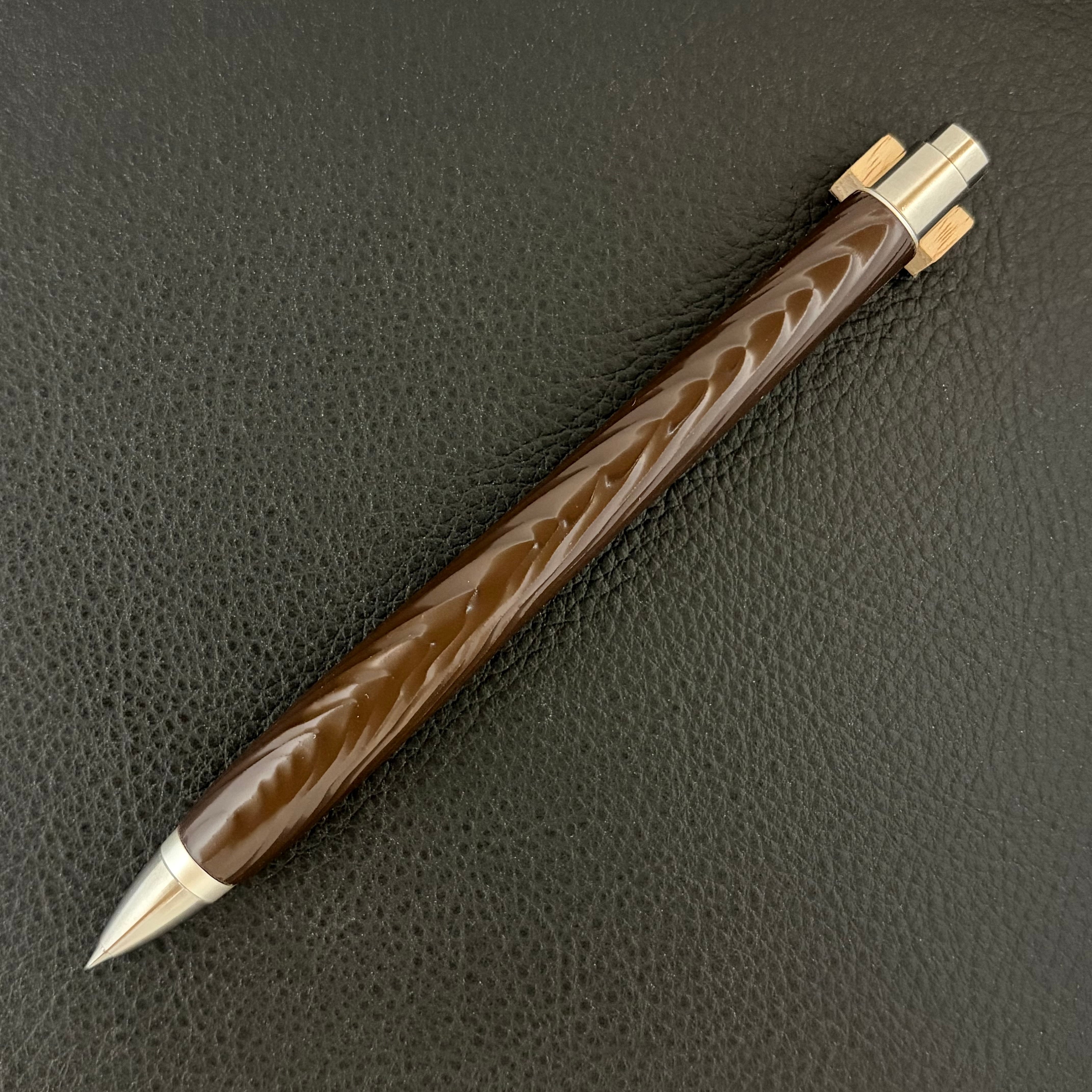 ボールペンのノックシステムは、ドイツ最高のクリックメカニズムを採用してあります。このメカニズムはユニークな機構のため、クリックしたときのカチカチ音が静かで、どんな場所でも気兼ねなく使うことができます。滑らかに動くこのプッシュ感覚を一度味わうと他には戻れなくなってしまうほどの魅力があります。 100分の1単位の加工精度で削り出されたペン先は、軸ブレも全くありません。