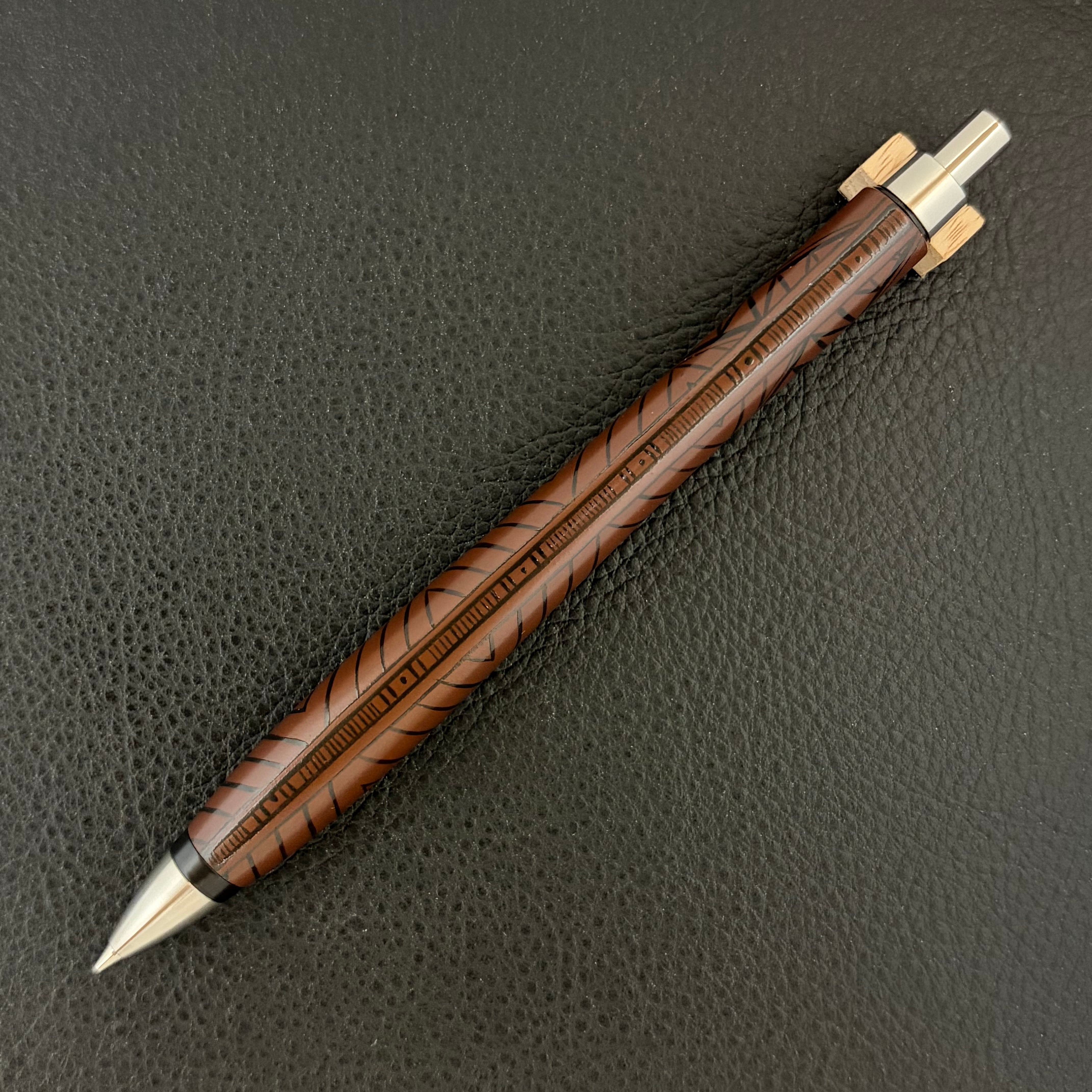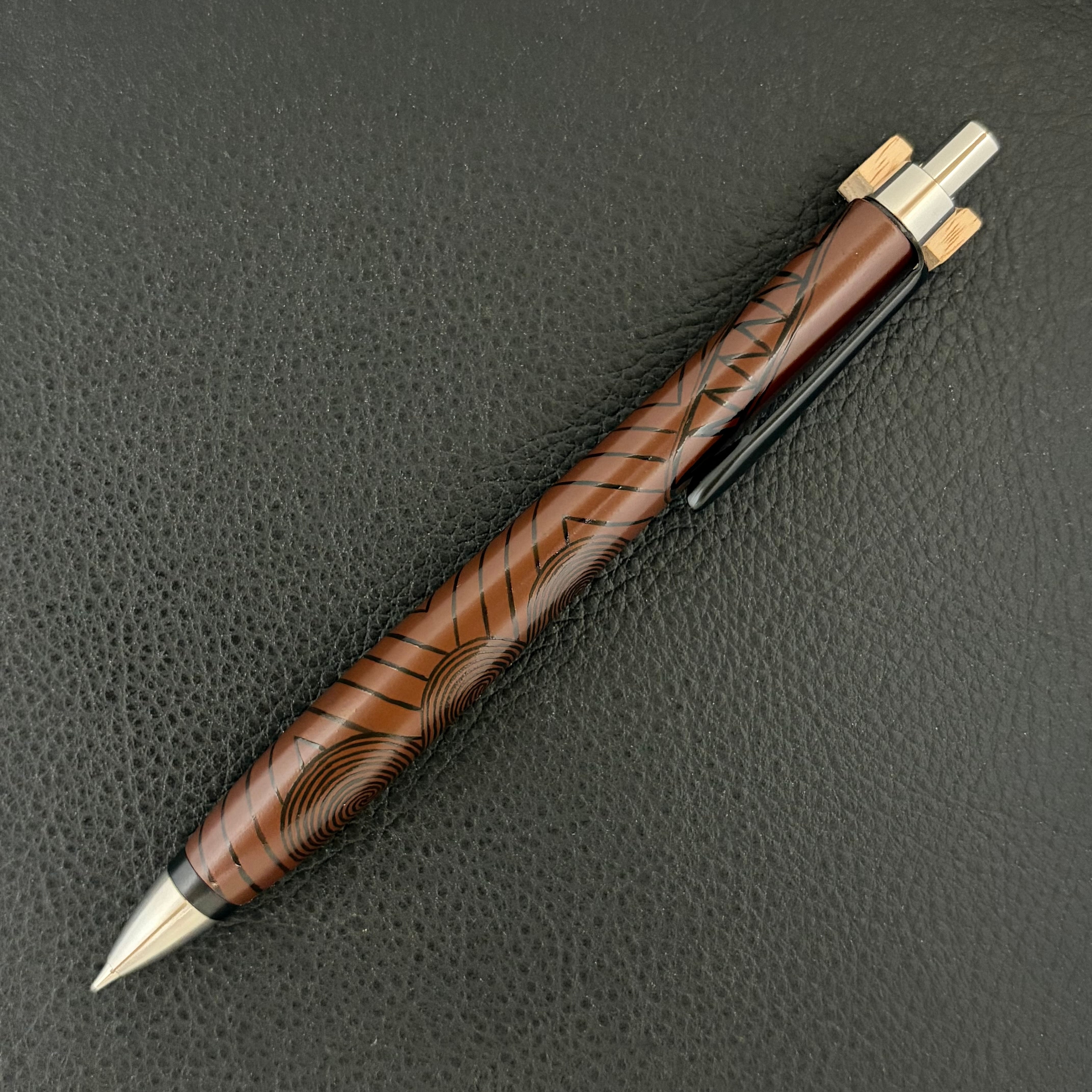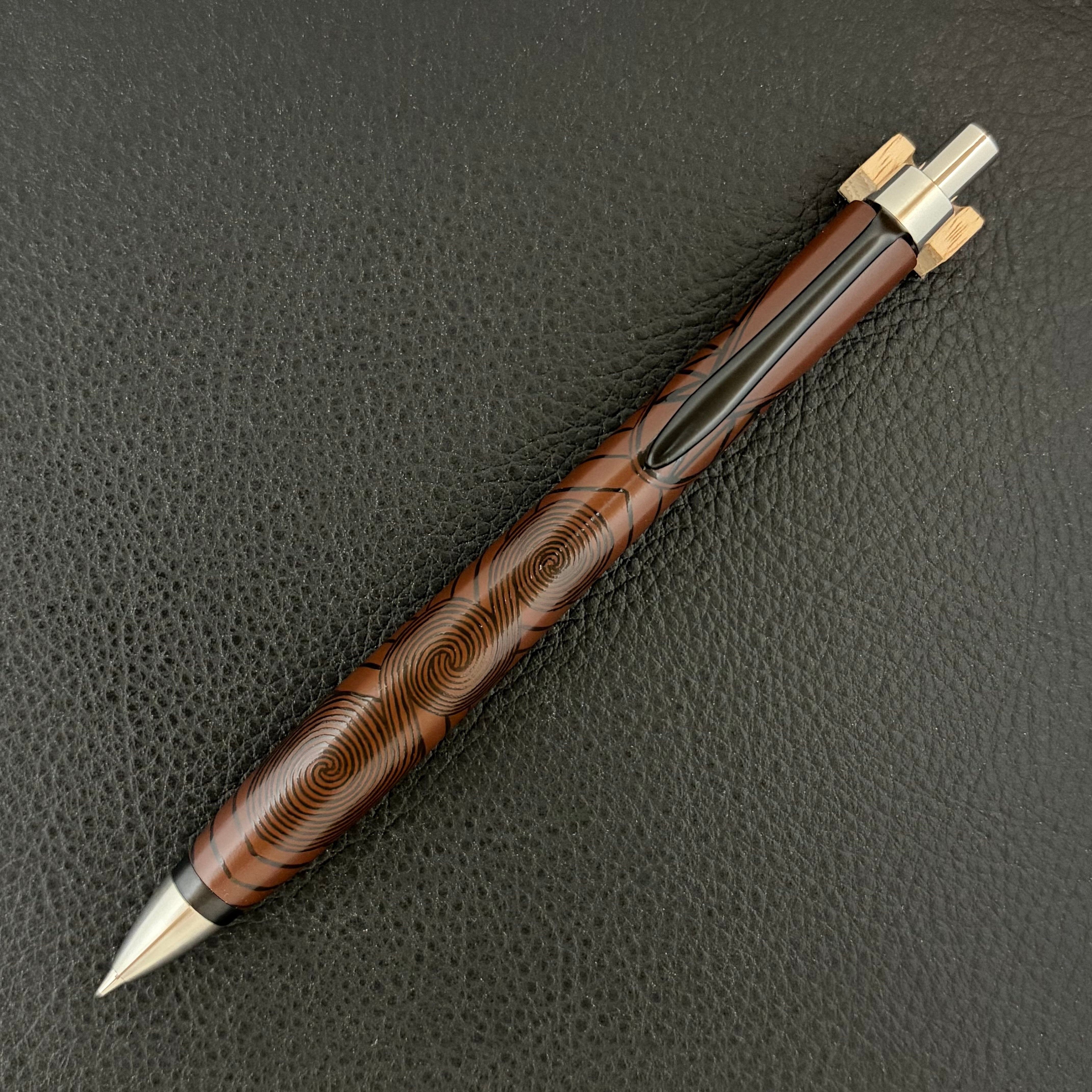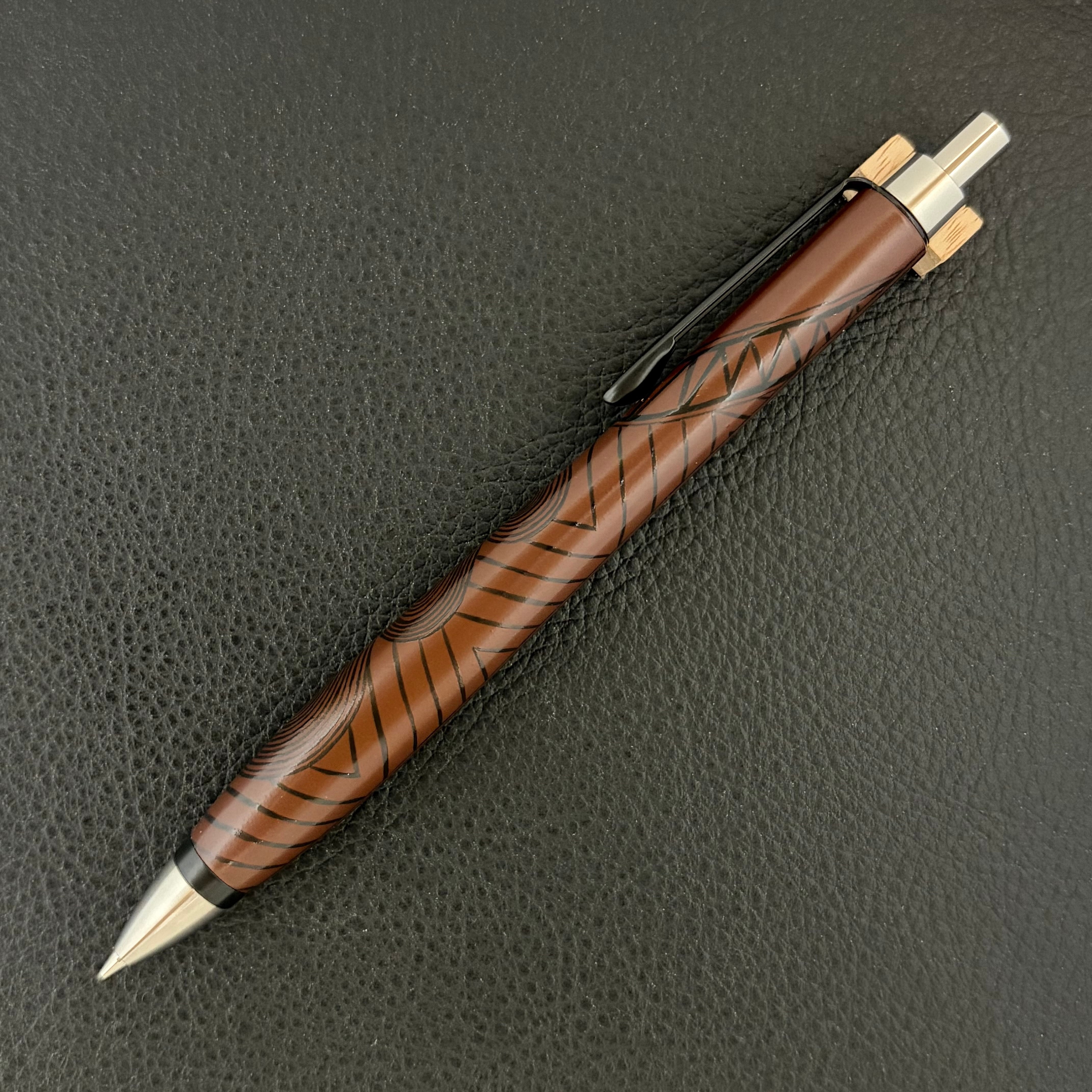 このペンに漆職人の手仕事により、縄文の黒漆を用いて丹念に縄文の文様を刻み上げました。