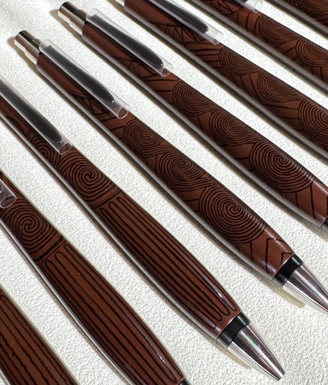 このペンに使った木は、職人が伐採し1年以上天然乾燥させた藪椿を使い、川から採取したバクテリアがつくる顔料「パイプ状ベンガラ」と国産漆を合わせて制作しています。