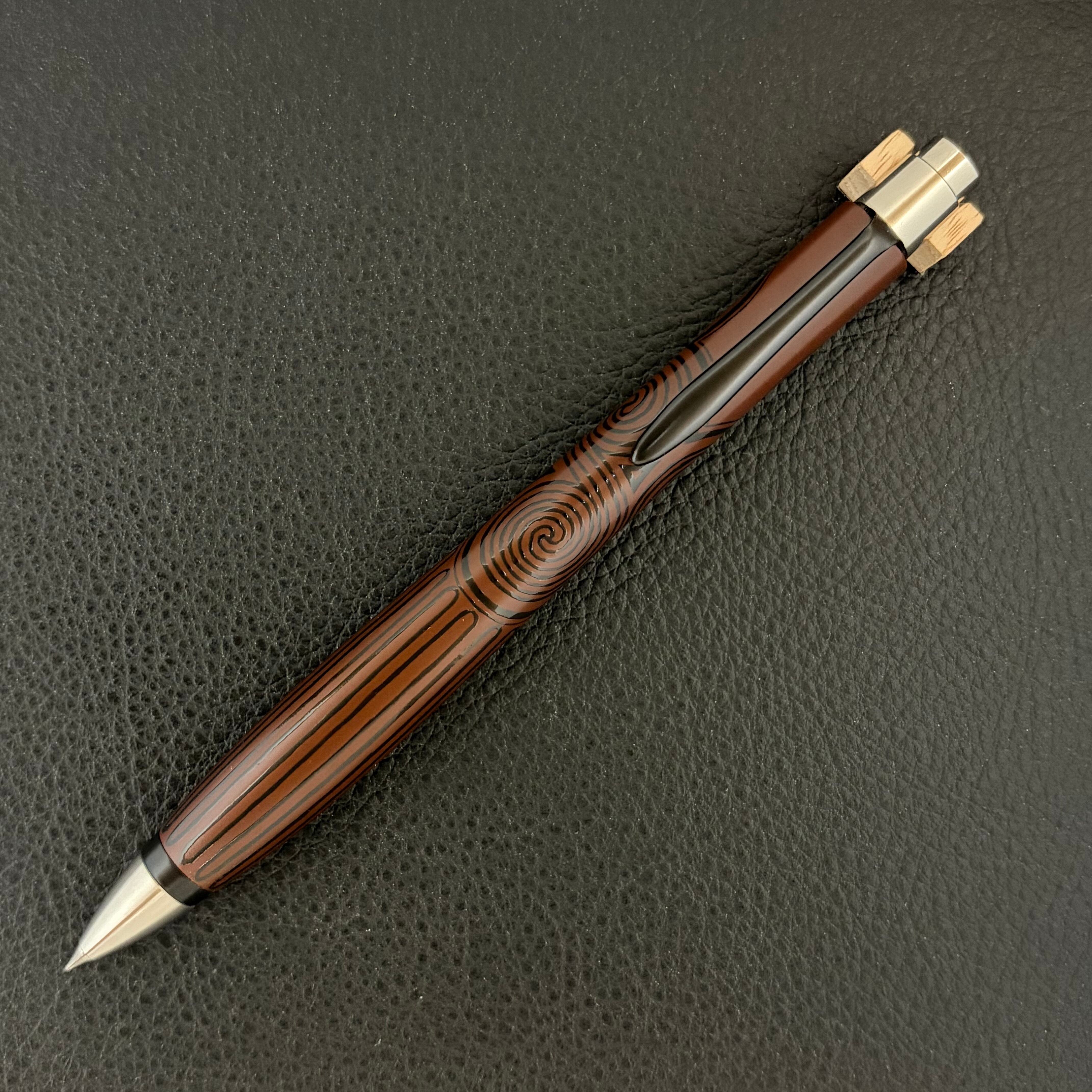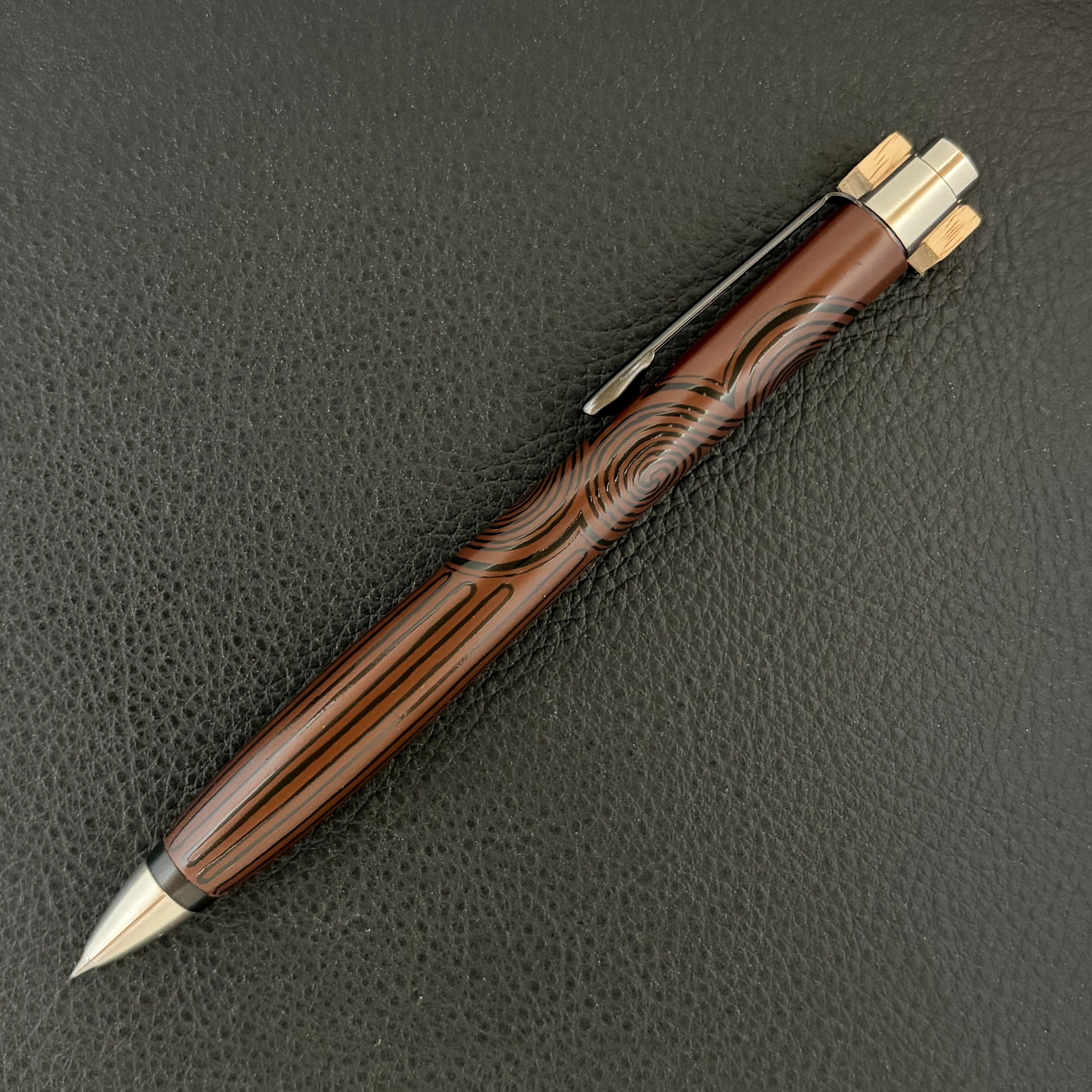 このペンに漆職人の手仕事により、縄文の黒漆を用いて丹念に縄文の文様を刻み上げました。