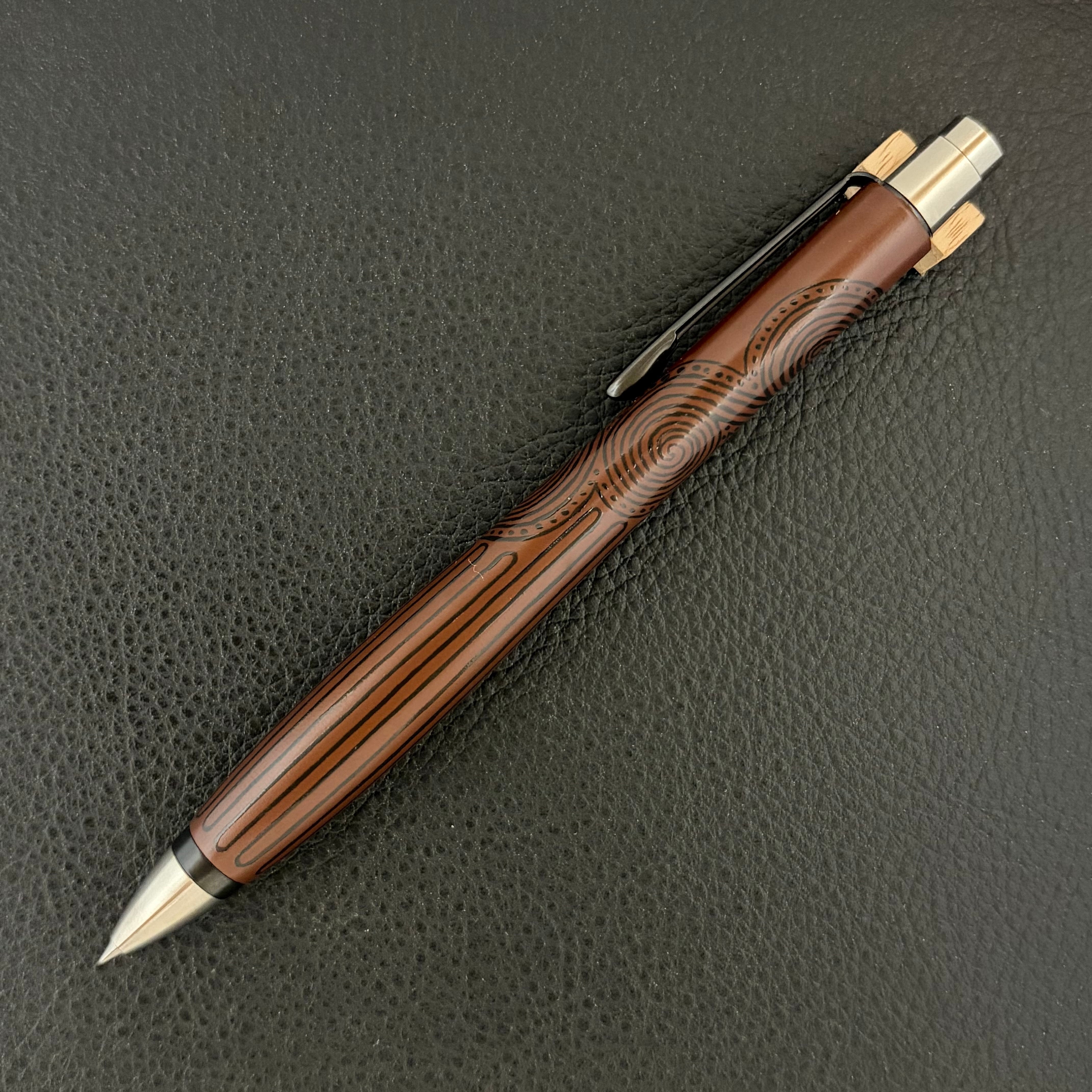 このペンに使った木は、職人が伐採し1年以上天然乾燥させた藪椿を使い、川から採取したバクテリアがつくる顔料「パイプ状ベンガラ」と国産漆を合わせて制作しています。