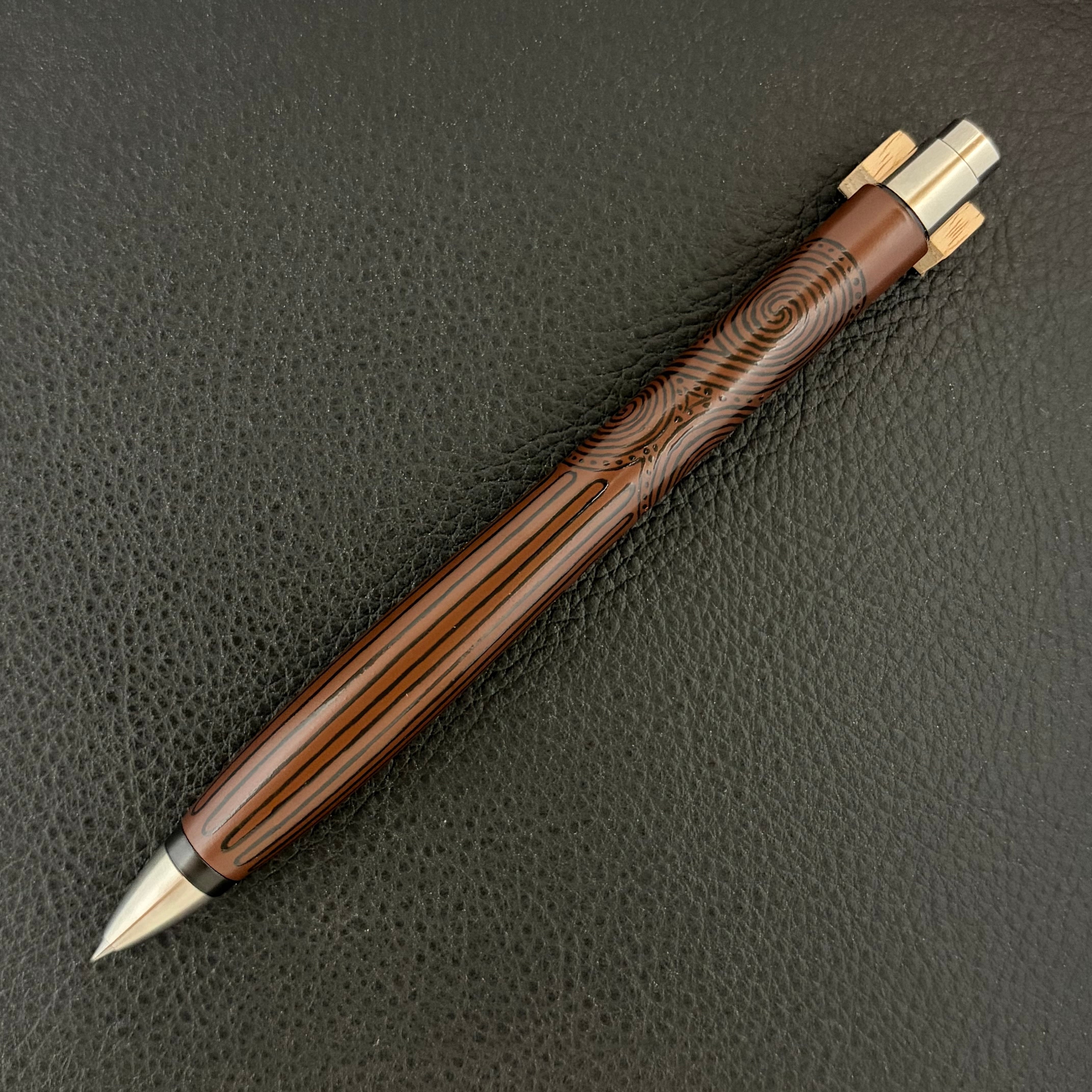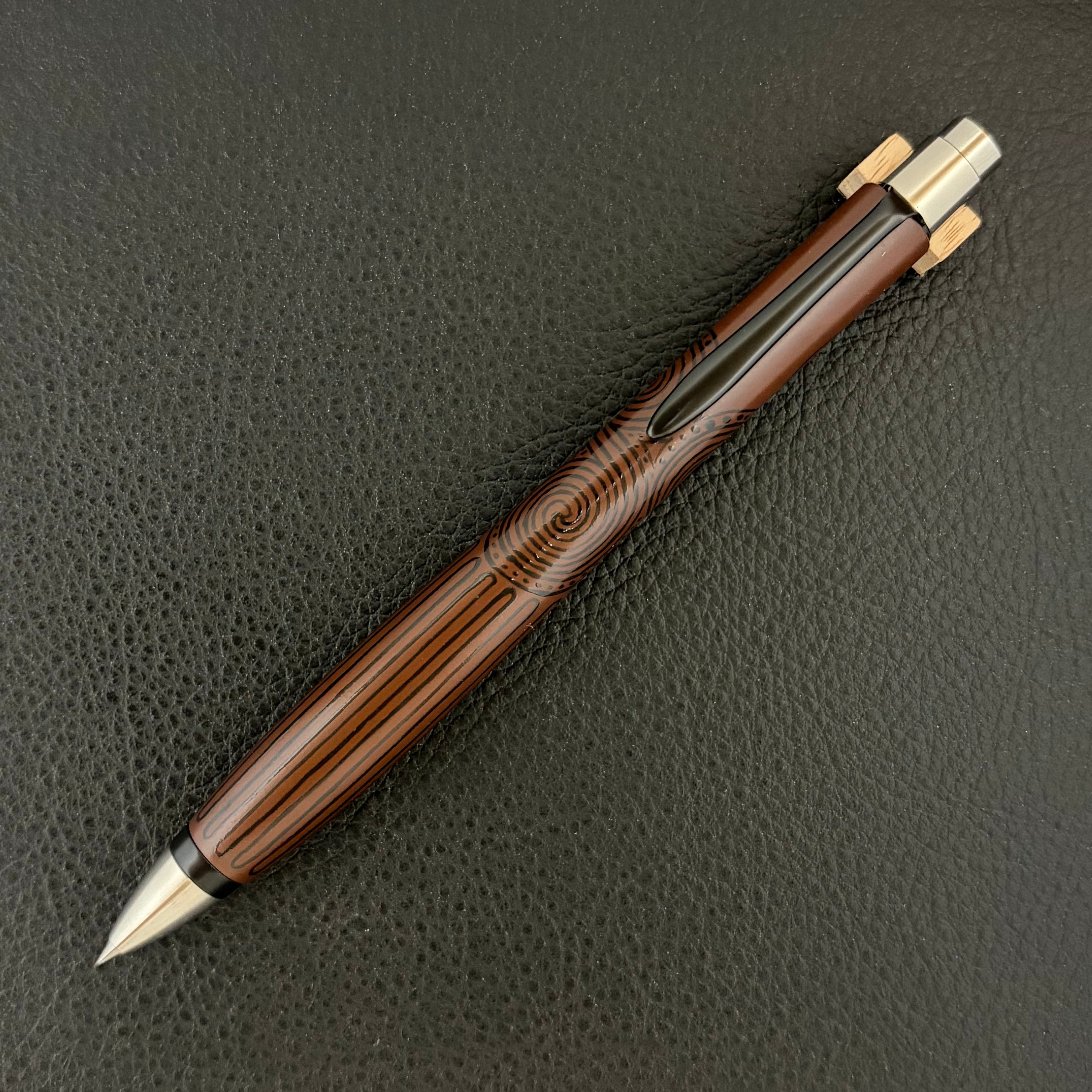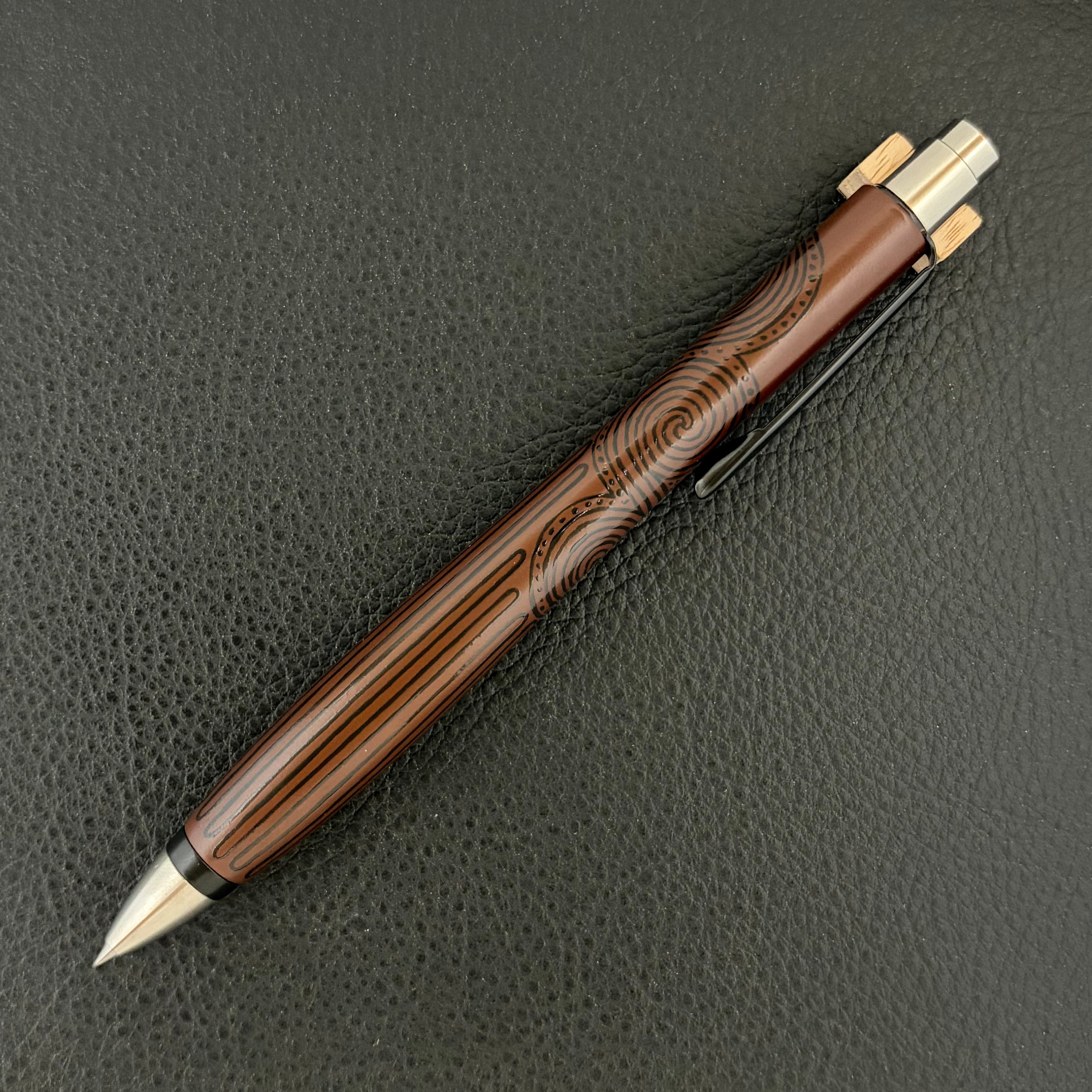 このペンに漆職人の手仕事により、縄文の黒漆を用いて丹念に縄文の文様を刻み上げました。