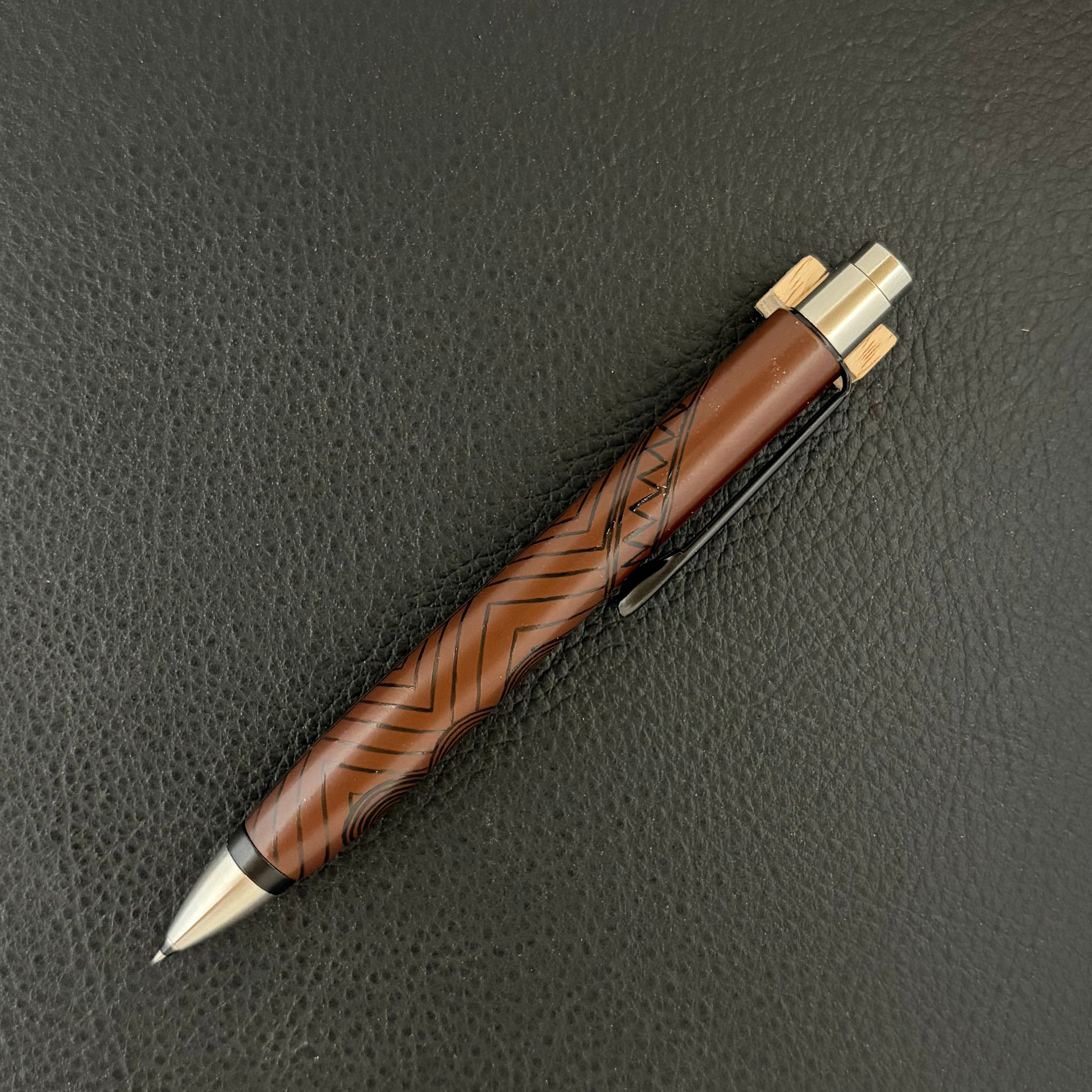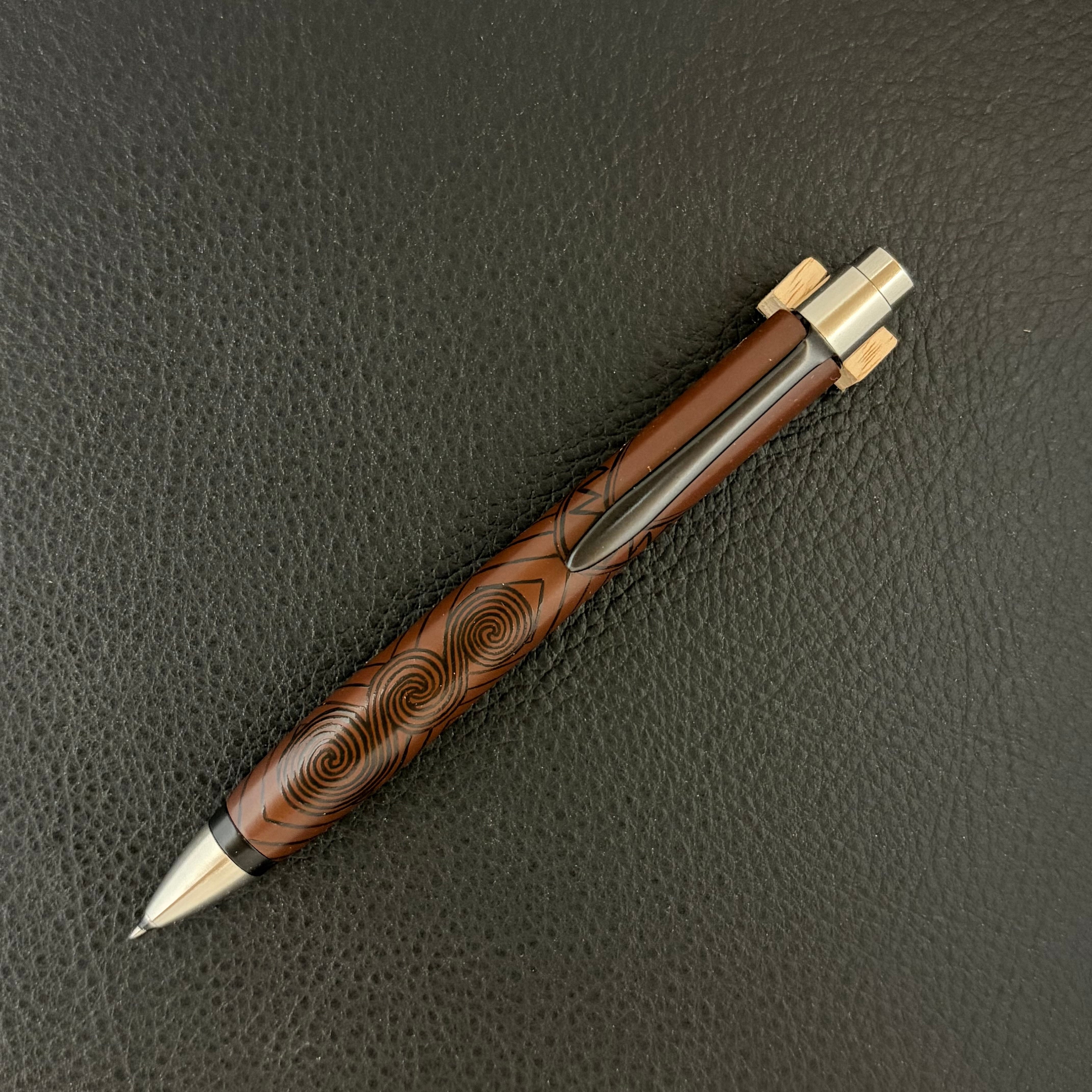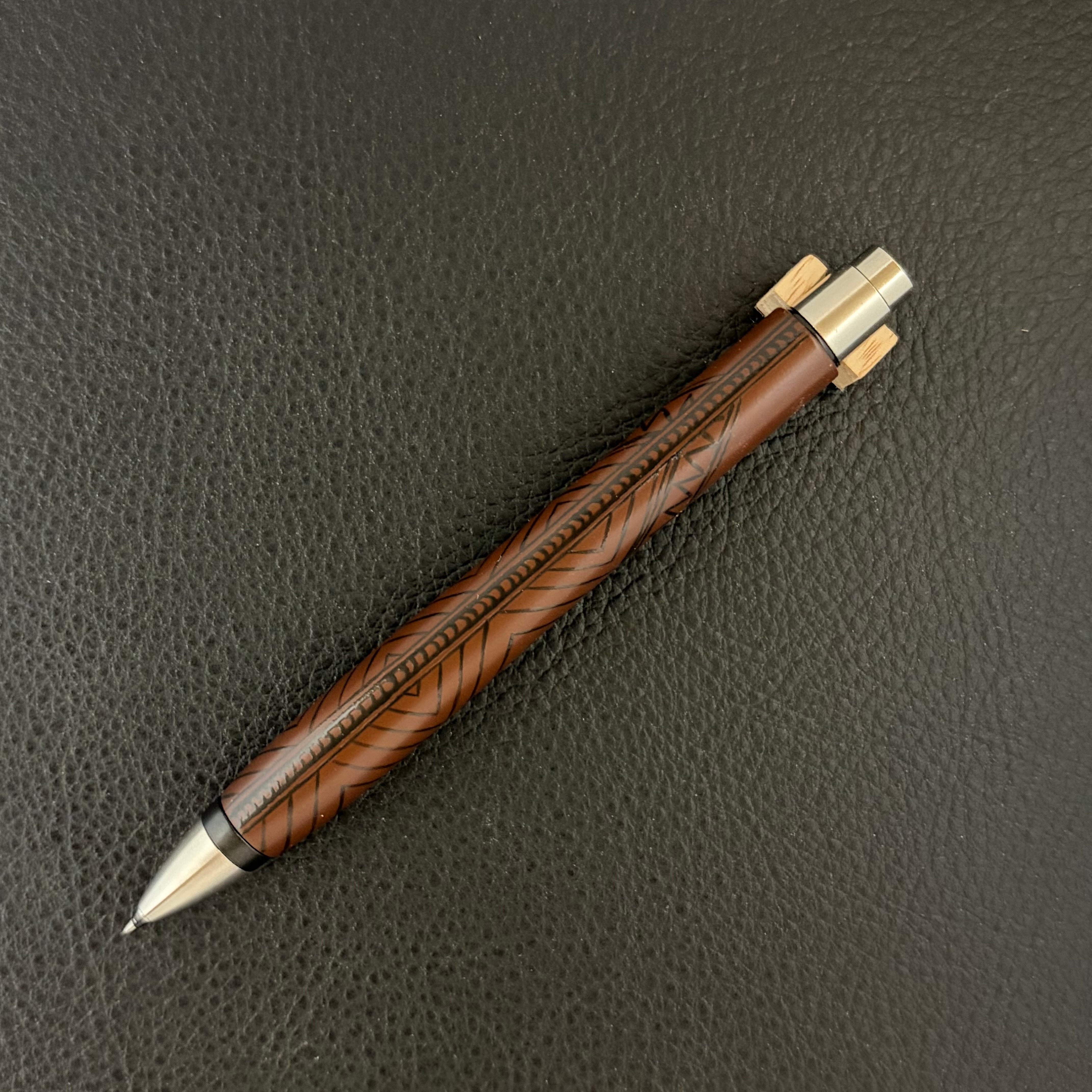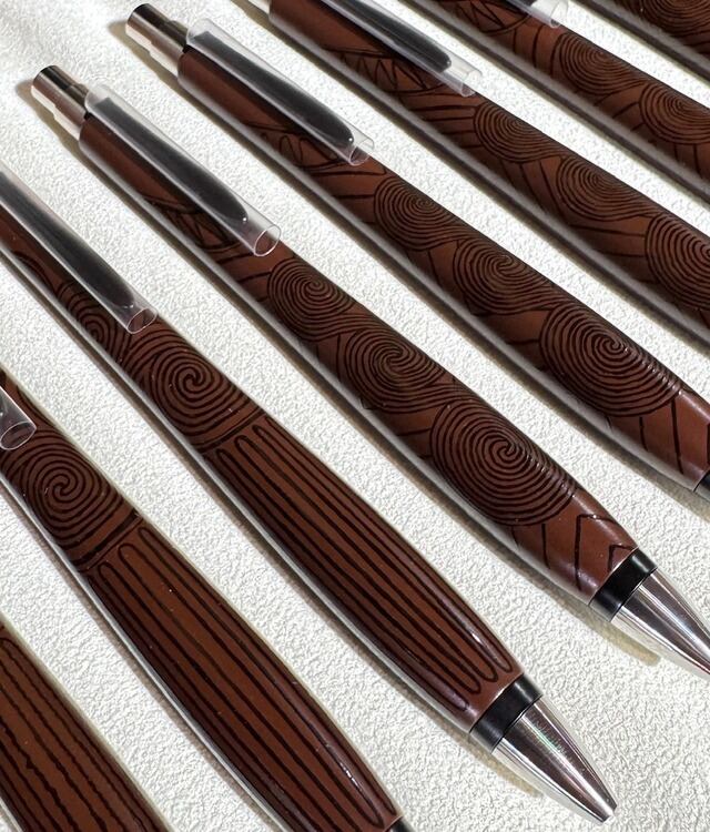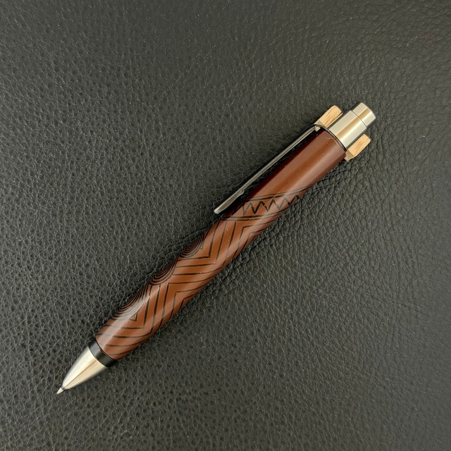 このペンに漆職人の手仕事により、縄文の黒漆を用いて丹念に縄文の文様を刻み上げました。
