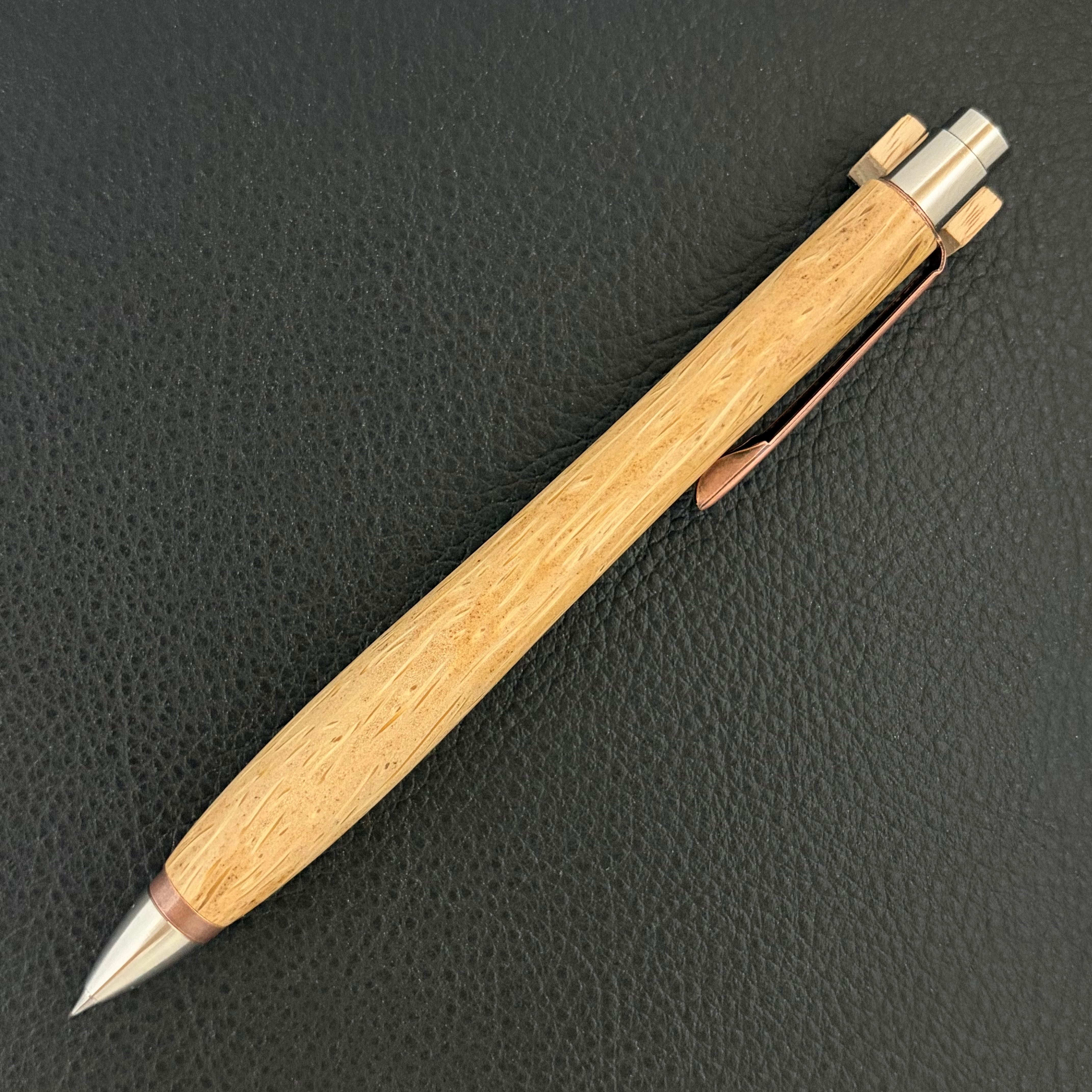 ボールペンのノックシステムは、ドイツ最高のクリックメカニズムを採用してあります。このメカニズムはユニークな機構のため、クリックしたときのカチカチ音が静かで、どんな場所でも気兼ねなく使うことができます。滑らかに動くこのプッシュ感覚を一度味わうと他には戻れなくなってしまうほどの魅力があります。 100分の1単位の加工精度で削り出されたペン先は、軸ブレも全くありません。