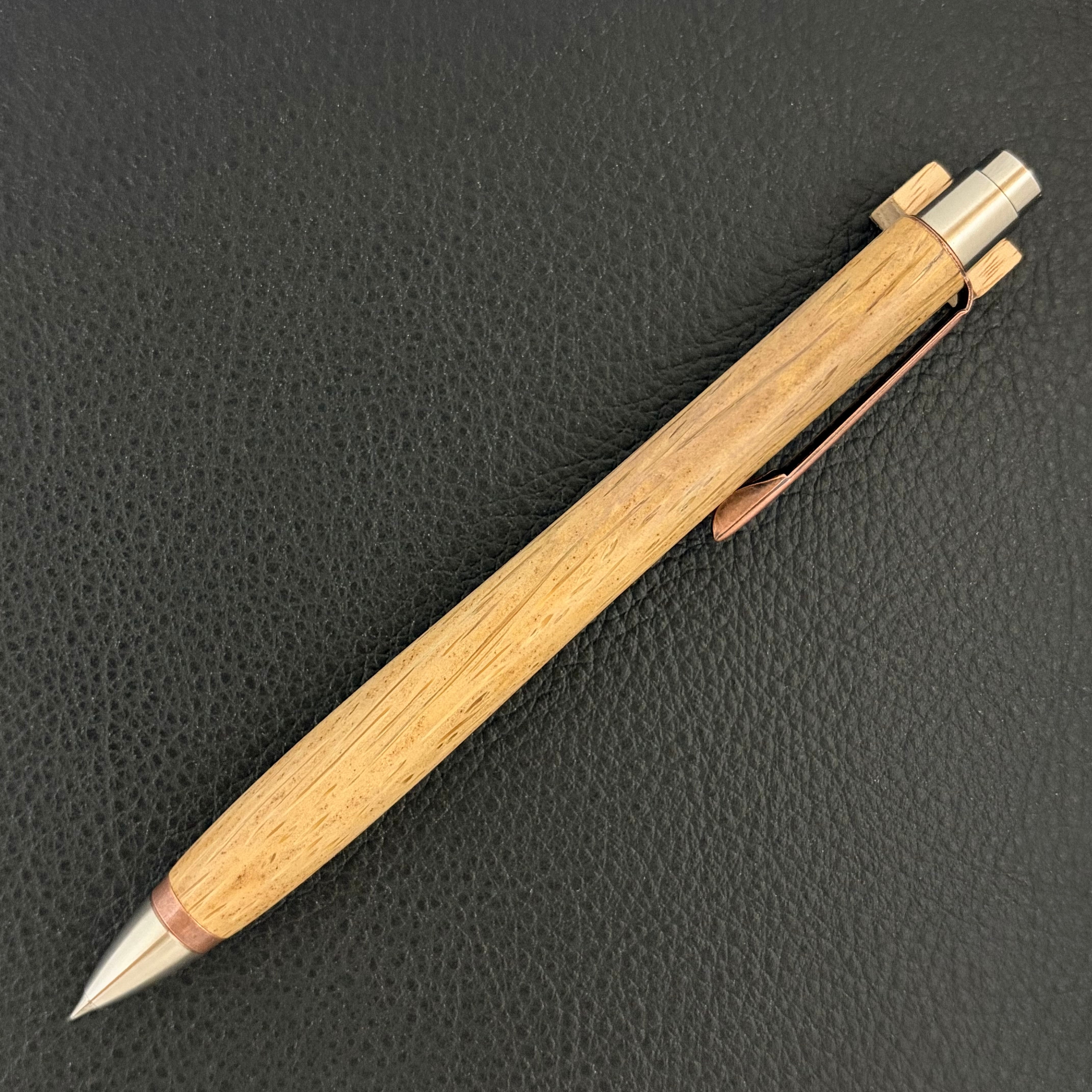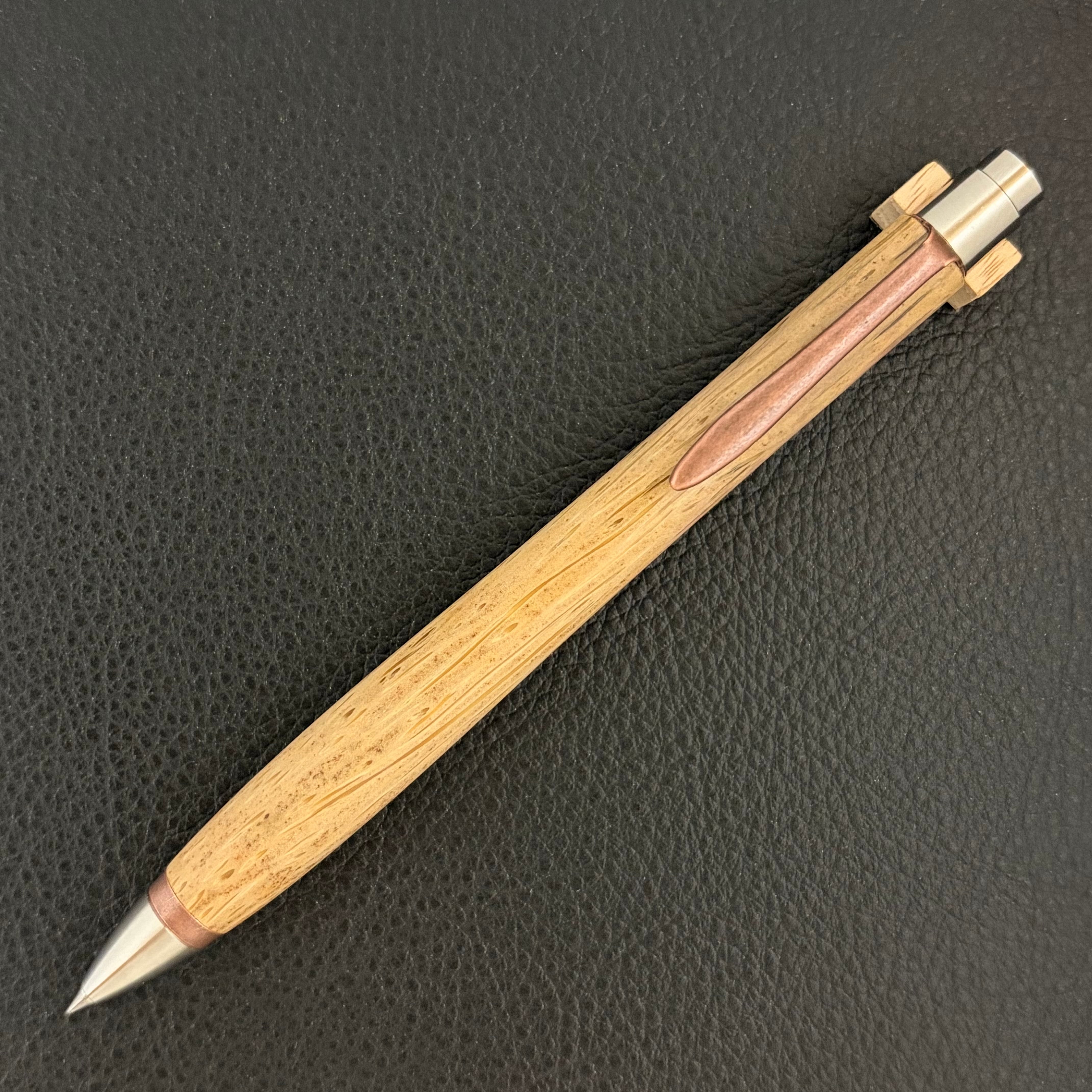 ボールペンのノックシステムは、ドイツ最高のクリックメカニズムを採用してあります。このメカニズムはユニークな機構のため、クリックしたときのカチカチ音が静かで、どんな場所でも気兼ねなく使うことができます。滑らかに動くこのプッシュ感覚を一度味わうと他には戻れなくなってしまうほどの魅力があります。 100分の1単位の加工精度で削り出されたペン先は、軸ブレも全くありません。