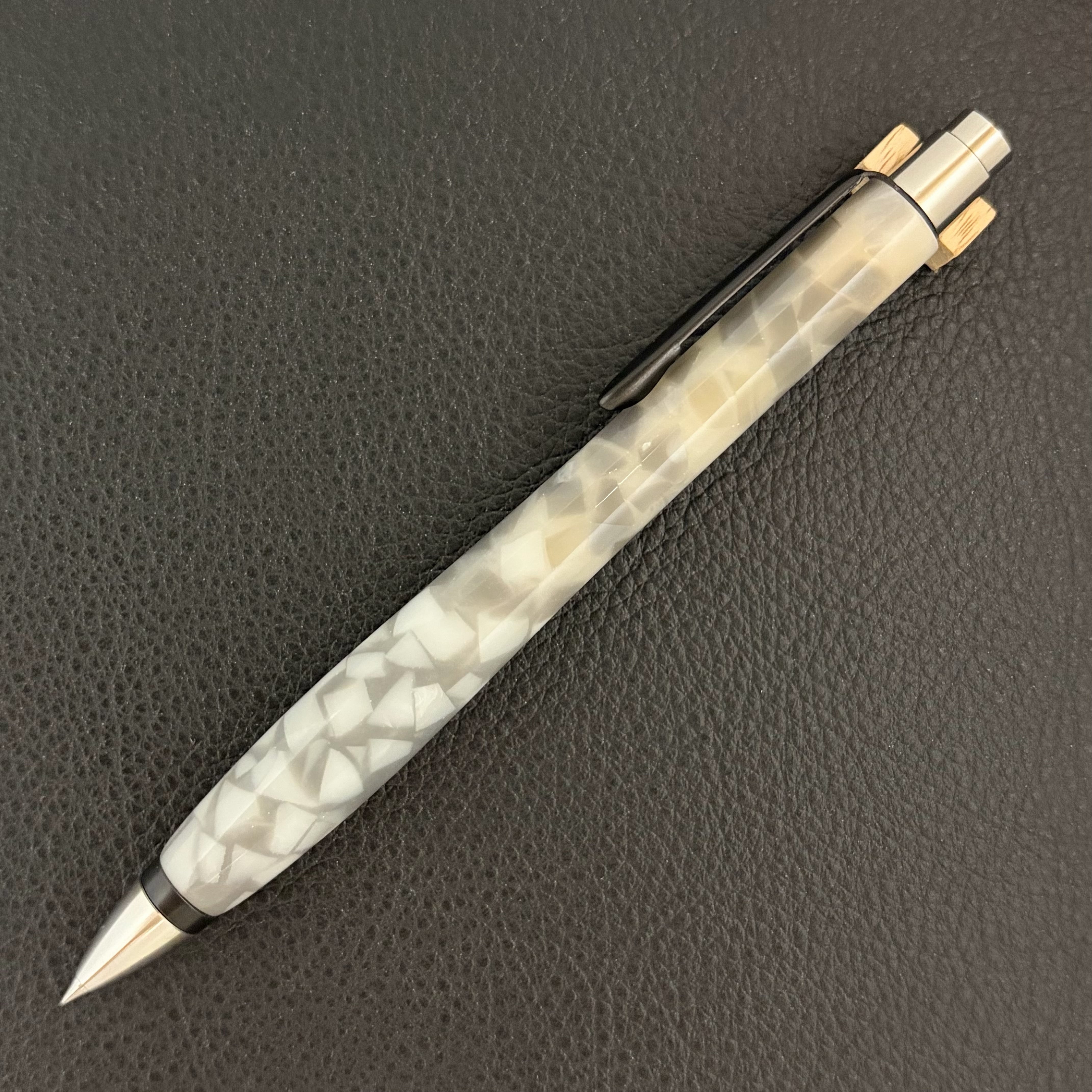 ボールペンのノックシステムは、ドイツ最高のクリックメカニズムを採用してあります。このメカニズムはユニークな機構のため、クリックしたときのカチカチ音が静かで、どんな場所でも気兼ねなく使うことができます。滑らかに動くこのプッシュ感覚を一度味わうと他には戻れなくなってしまうほどの魅力があります。 100分の1単位の加工精度で削り出されたペン先は、軸ブレも全くありません。