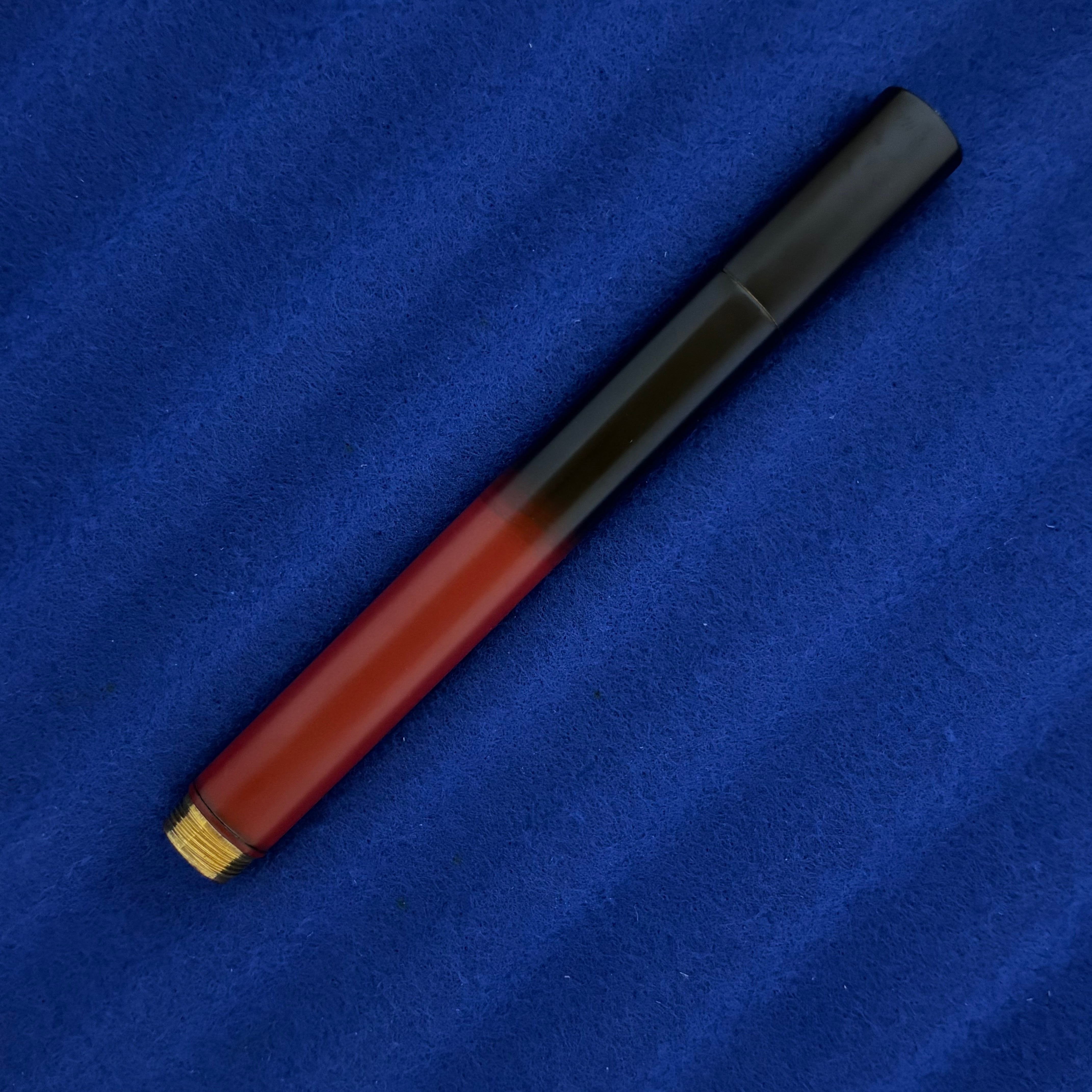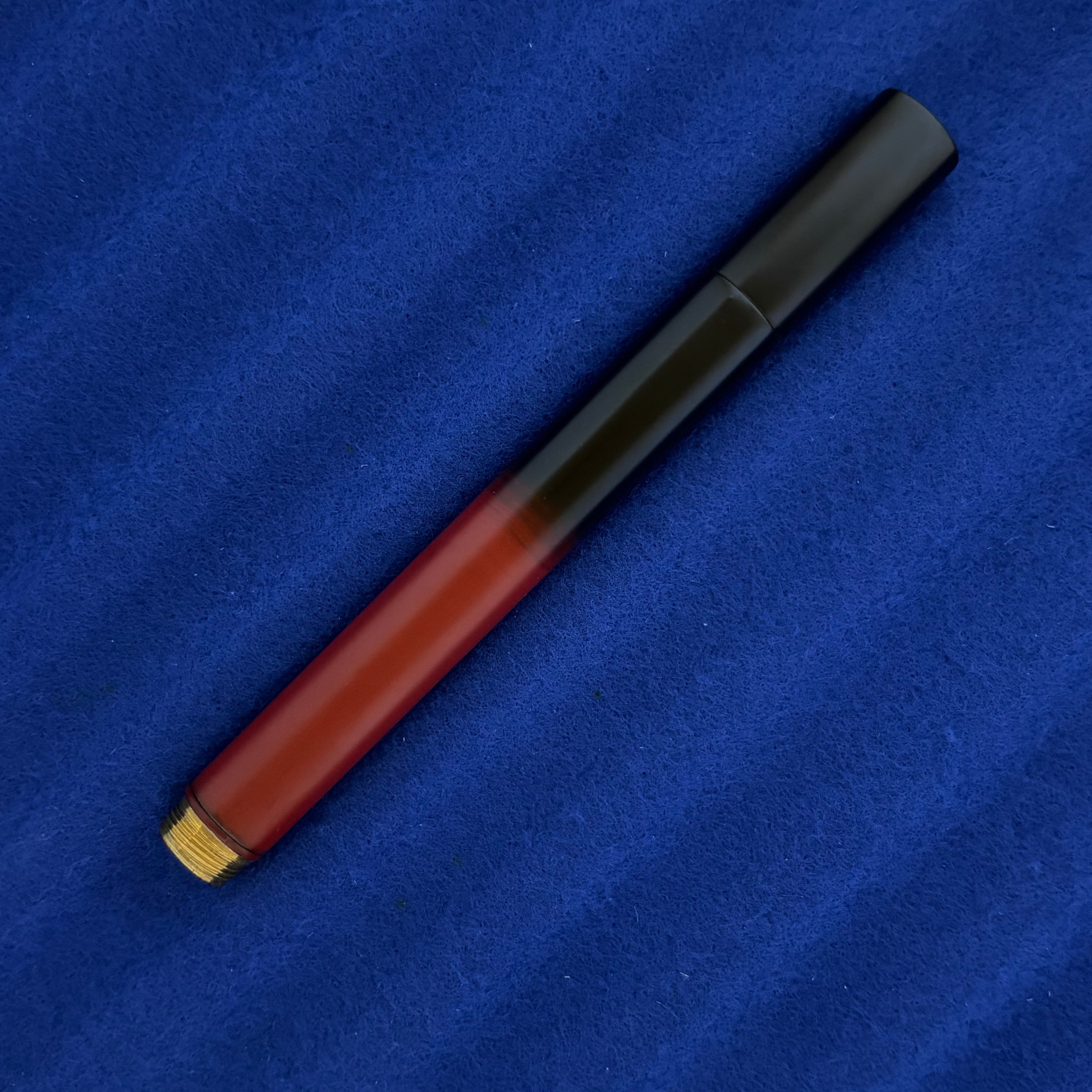 ・金属と漆の組合せに初挑戦したペンです。真鍮を加工した金属ペンに、黒漆と朱漆の2色に塗り分けて境界部分をぼかすことにより曙陽を表現したぼかし塗り作品です。