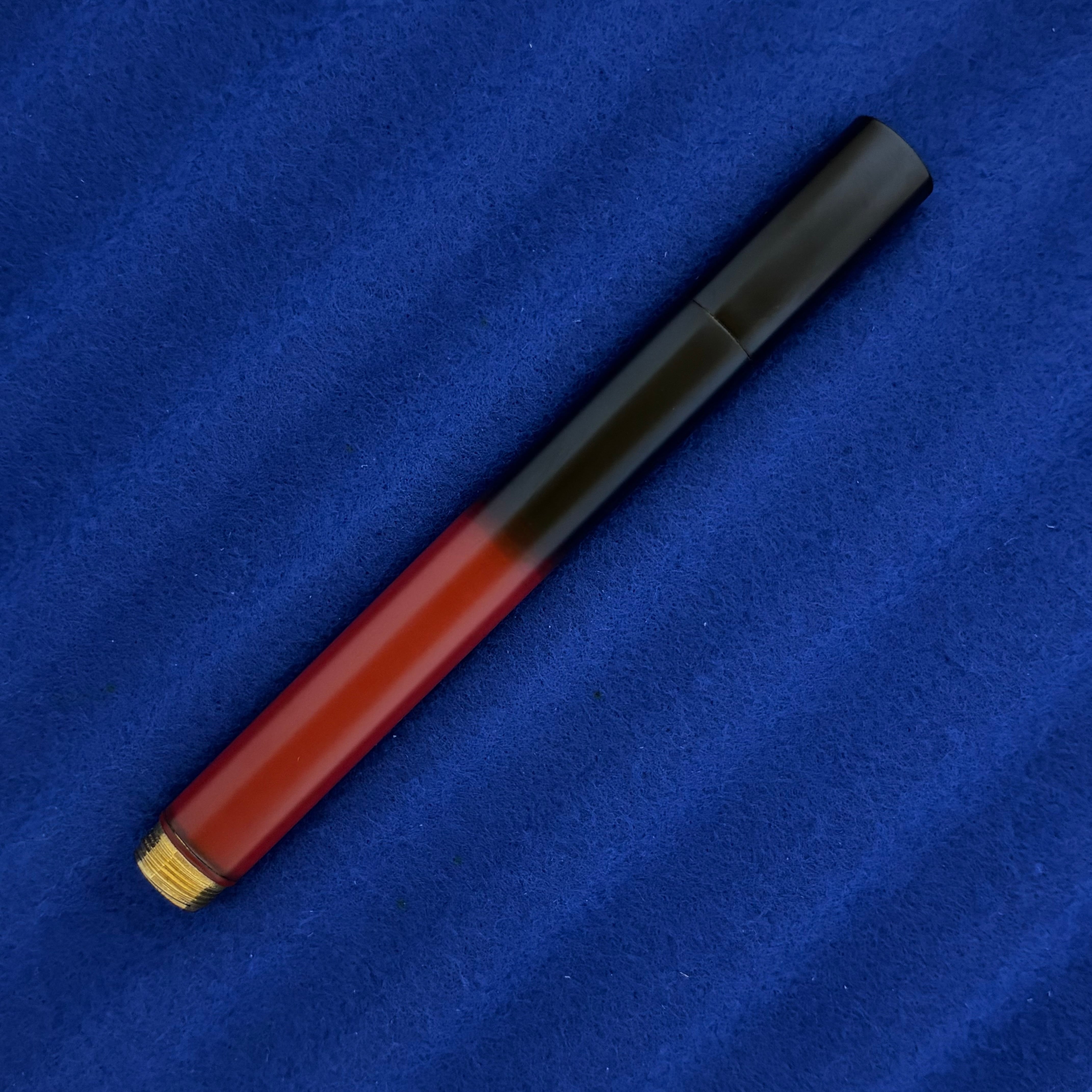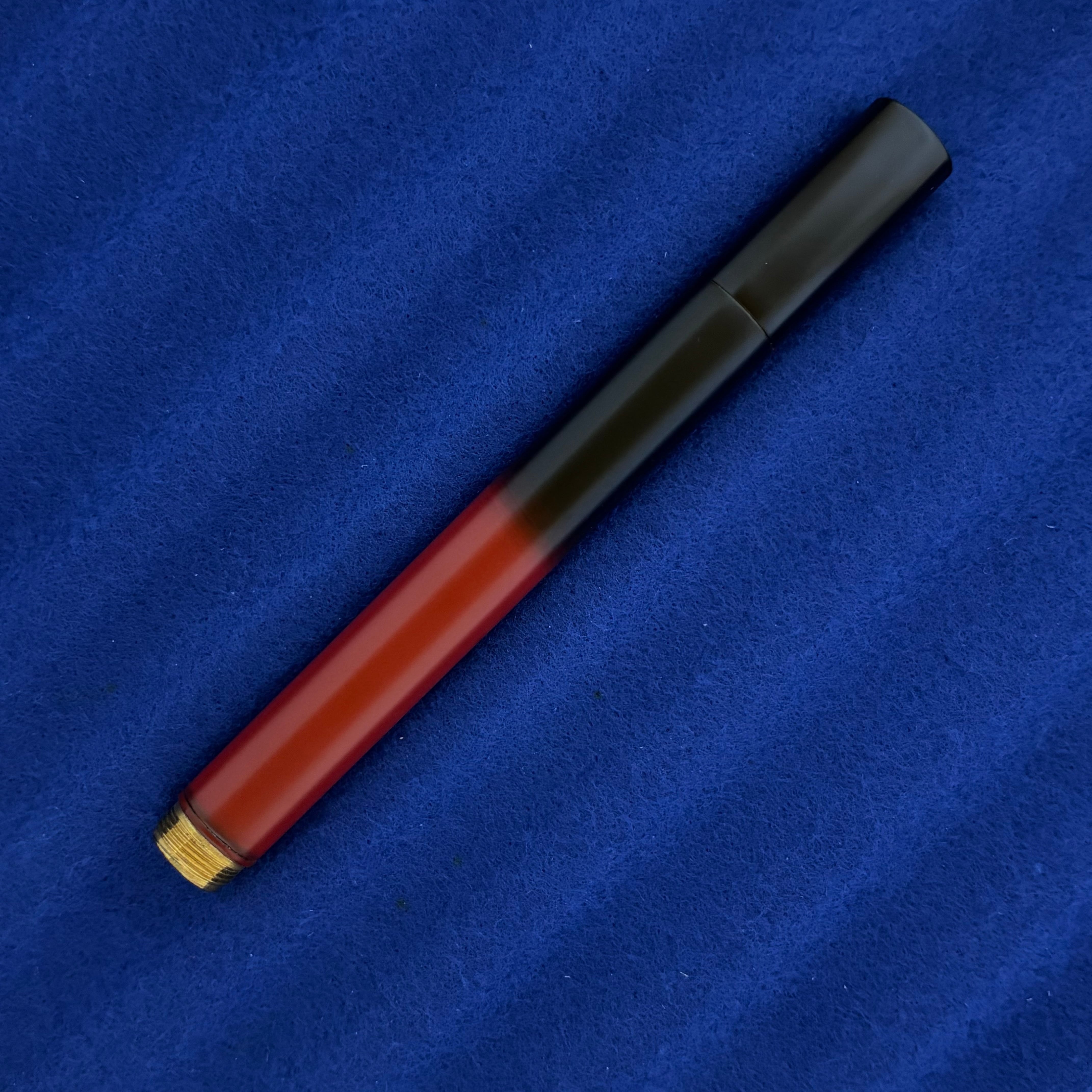 ・金属と漆の組合せに初挑戦したペンです。真鍮を加工した金属ペンに、黒漆と朱漆の2色に塗り分けて境界部分をぼかすことにより曙陽を表現したぼかし塗り作品です。