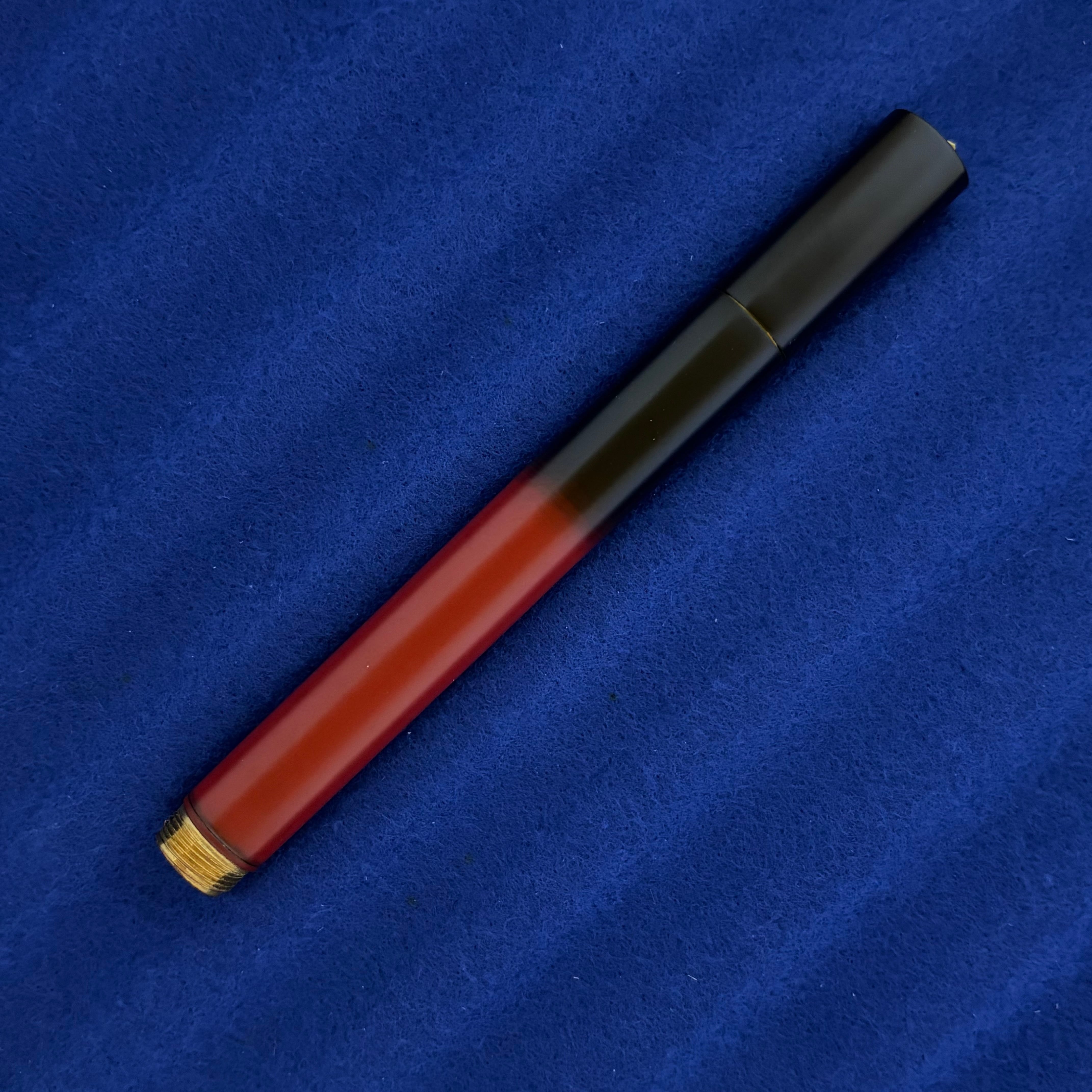 ・金属と漆の組合せに初挑戦したペンです。真鍮を加工した金属ペンに、黒漆と朱漆の2色に塗り分けて境界部分をぼかすことにより曙陽を表現したぼかし塗り作品です。