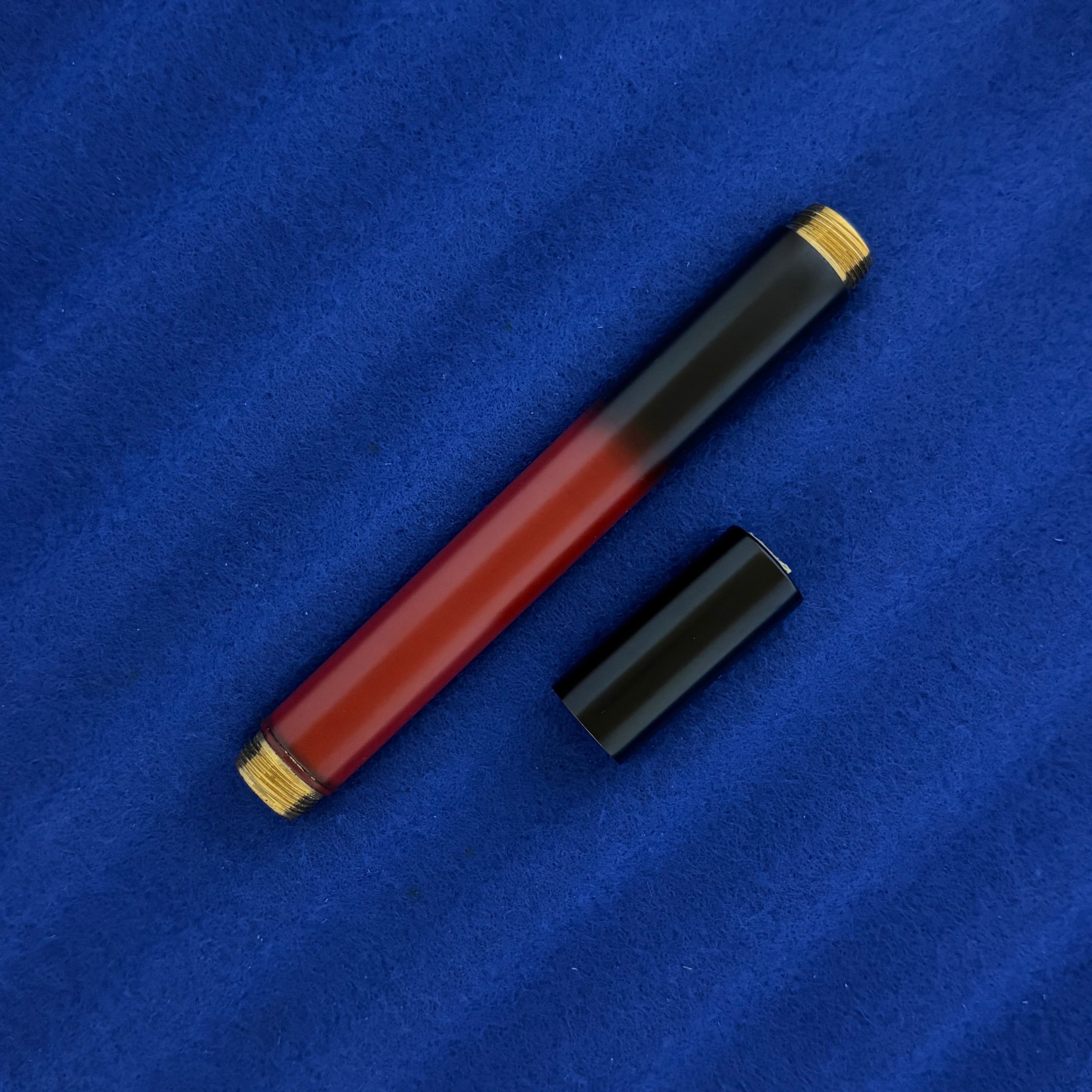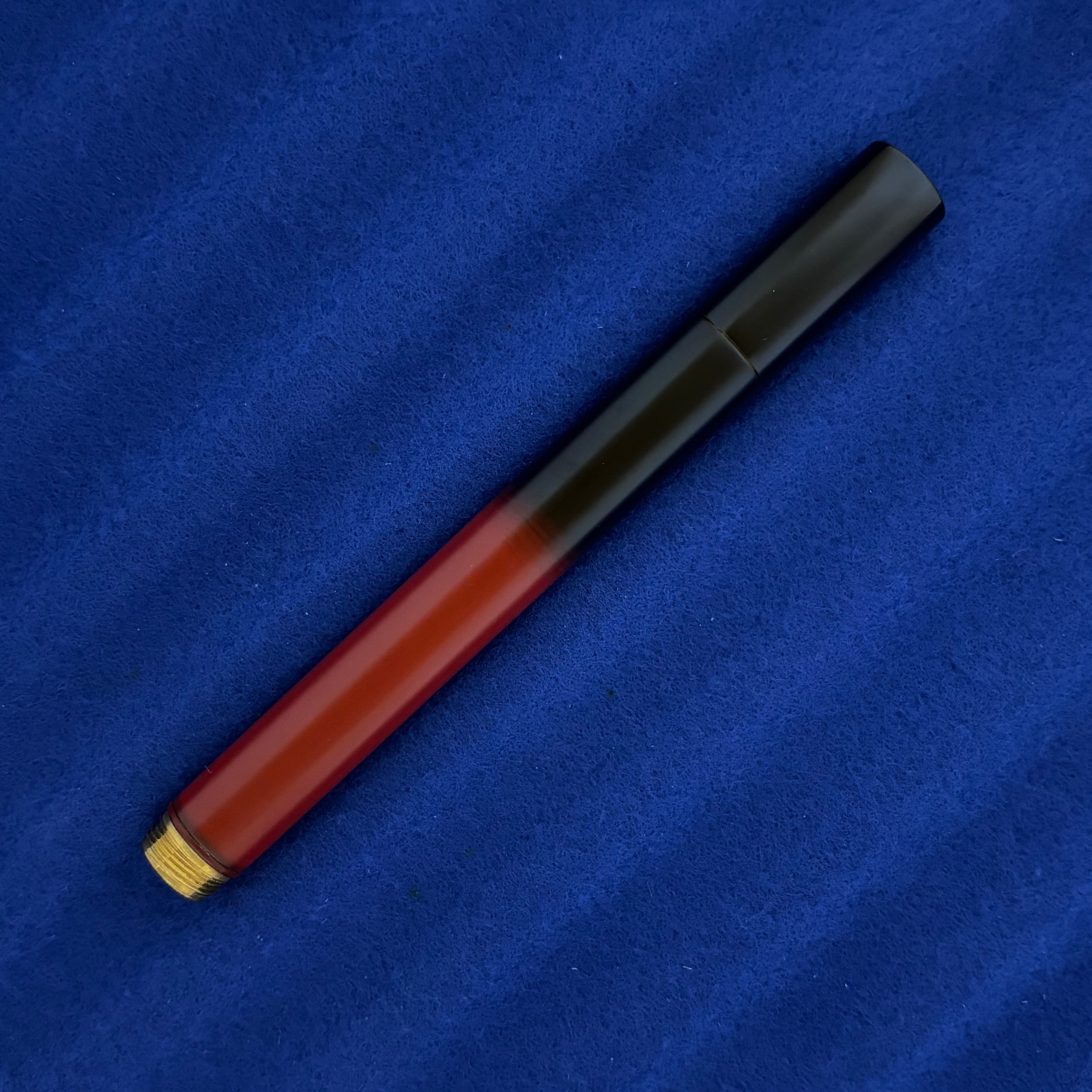 ・金属と漆の組合せに初挑戦したペンです。真鍮を加工した金属ペンに、黒漆と朱漆の2色に塗り分けて境界部分をぼかすことにより曙陽を表現したぼかし塗り作品です。