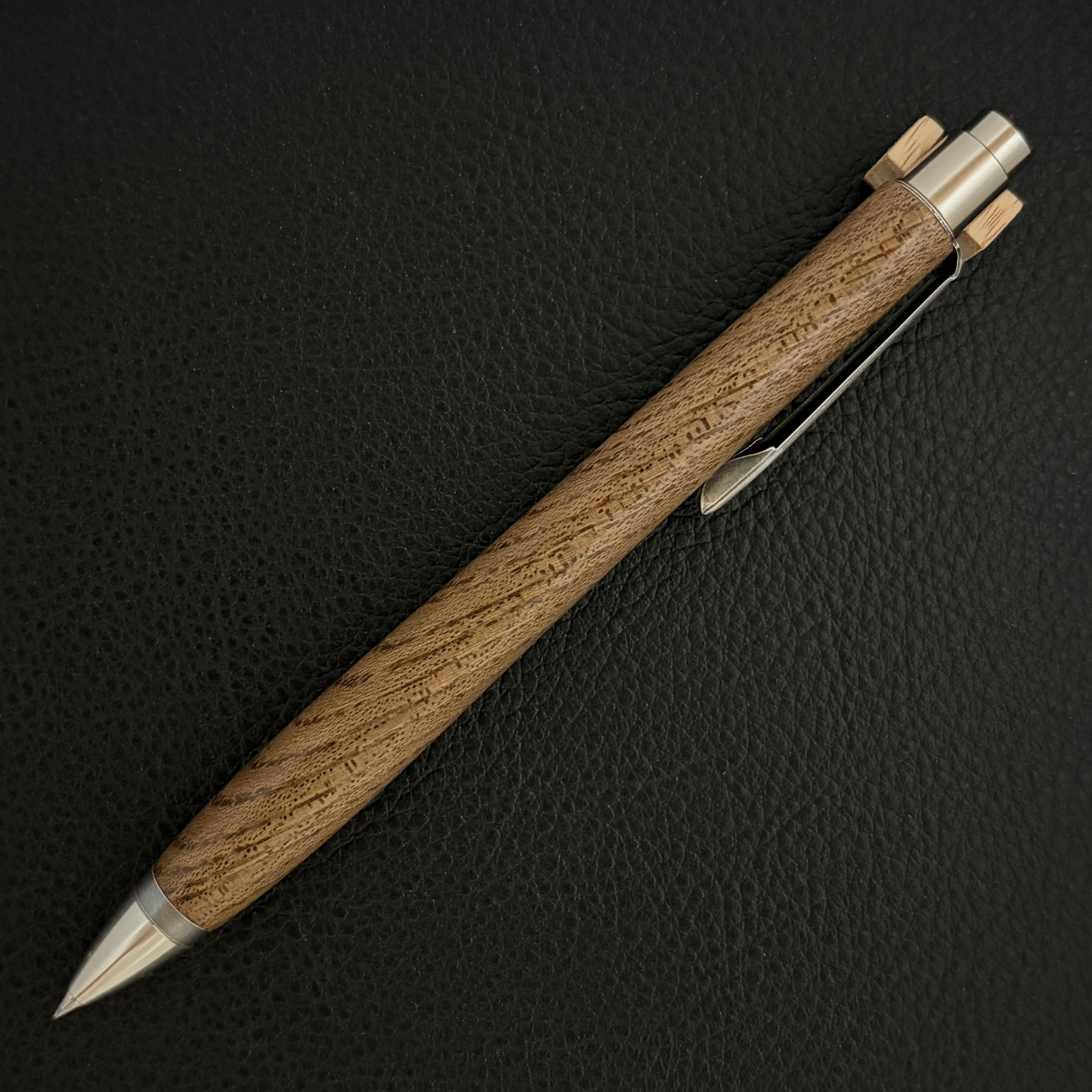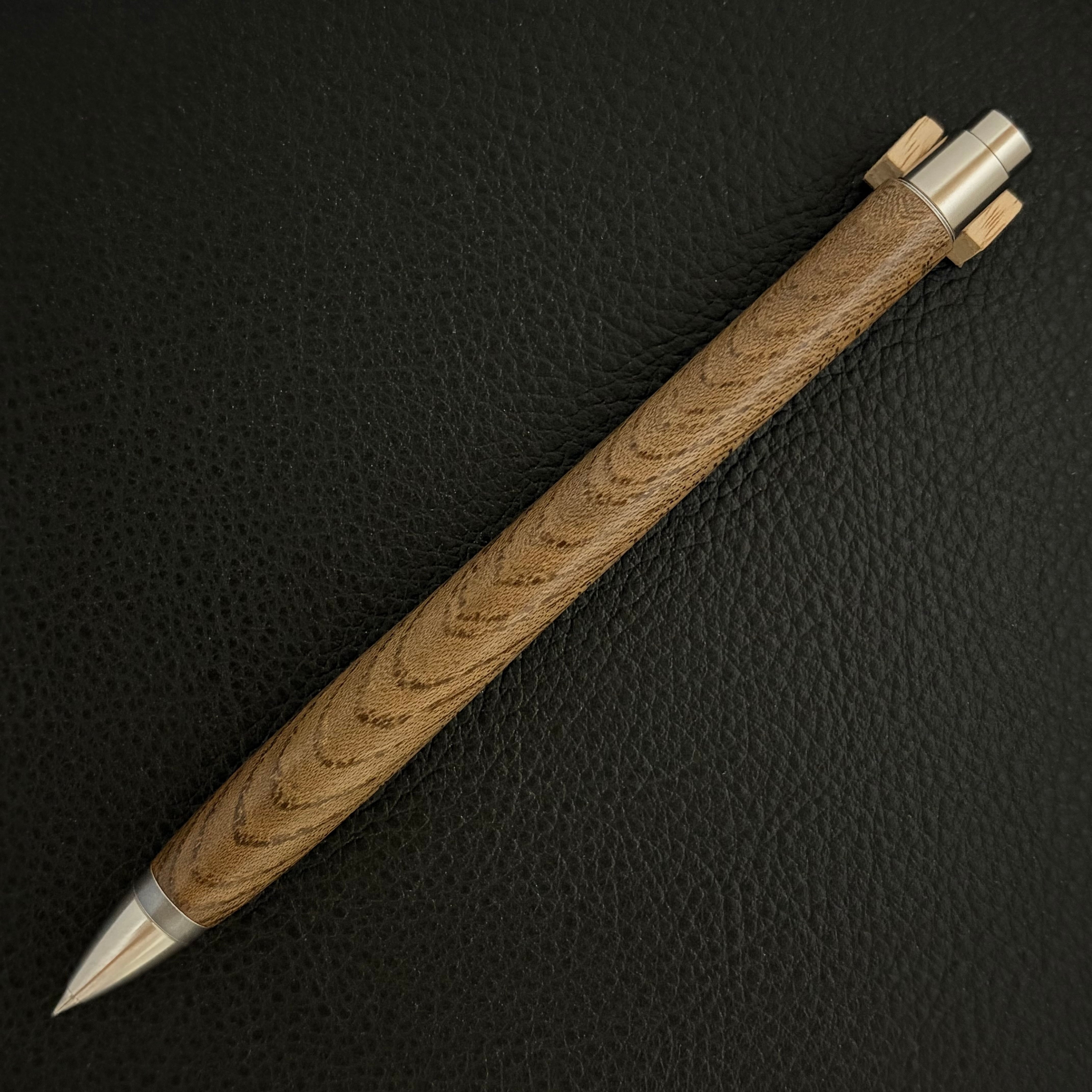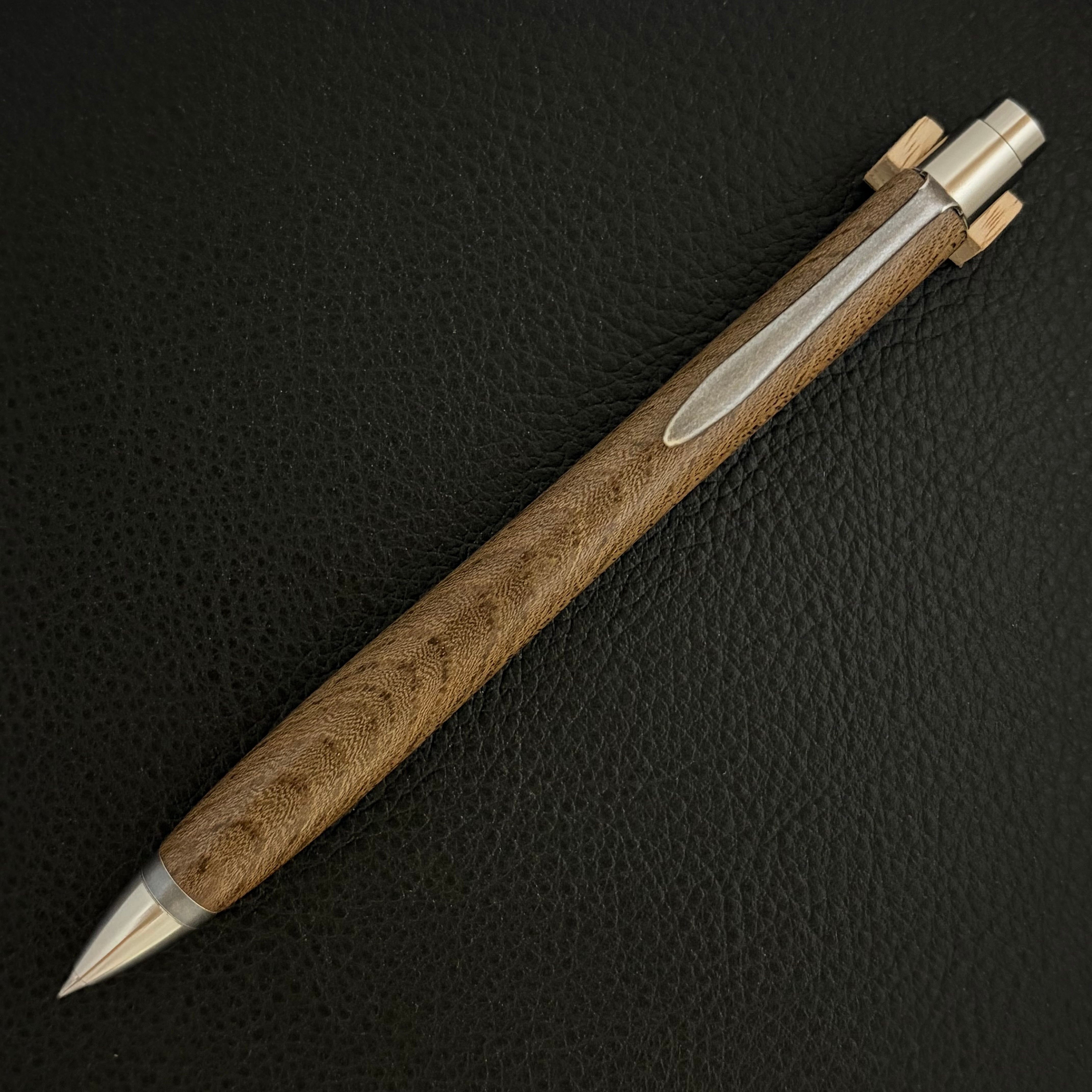 ボールペンのノックシステムは、ドイツ最高のクリックメカニズムを採用してあります。このメカニズムはユニークな機構のため、クリックしたときのカチカチ音が静かで、どんな場所でも気兼ねなく使うことができます。滑らかに動くこのプッシュ感覚を一度味わうと他には戻れなくなってしまうほどの魅力があります。 100分の1単位の加工精度で削り出されたペン先は、軸ブレも全くありません。