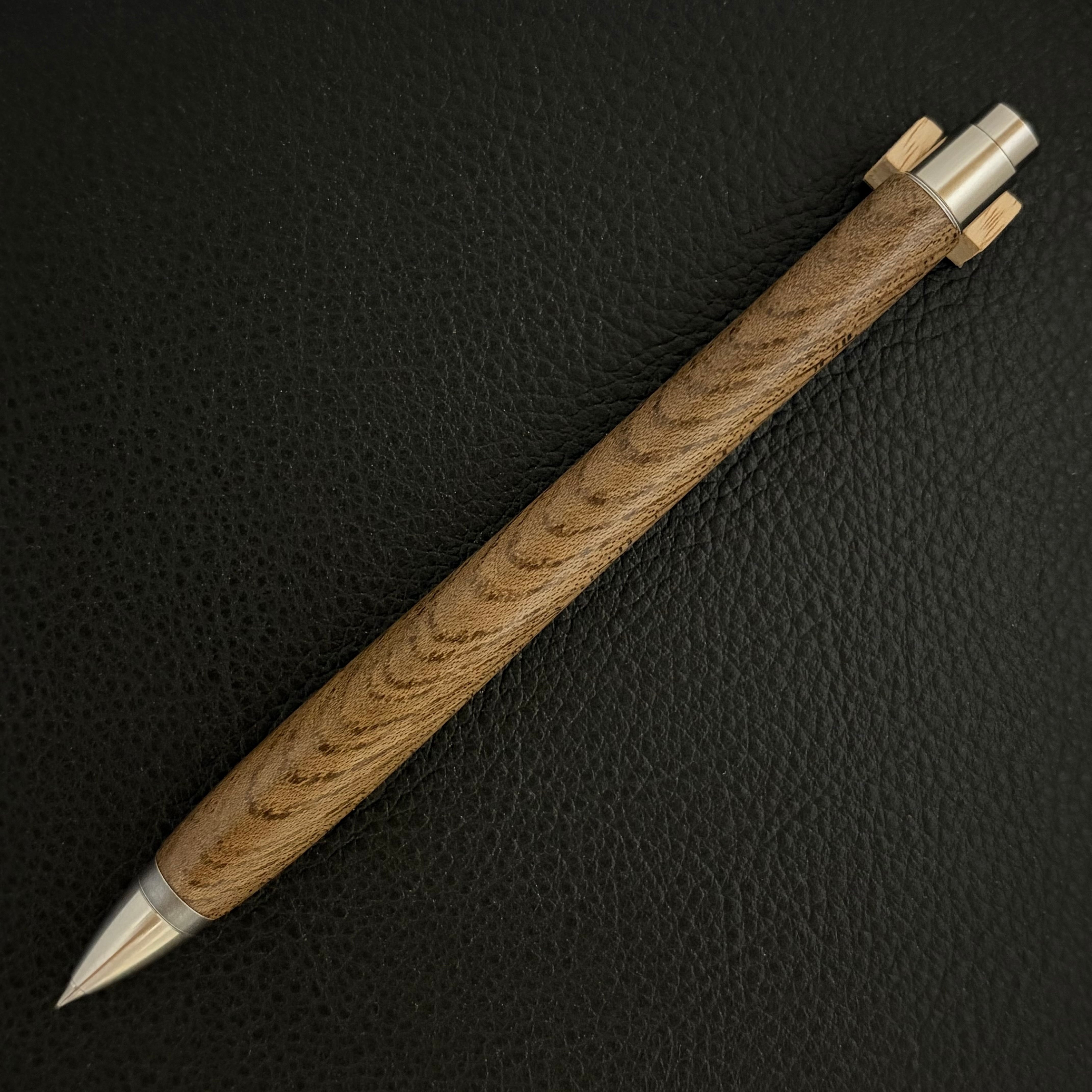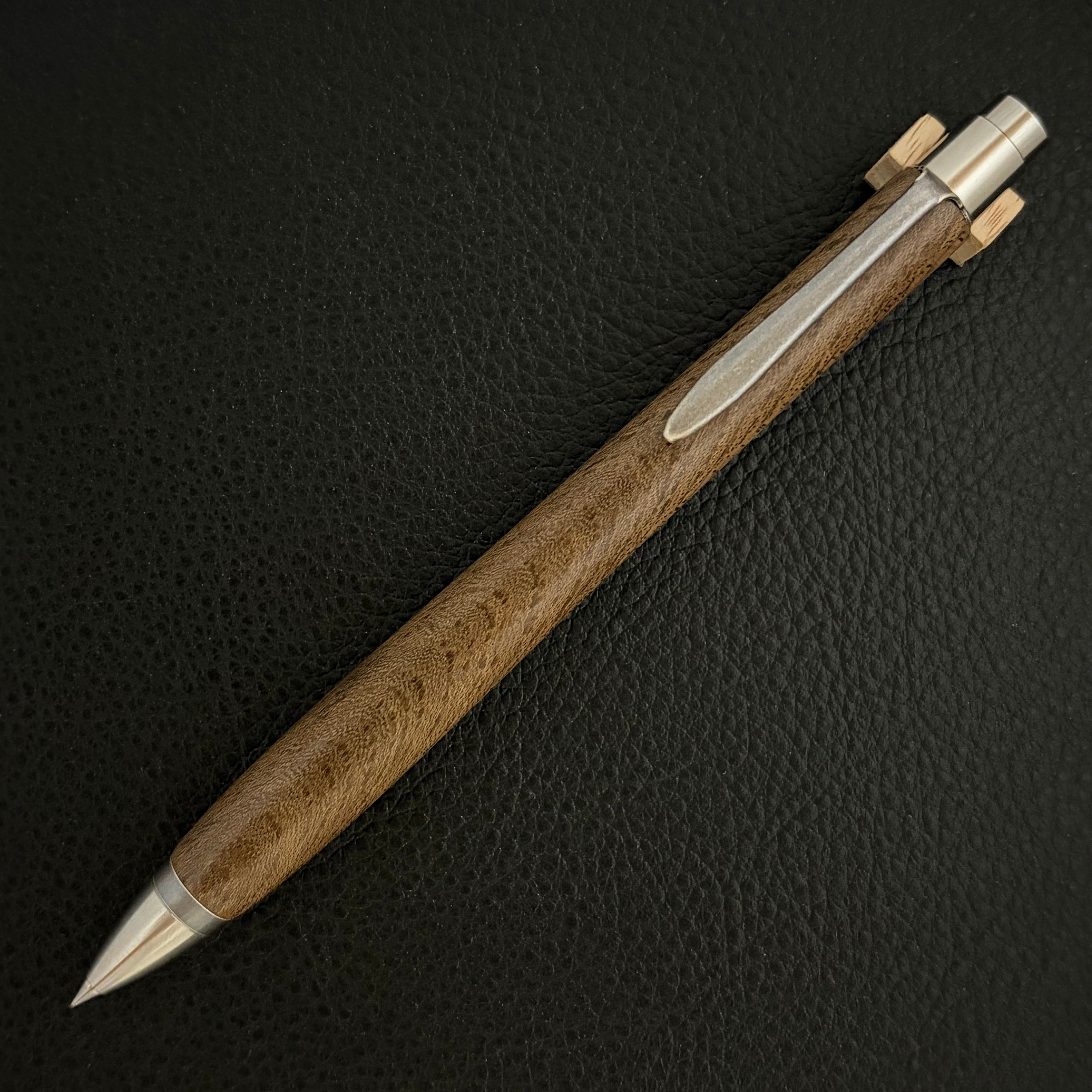 ボールペンのノックシステムは、ドイツ最高のクリックメカニズムを採用してあります。このメカニズムはユニークな機構のため、クリックしたときのカチカチ音が静かで、どんな場所でも気兼ねなく使うことができます。滑らかに動くこのプッシュ感覚を一度味わうと他には戻れなくなってしまうほどの魅力があります。 100分の1単位の加工精度で削り出されたペン先は、軸ブレも全くありません。