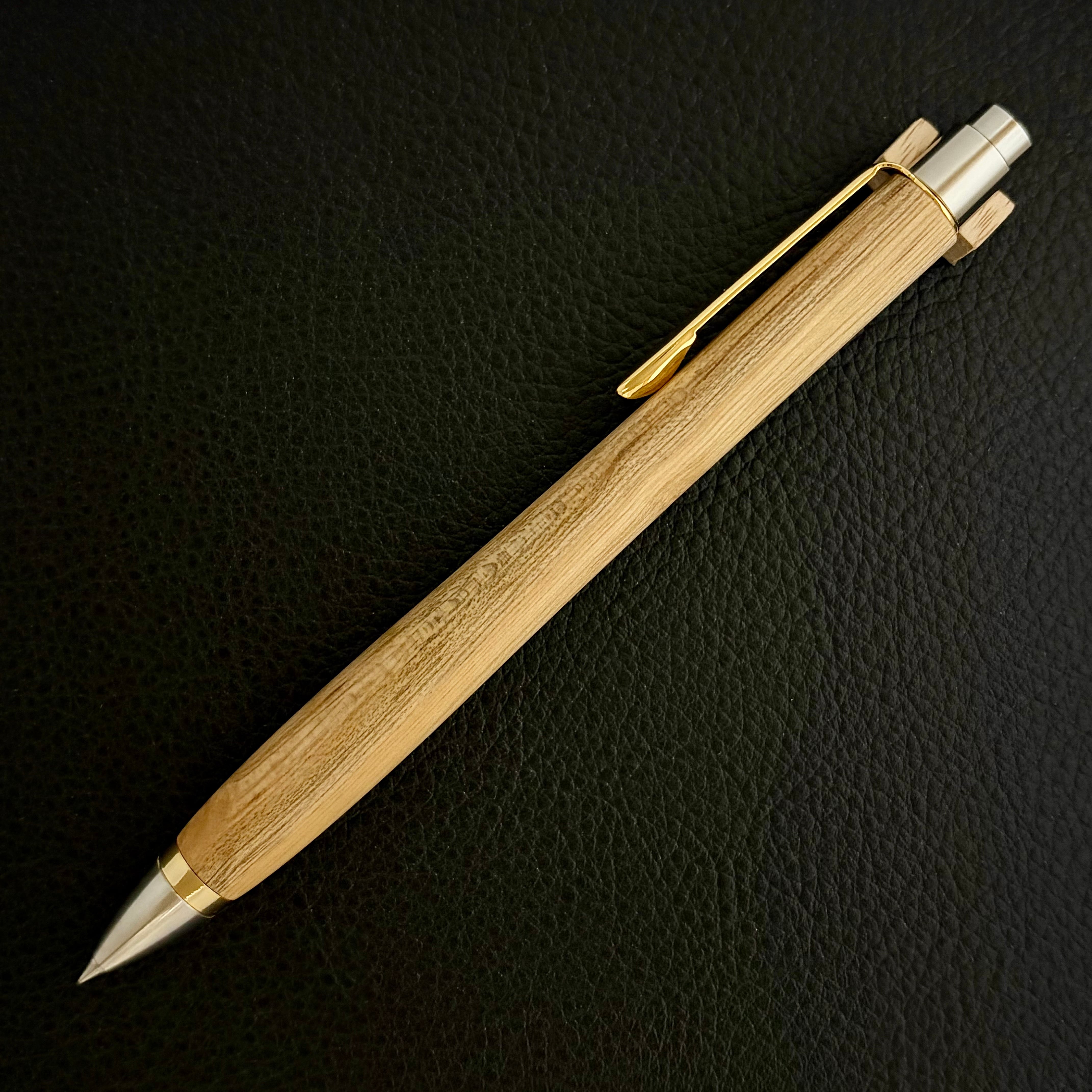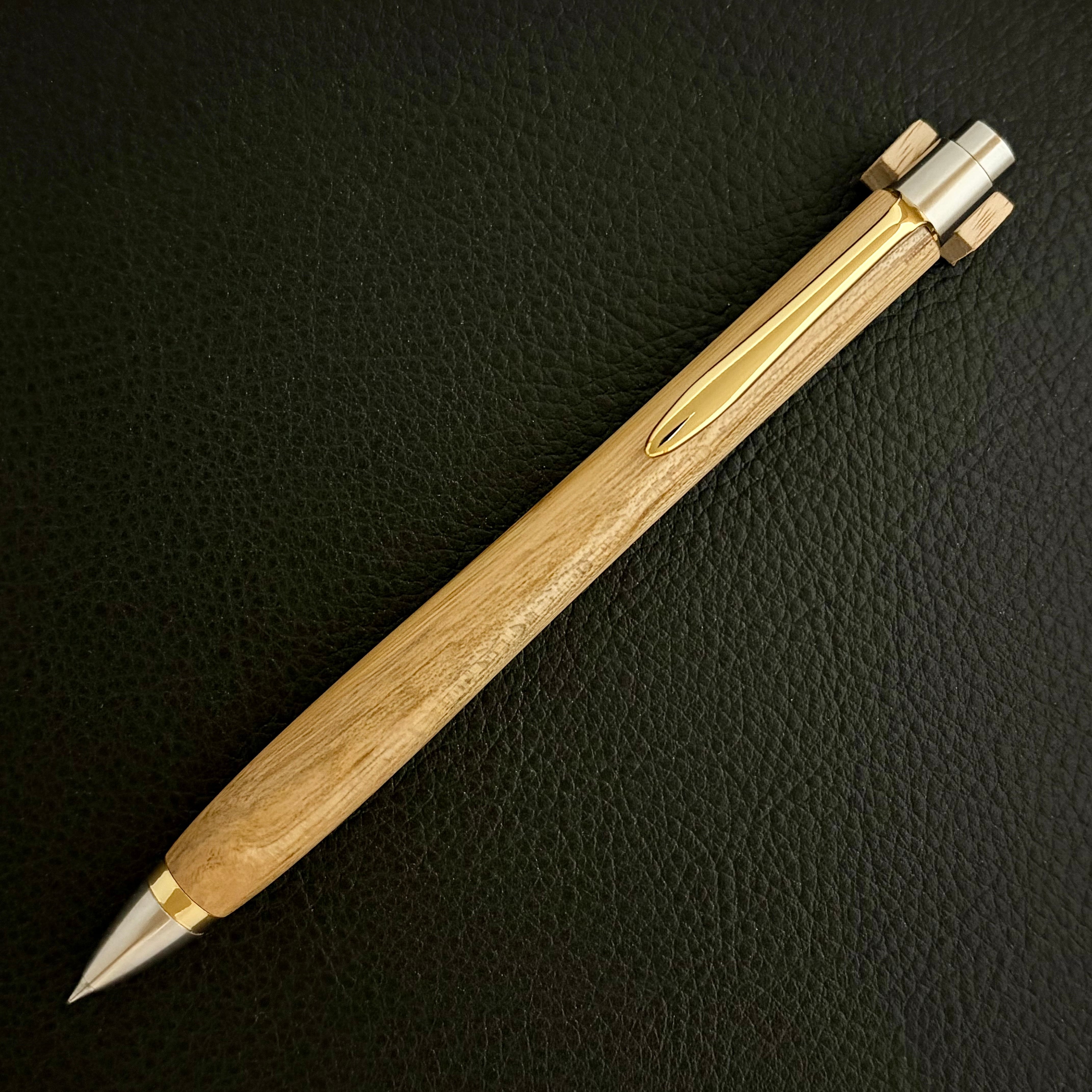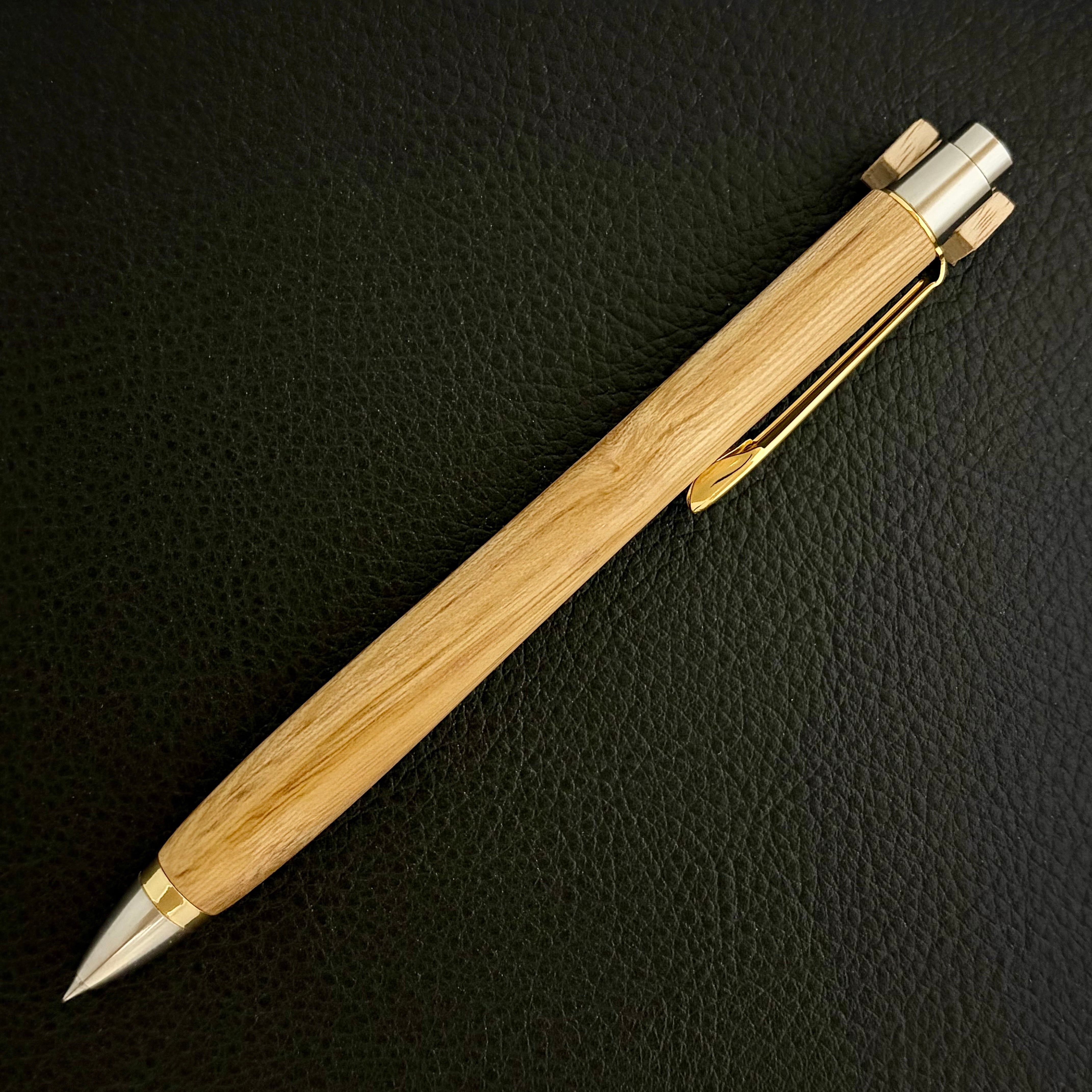 ボールペンのノックシステムは、ドイツ最高のクリックメカニズムを採用してあります。このメカニズムはユニークな機構のため、クリックしたときのカチカチ音が静かで、どんな場所でも気兼ねなく使うことができます。滑らかに動くこのプッシュ感覚を一度味わうと他には戻れなくなってしまうほどの魅力があります。 100分の1単位の加工精度で削り出されたペン先は、軸ブレも全くありません。