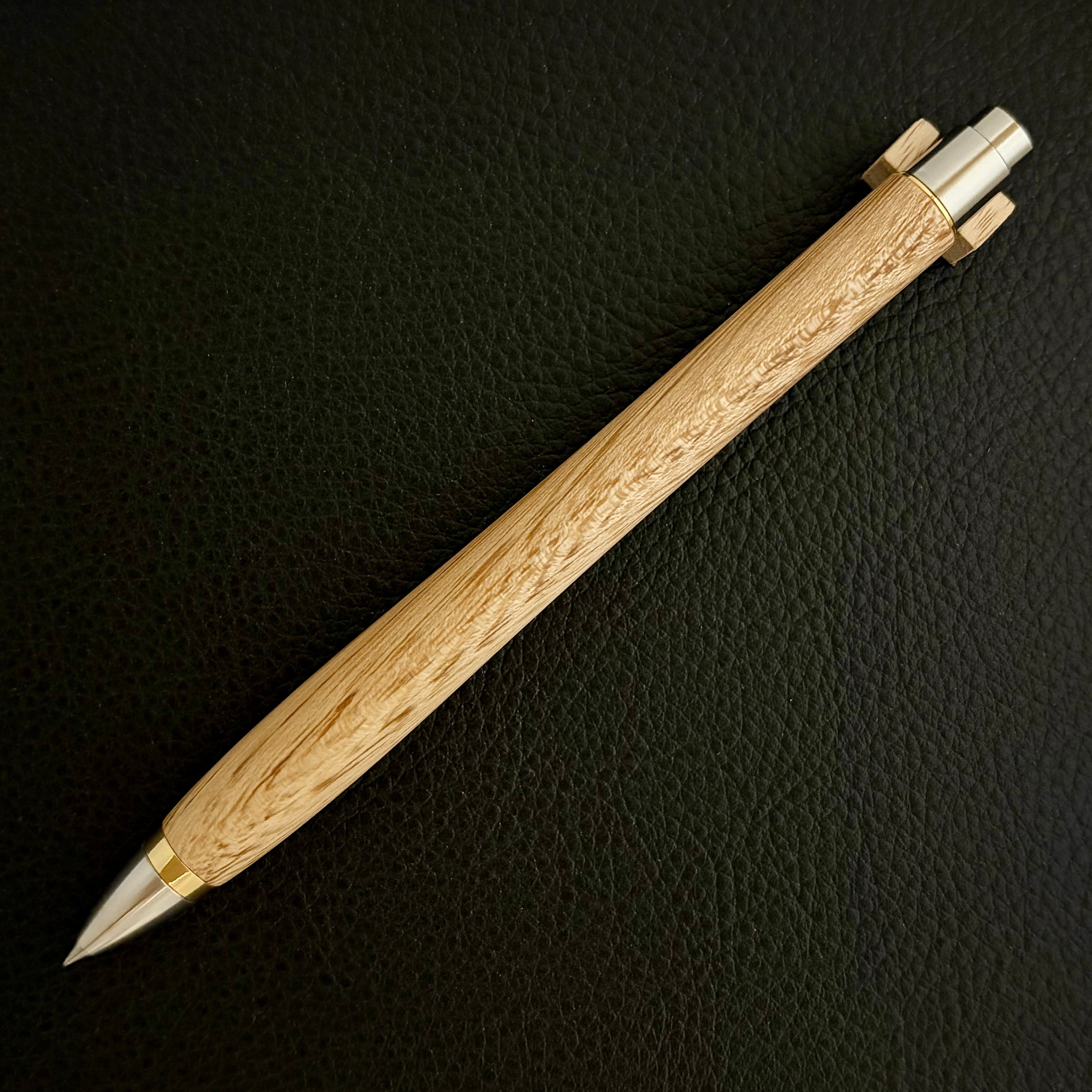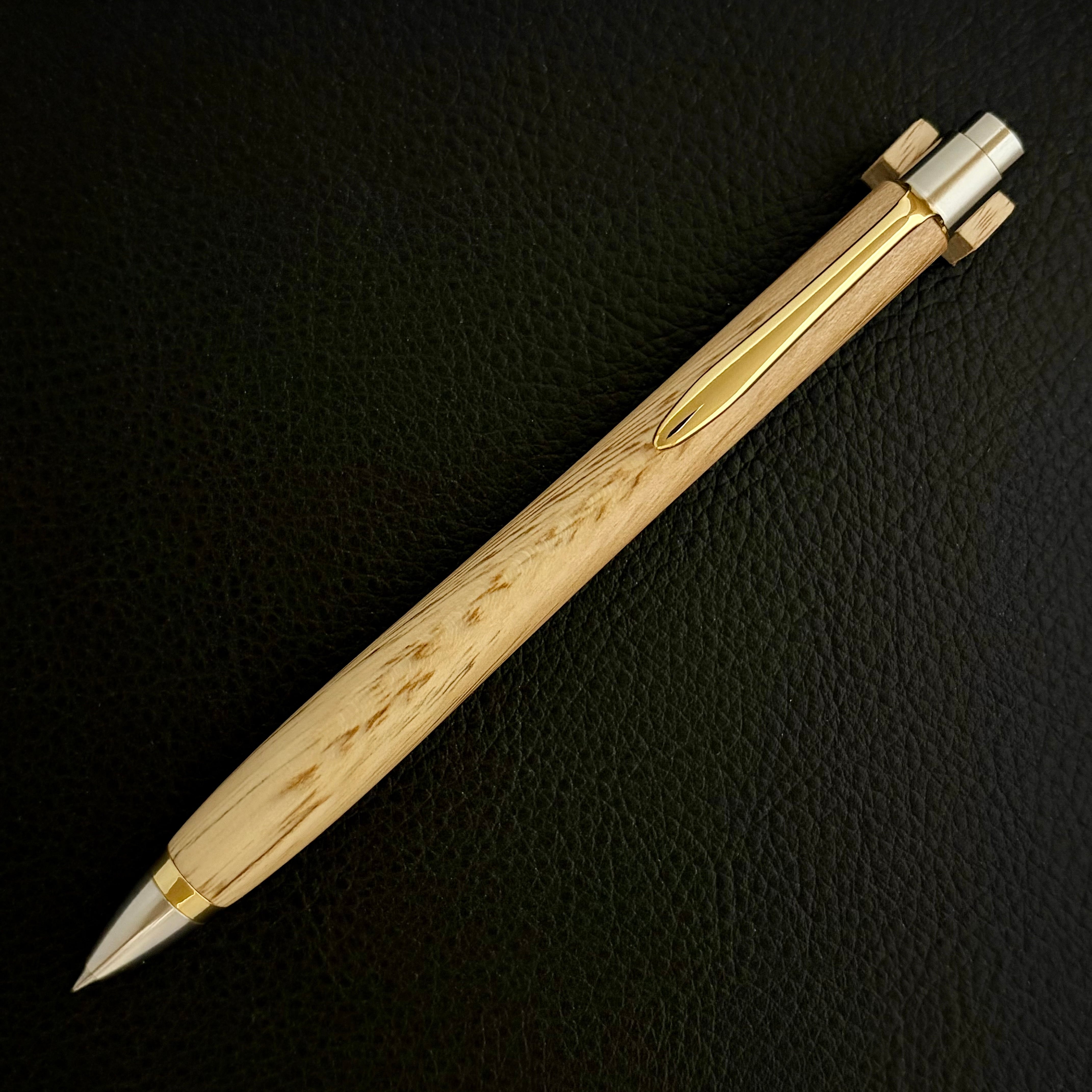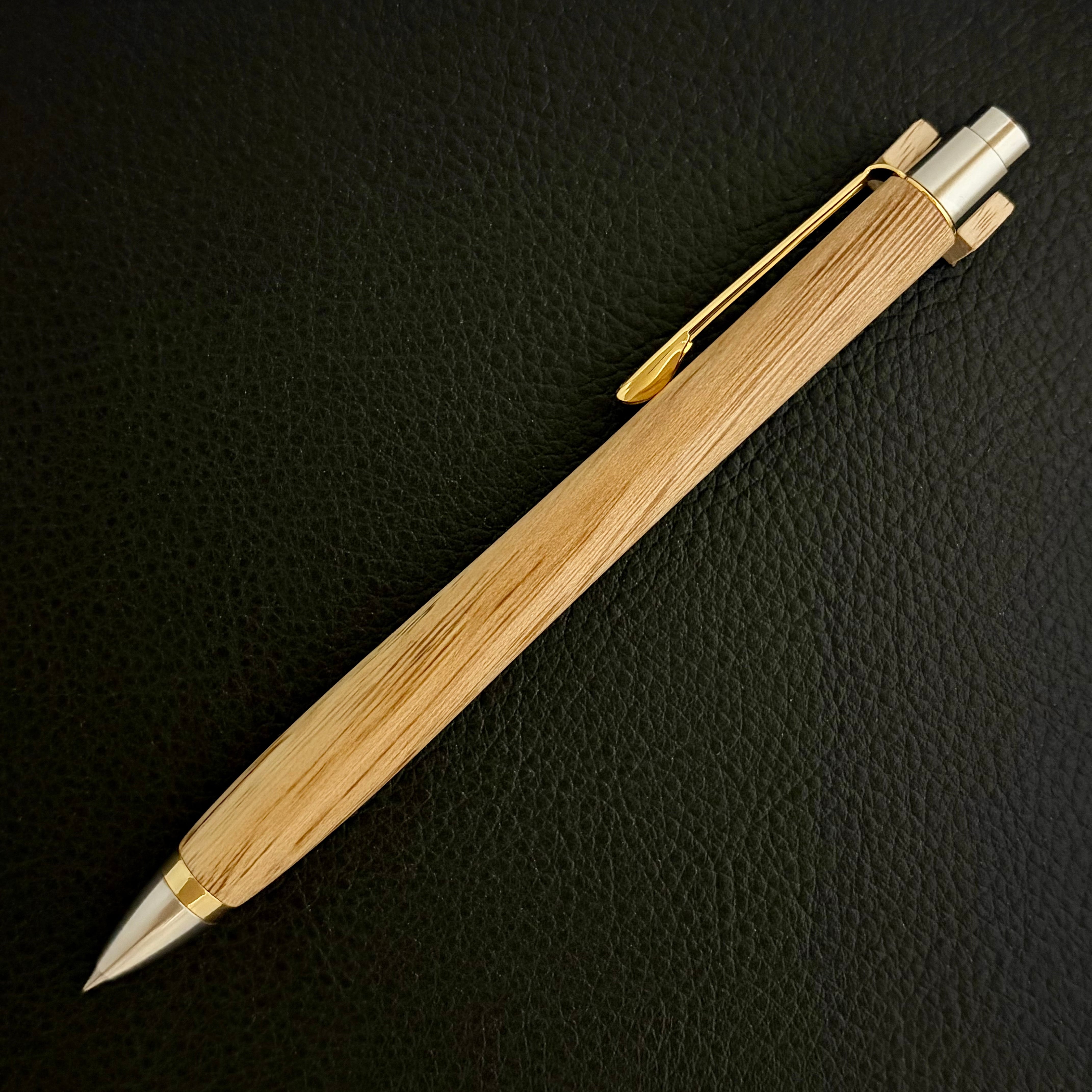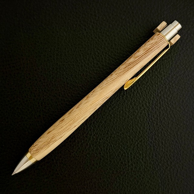 ボールペンのノックシステムは、ドイツ最高のクリックメカニズムを採用してあります。このメカニズムはユニークな機構のため、クリックしたときのカチカチ音が静かで、どんな場所でも気兼ねなく使うことができます。滑らかに動くこのプッシュ感覚を一度味わうと他には戻れなくなってしまうほどの魅力があります。 100分の1単位の加工精度で削り出されたペン先は、軸ブレも全くありません。