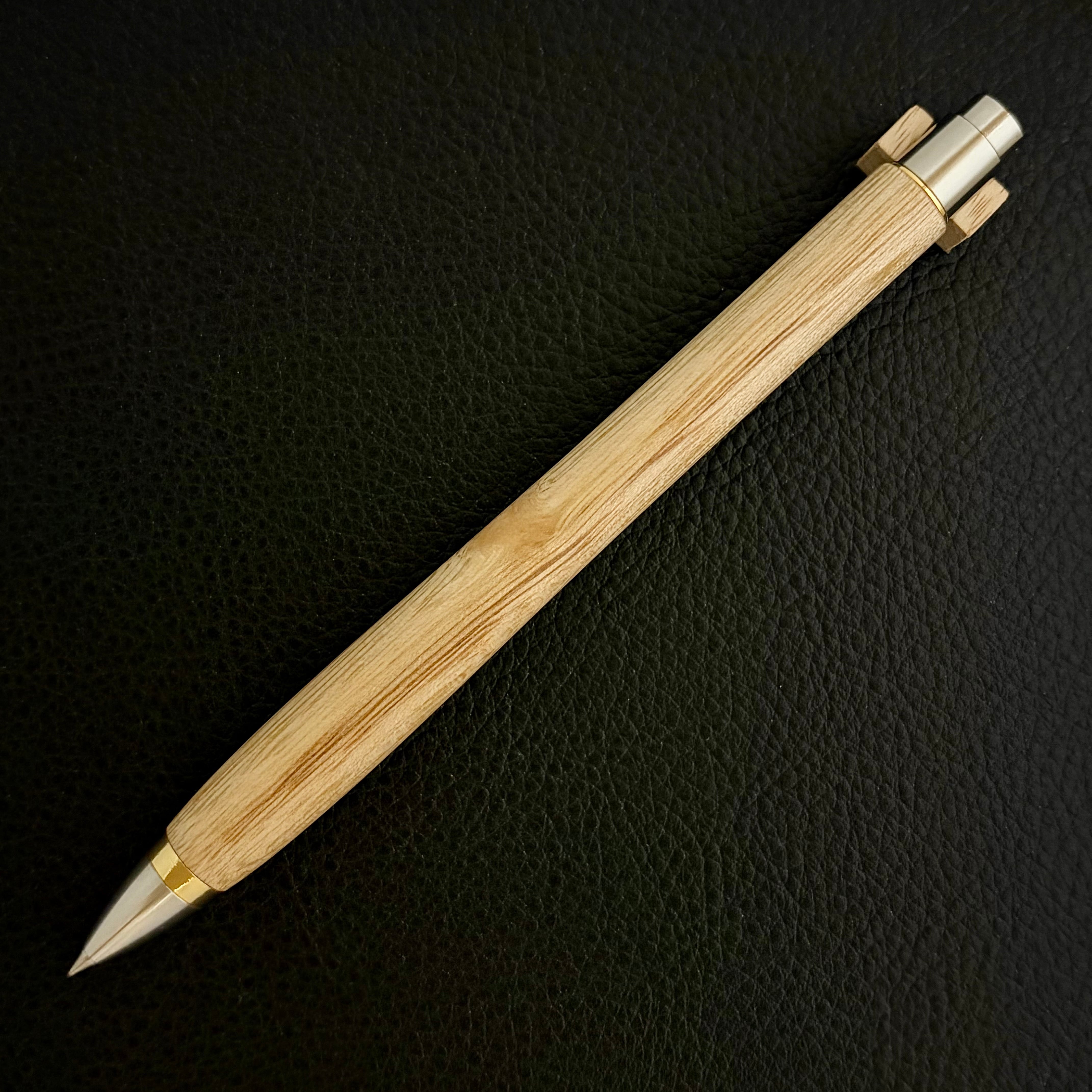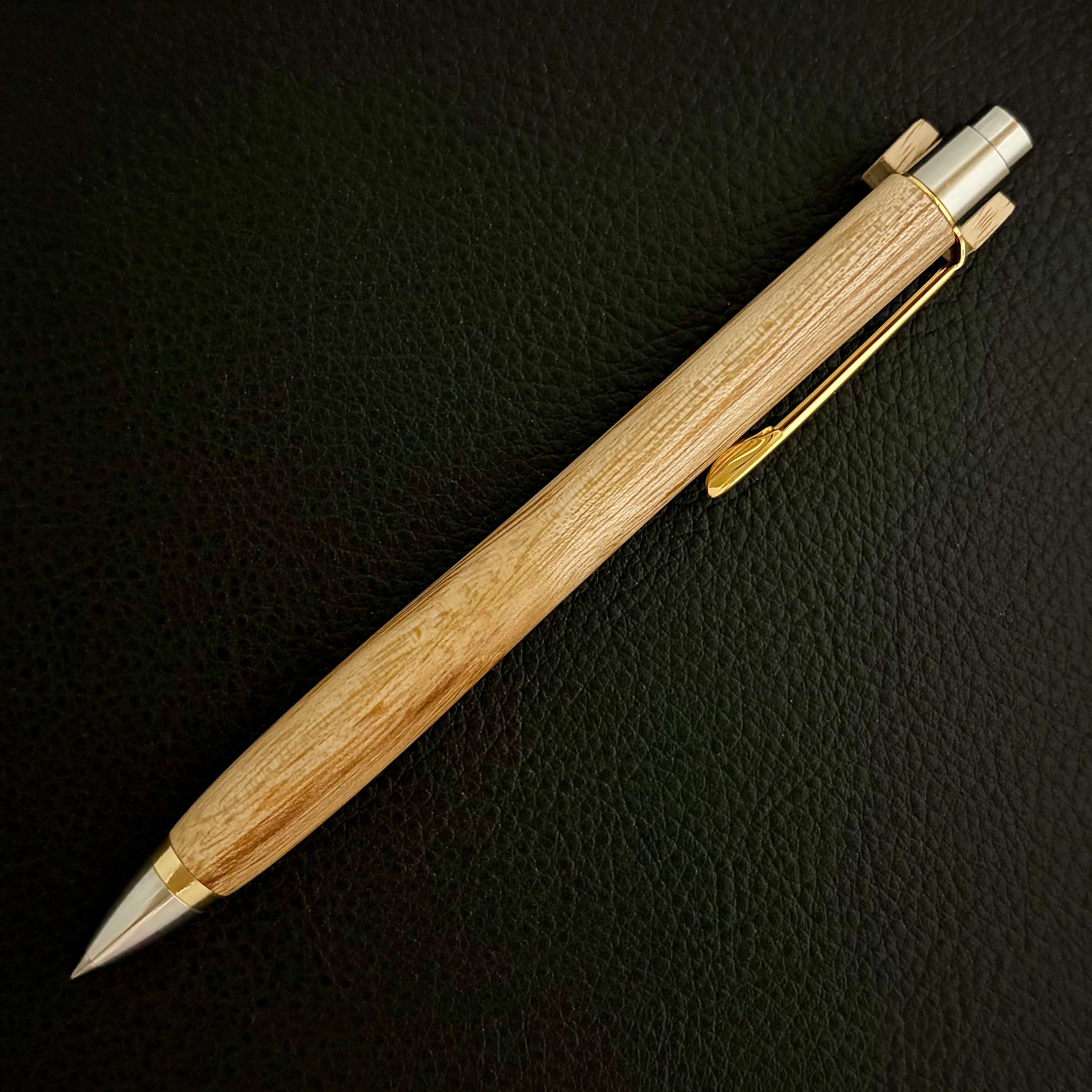 ボールペンのノックシステムは、ドイツ最高のクリックメカニズムを採用してあります。このメカニズムはユニークな機構のため、クリックしたときのカチカチ音が静かで、どんな場所でも気兼ねなく使うことができます。滑らかに動くこのプッシュ感覚を一度味わうと他には戻れなくなってしまうほどの魅力があります。 100分の1単位の加工精度で削り出されたペン先は、軸ブレも全くありません。