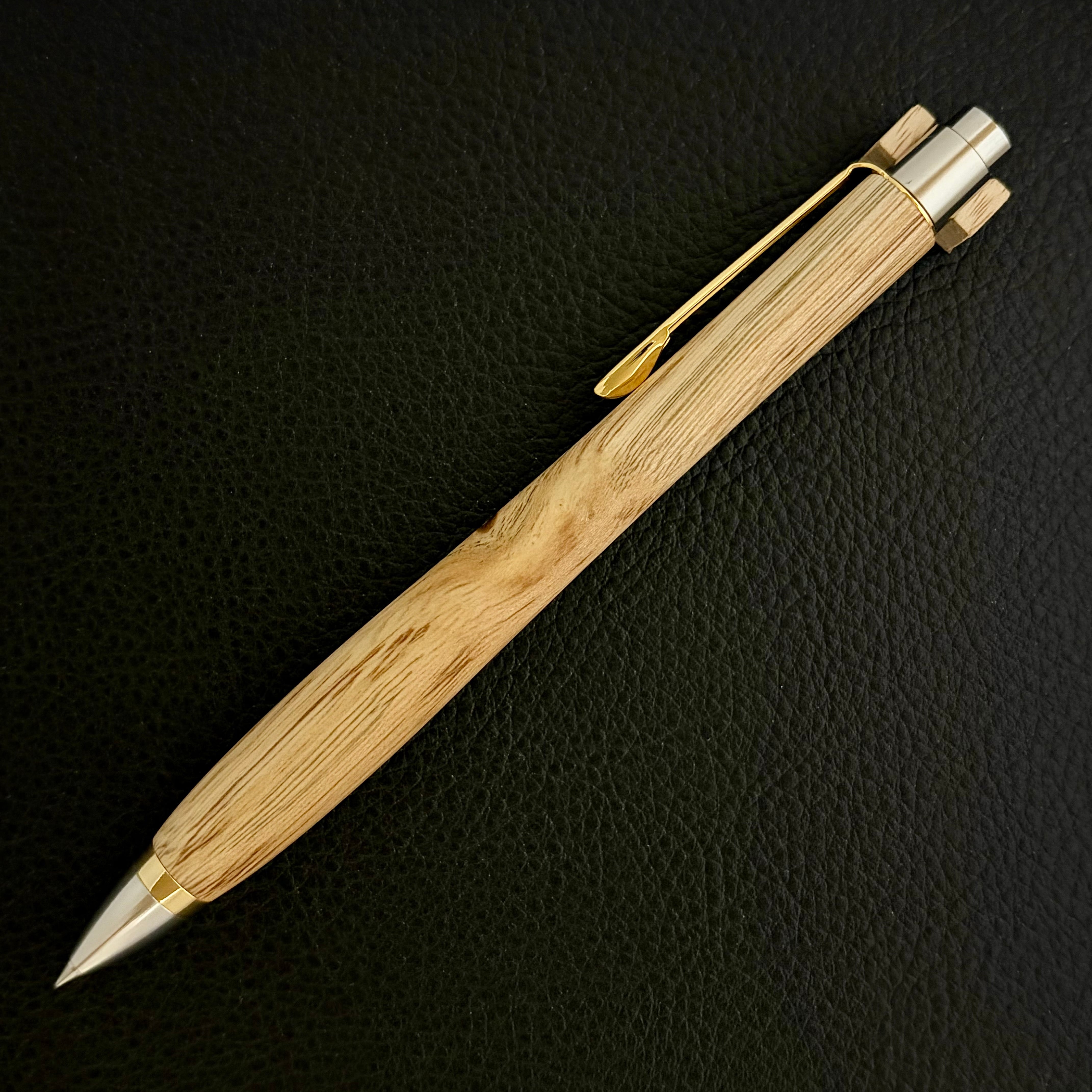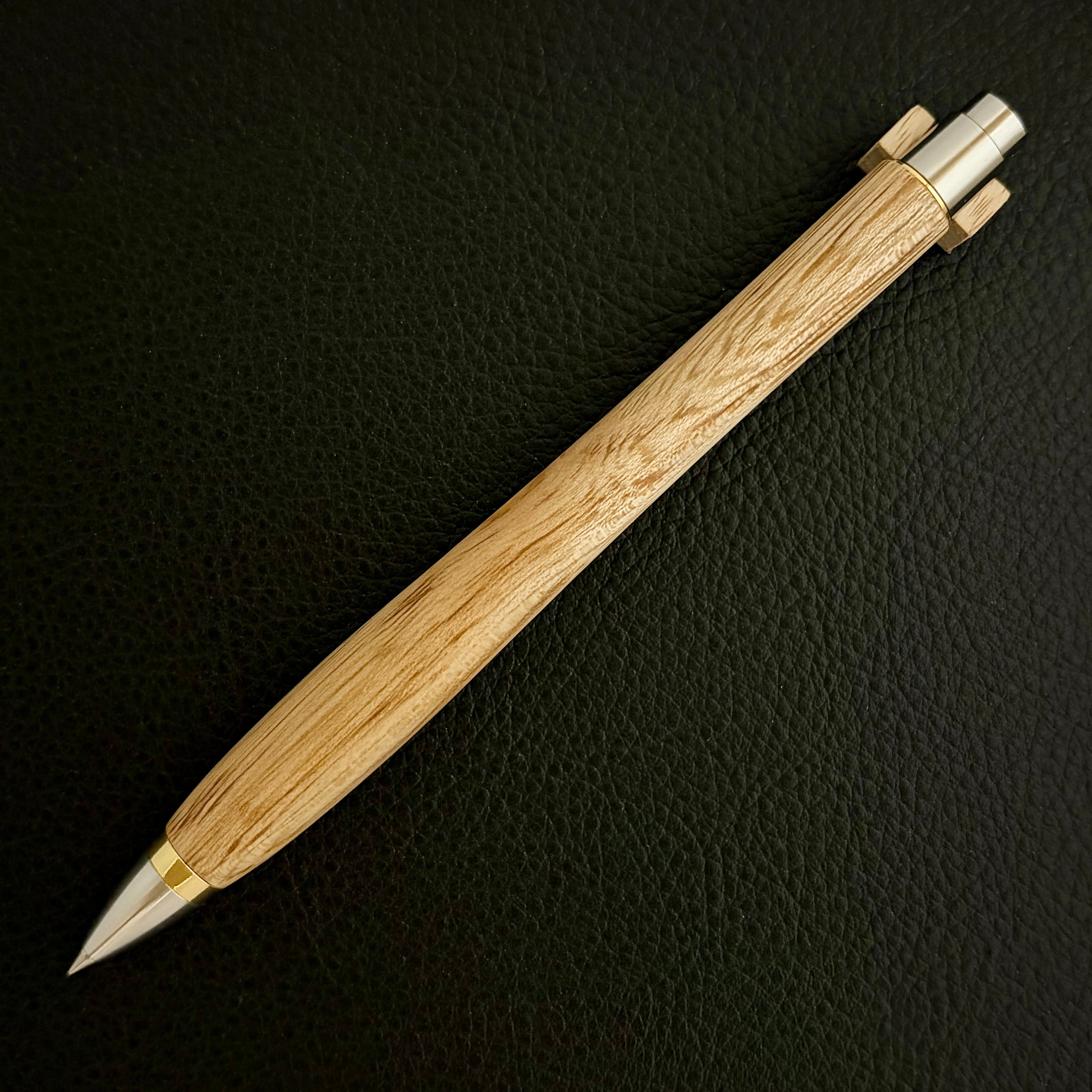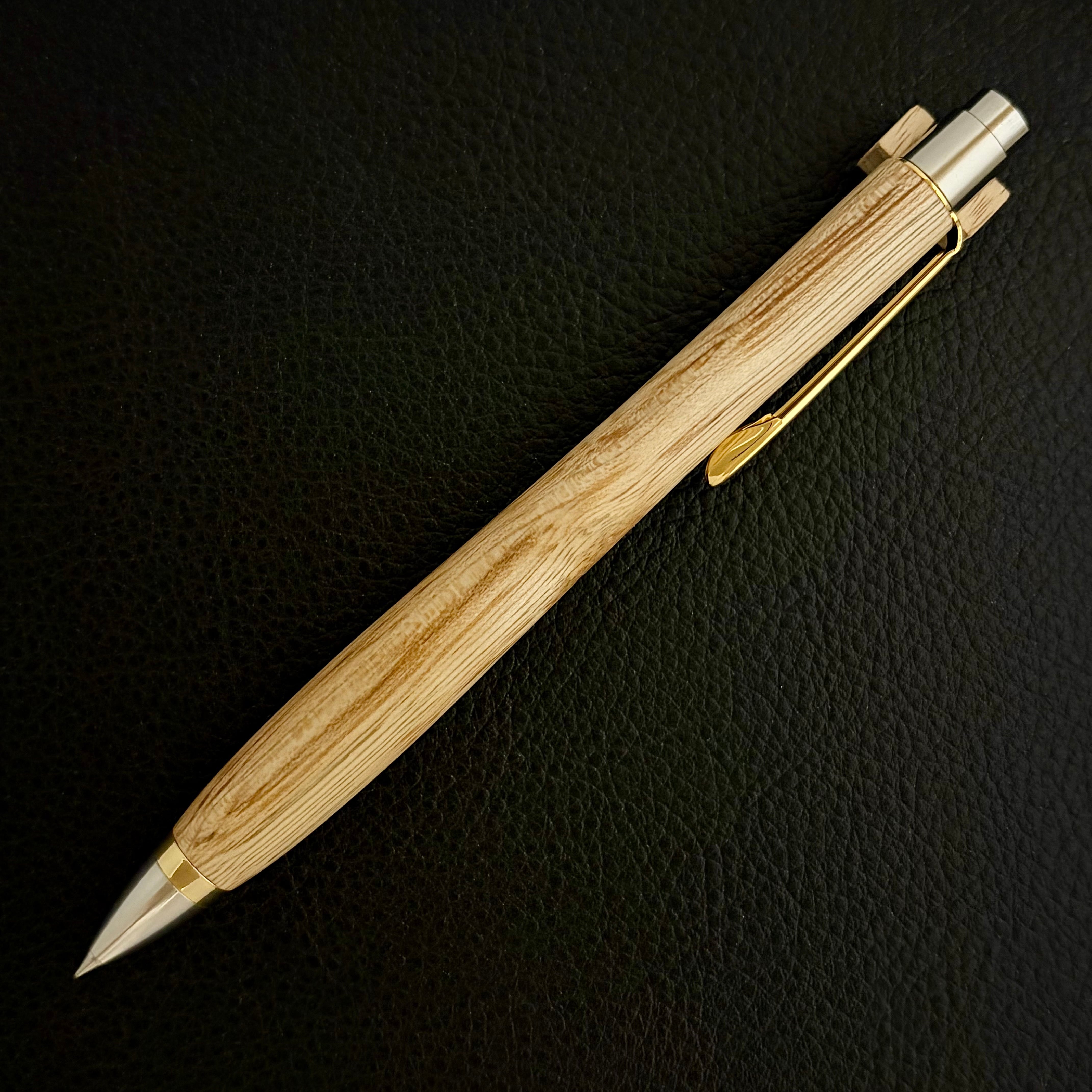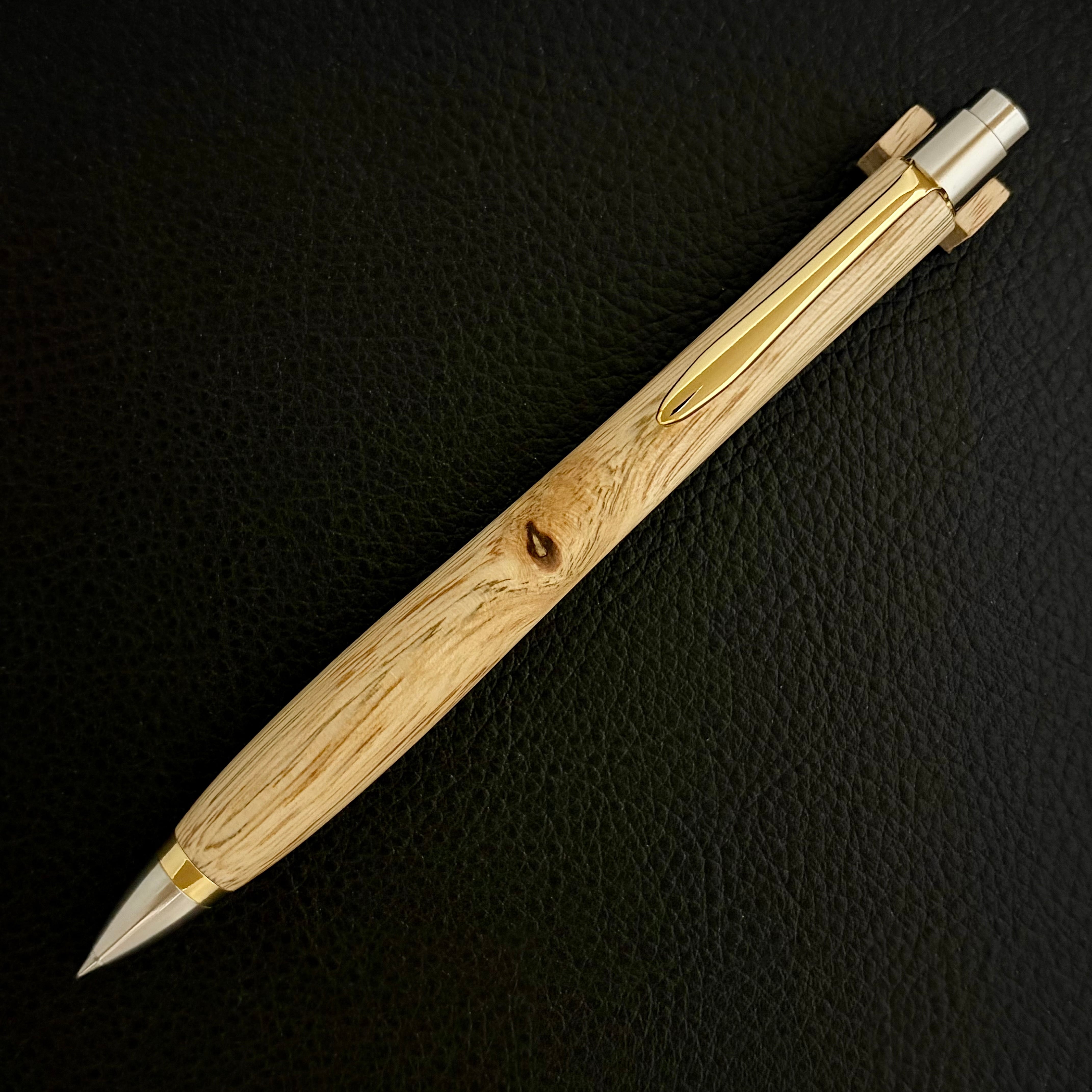 ボールペンのノックシステムは、ドイツ最高のクリックメカニズムを採用してあります。このメカニズムはユニークな機構のため、クリックしたときのカチカチ音が静かで、どんな場所でも気兼ねなく使うことができます。滑らかに動くこのプッシュ感覚を一度味わうと他には戻れなくなってしまうほどの魅力があります。 100分の1単位の加工精度で削り出されたペン先は、軸ブレも全くありません。