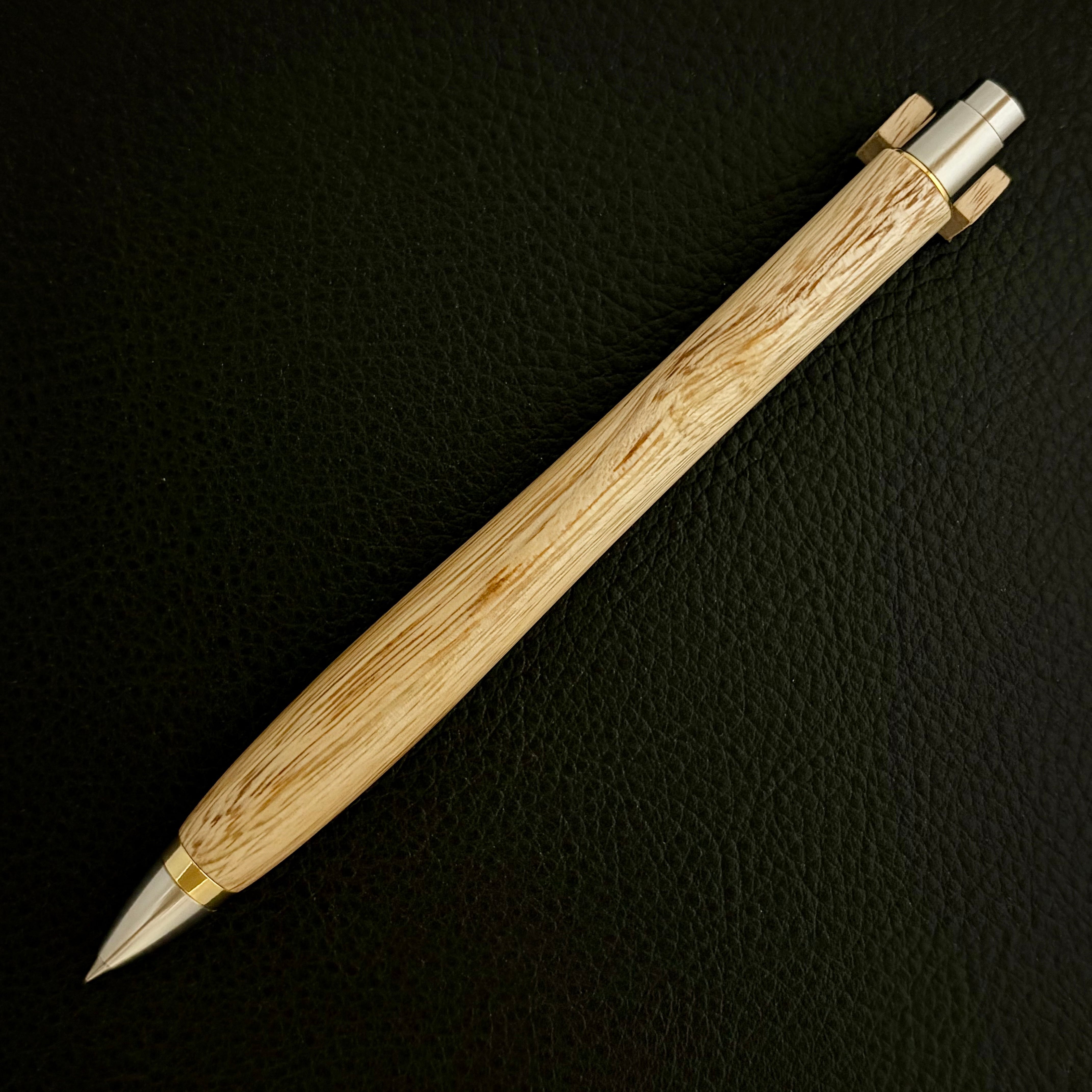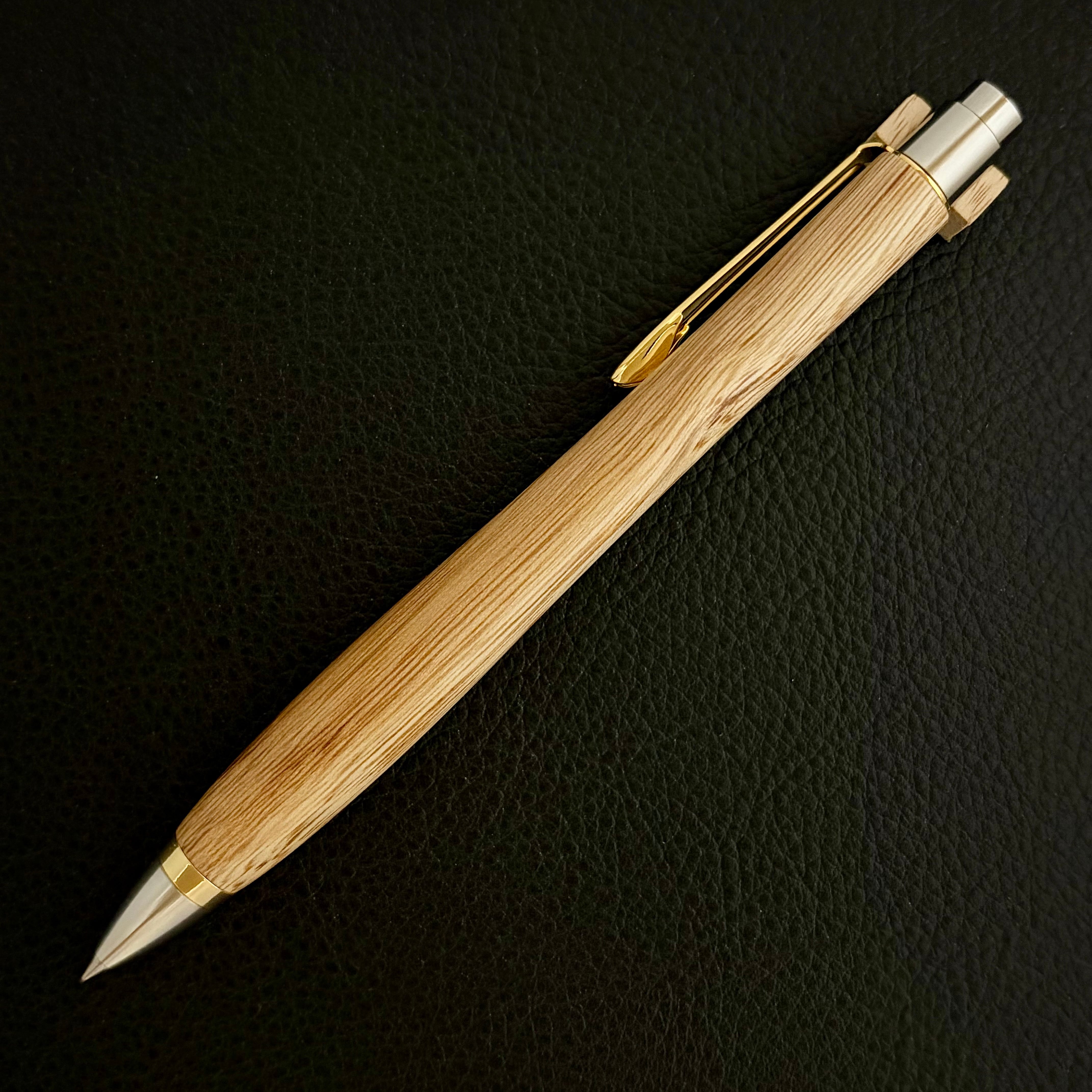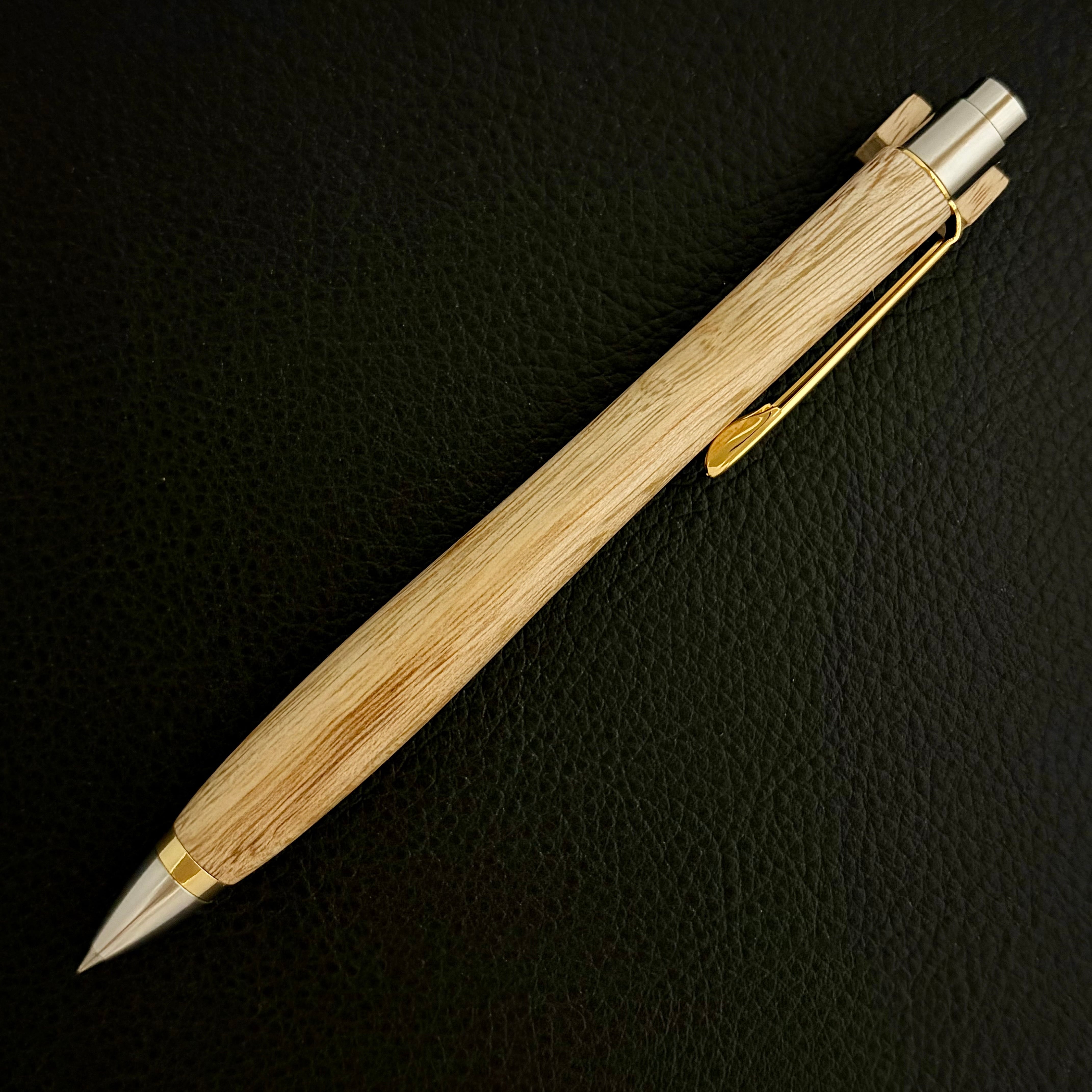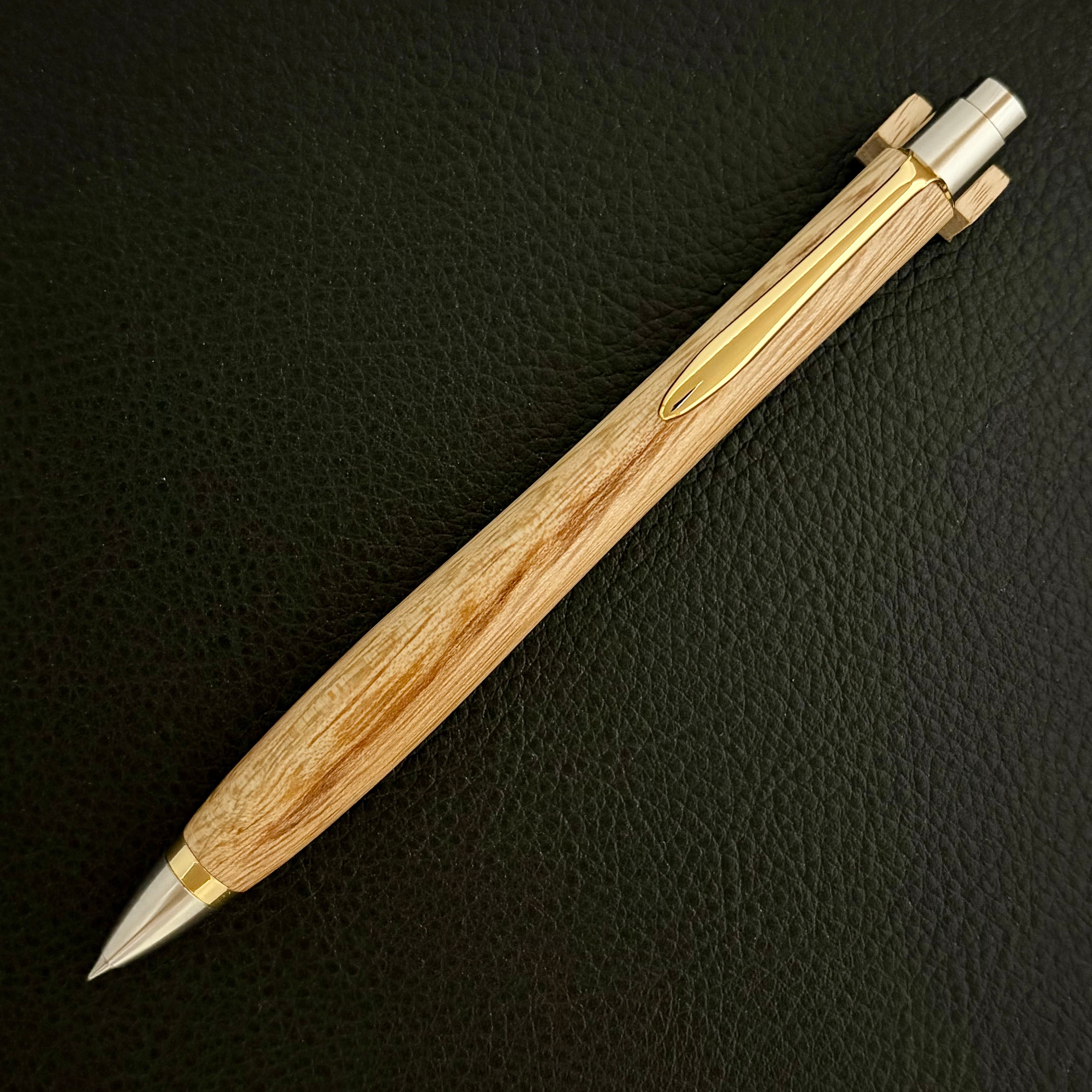 ボールペンのノックシステムは、ドイツ最高のクリックメカニズムを採用してあります。このメカニズムはユニークな機構のため、クリックしたときのカチカチ音が静かで、どんな場所でも気兼ねなく使うことができます。滑らかに動くこのプッシュ感覚を一度味わうと他には戻れなくなってしまうほどの魅力があります。 100分の1単位の加工精度で削り出されたペン先は、軸ブレも全くありません。