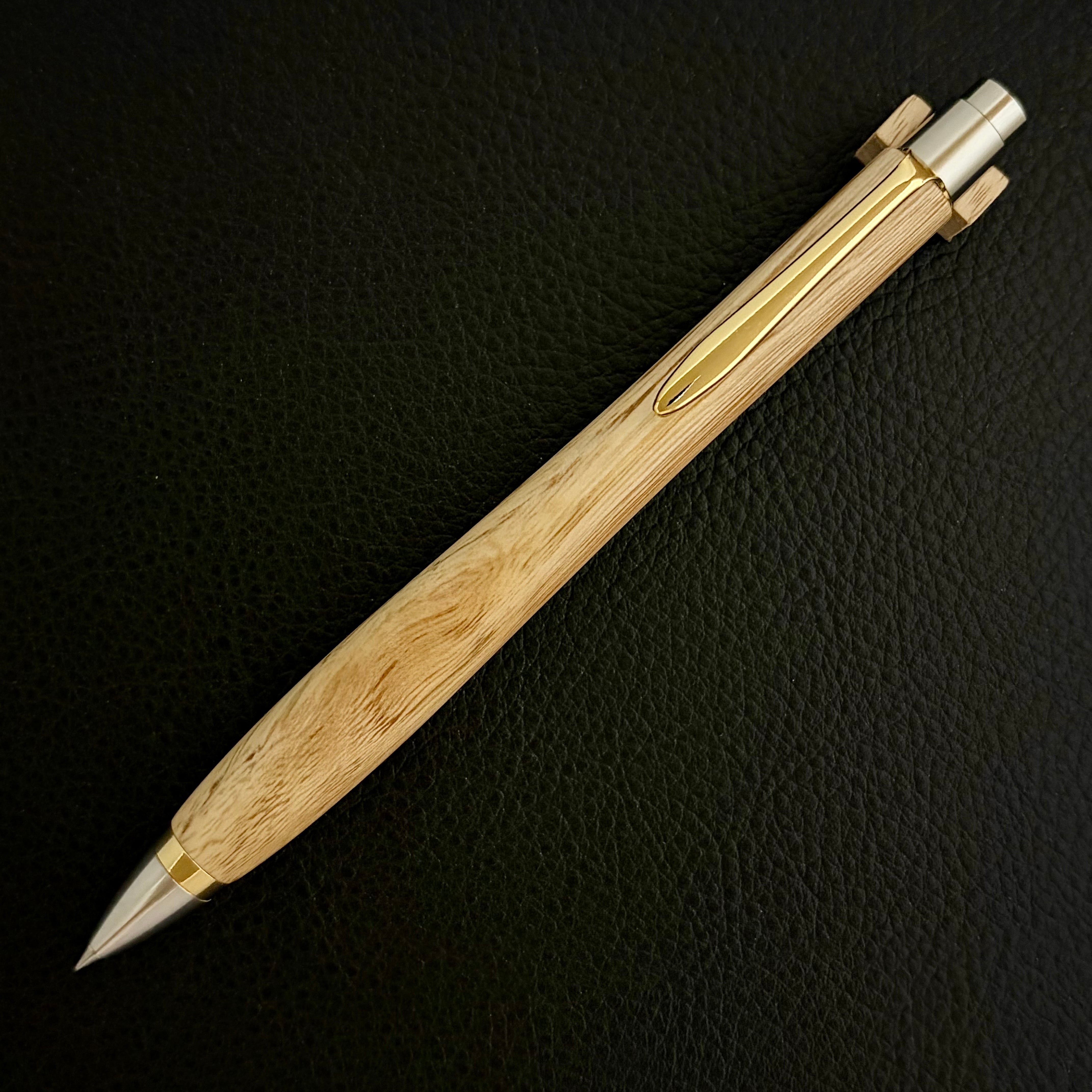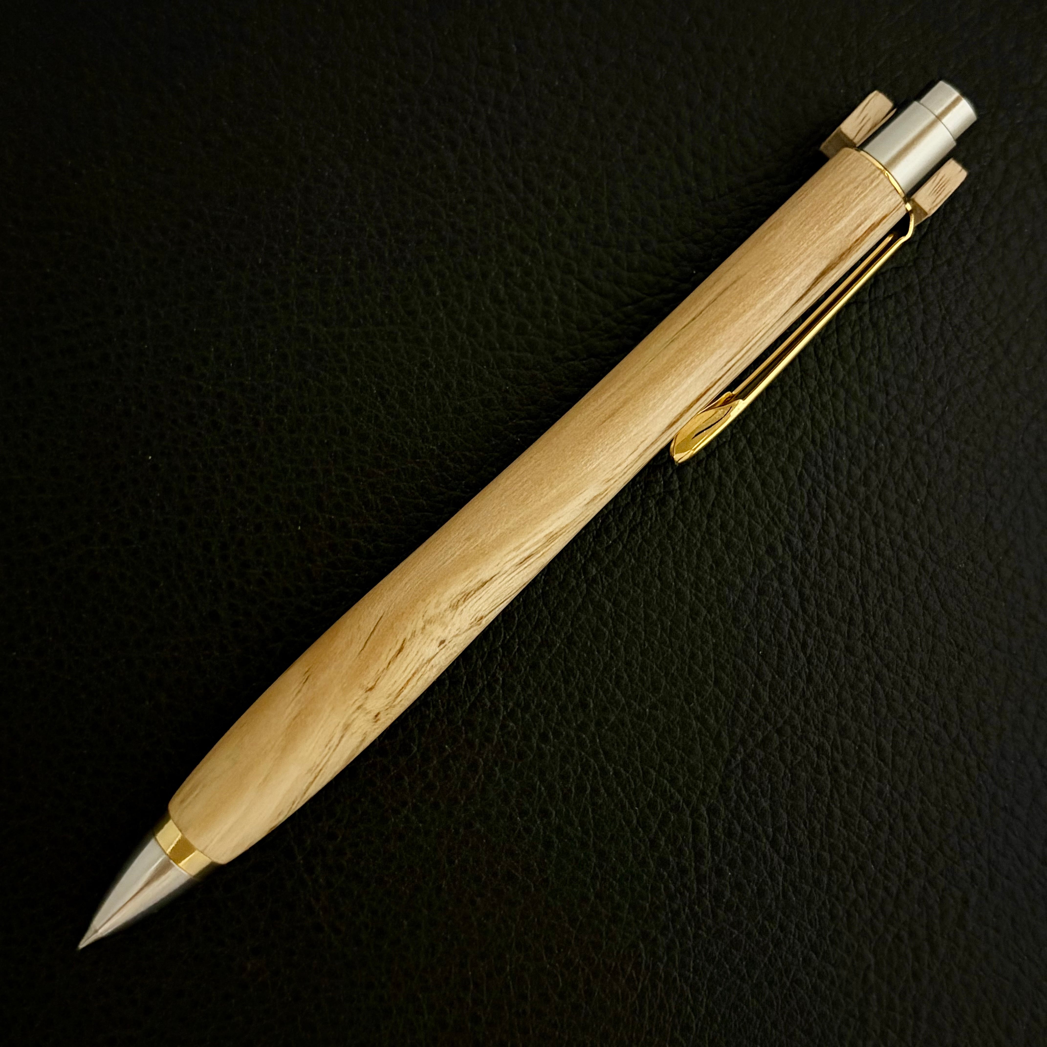 ボールペンのノックシステムは、ドイツ最高のクリックメカニズムを採用してあります。このメカニズムはユニークな機構のため、クリックしたときのカチカチ音が静かで、どんな場所でも気兼ねなく使うことができます。滑らかに動くこのプッシュ感覚を一度味わうと他には戻れなくなってしまうほどの魅力があります。 100分の1単位の加工精度で削り出されたペン先は、軸ブレも全くありません。