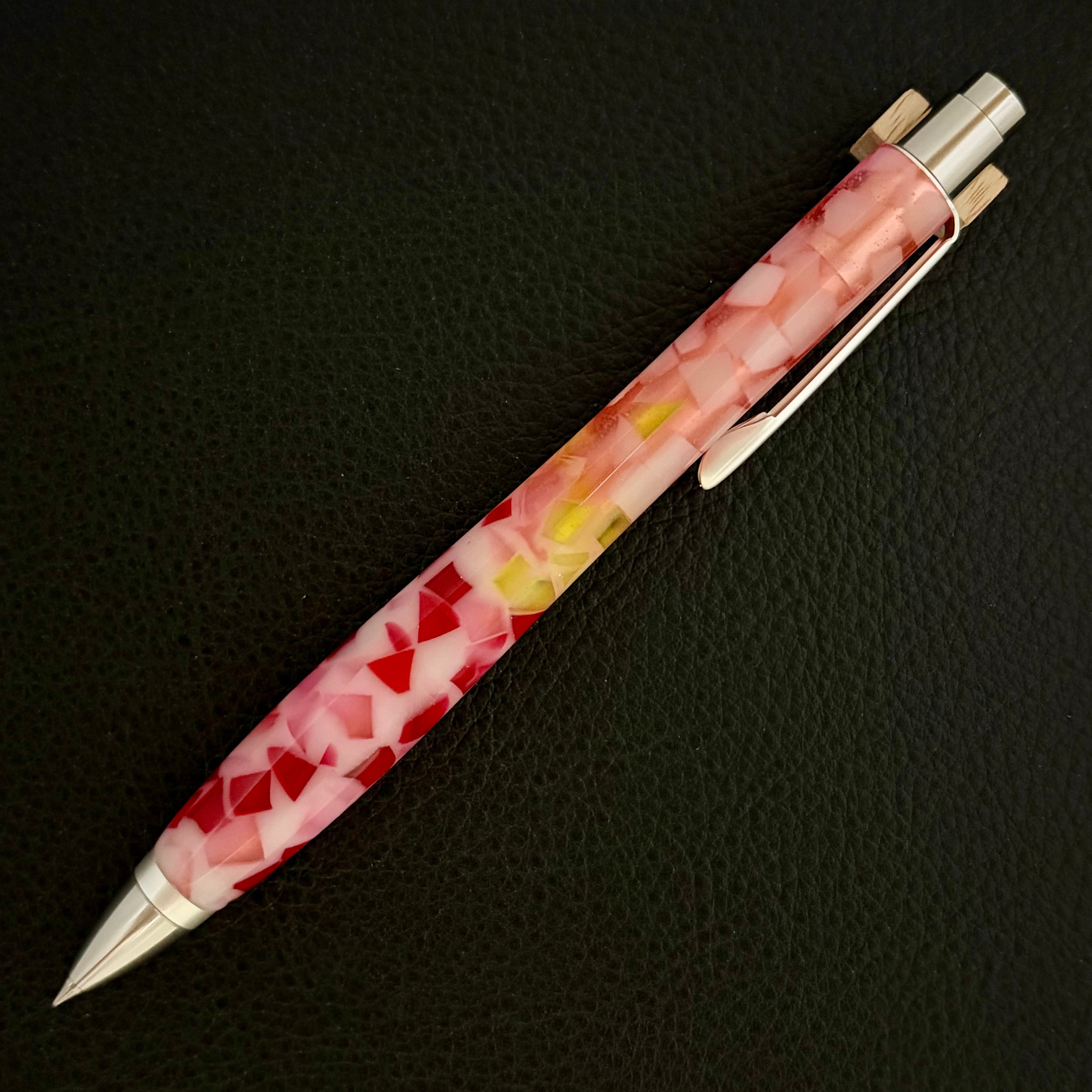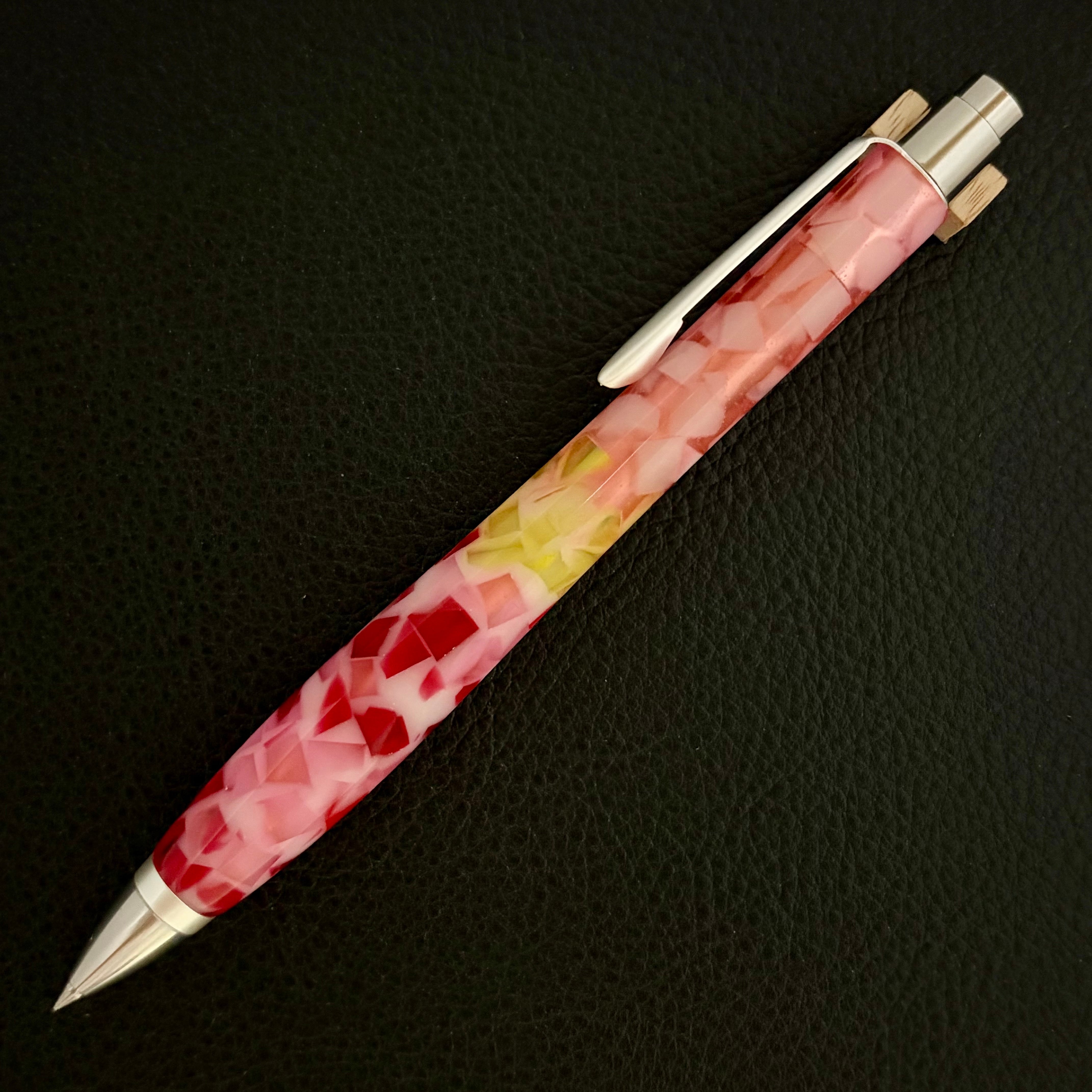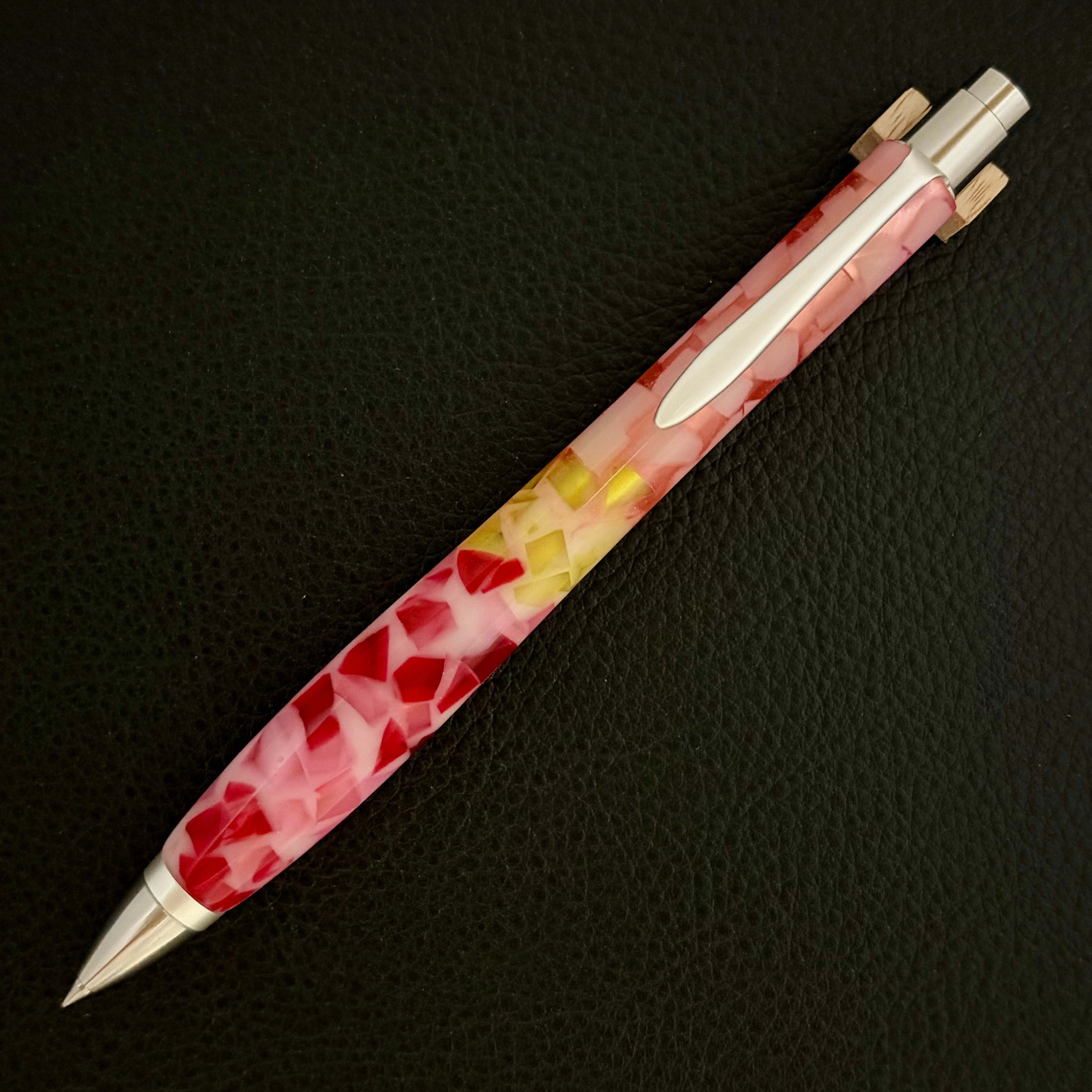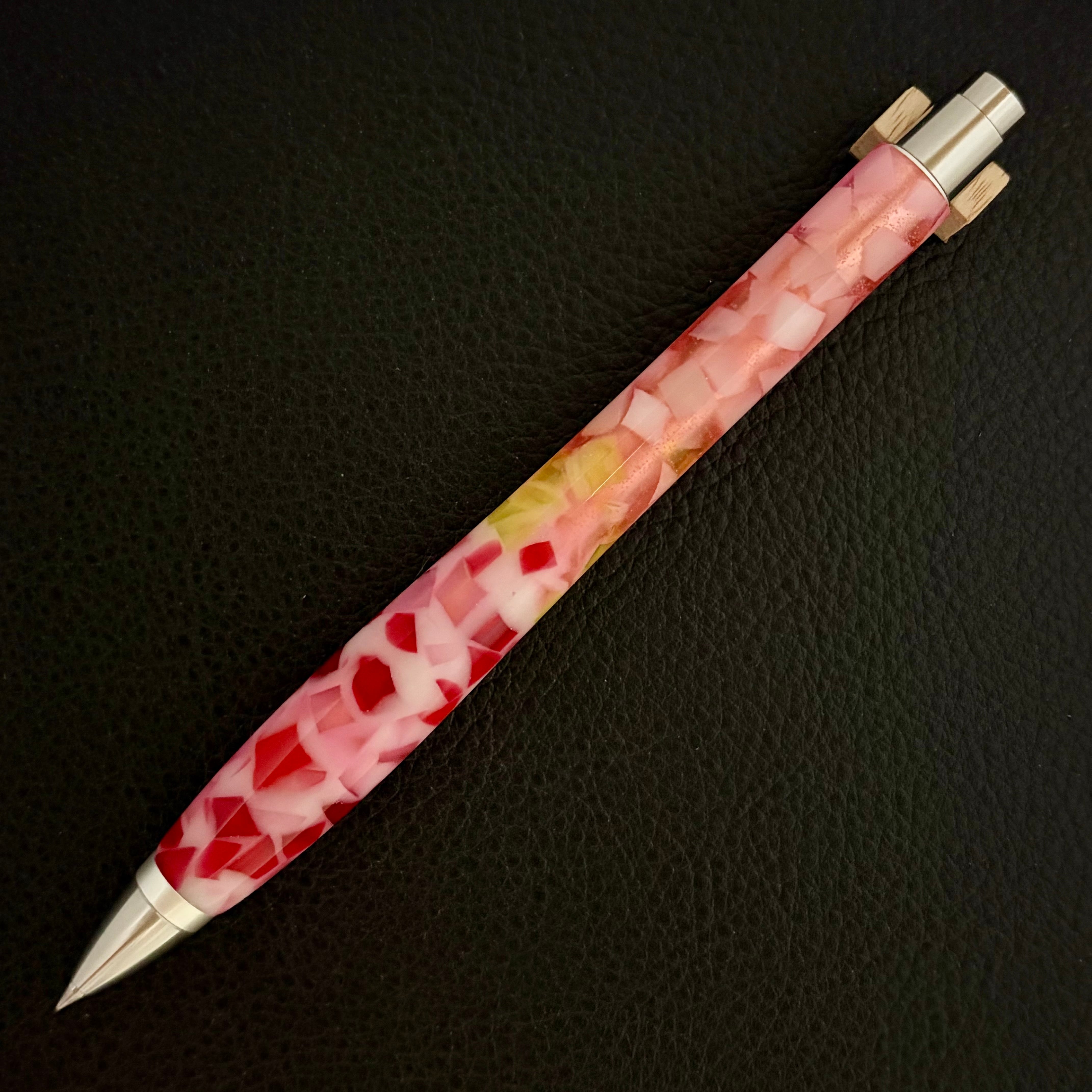ボールペンのノックシステムは、ドイツ最高のクリックメカニズムを採用してあります。このメカニズムはユニークな機構のため、クリックしたときのカチカチ音が静かで、どんな場所でも気兼ねなく使うことができます。滑らかに動くこのプッシュ感覚を一度味わうと他には戻れなくなってしまうほどの魅力があります。 100分の1単位の加工精度で削り出されたペン先は、軸ブレも全くありません。