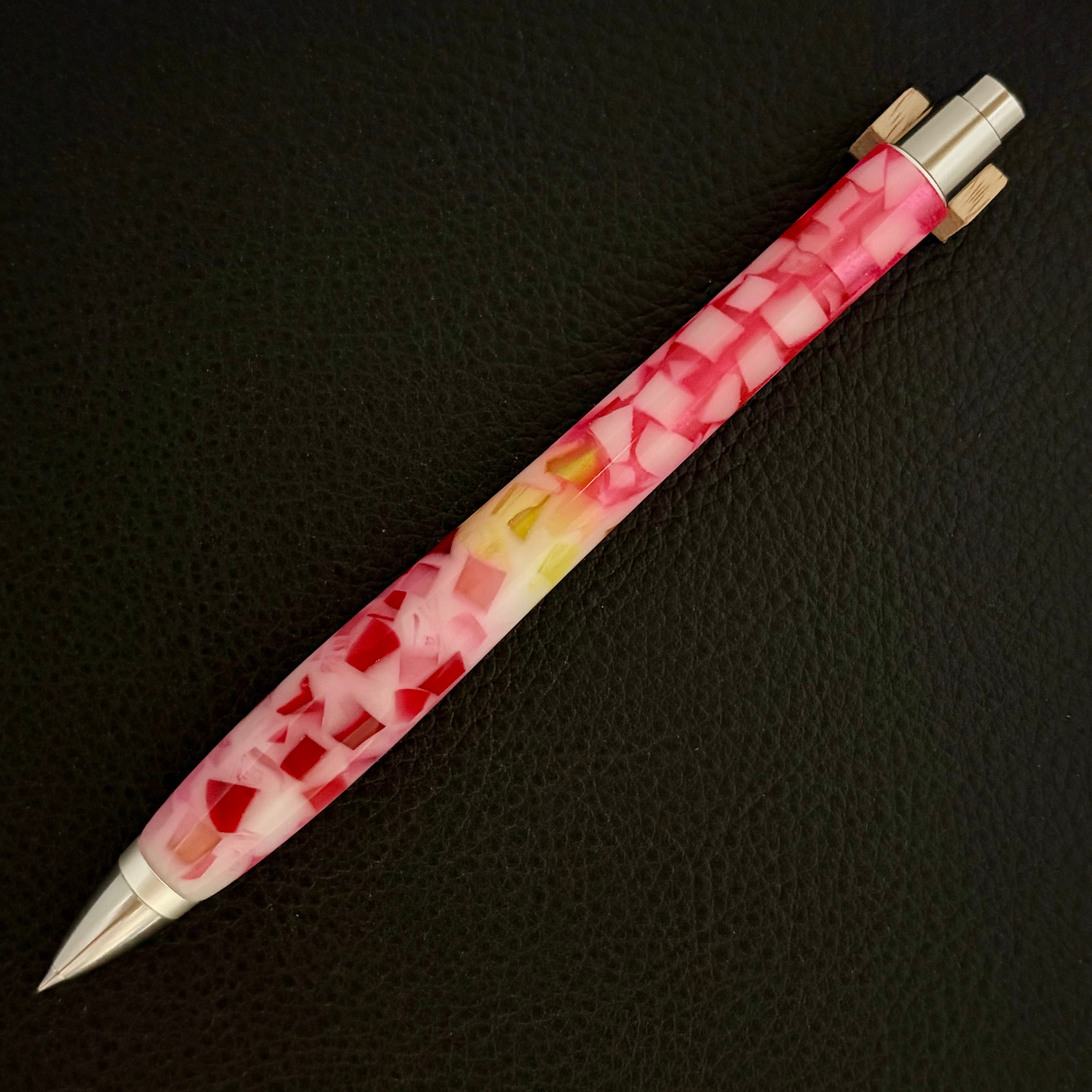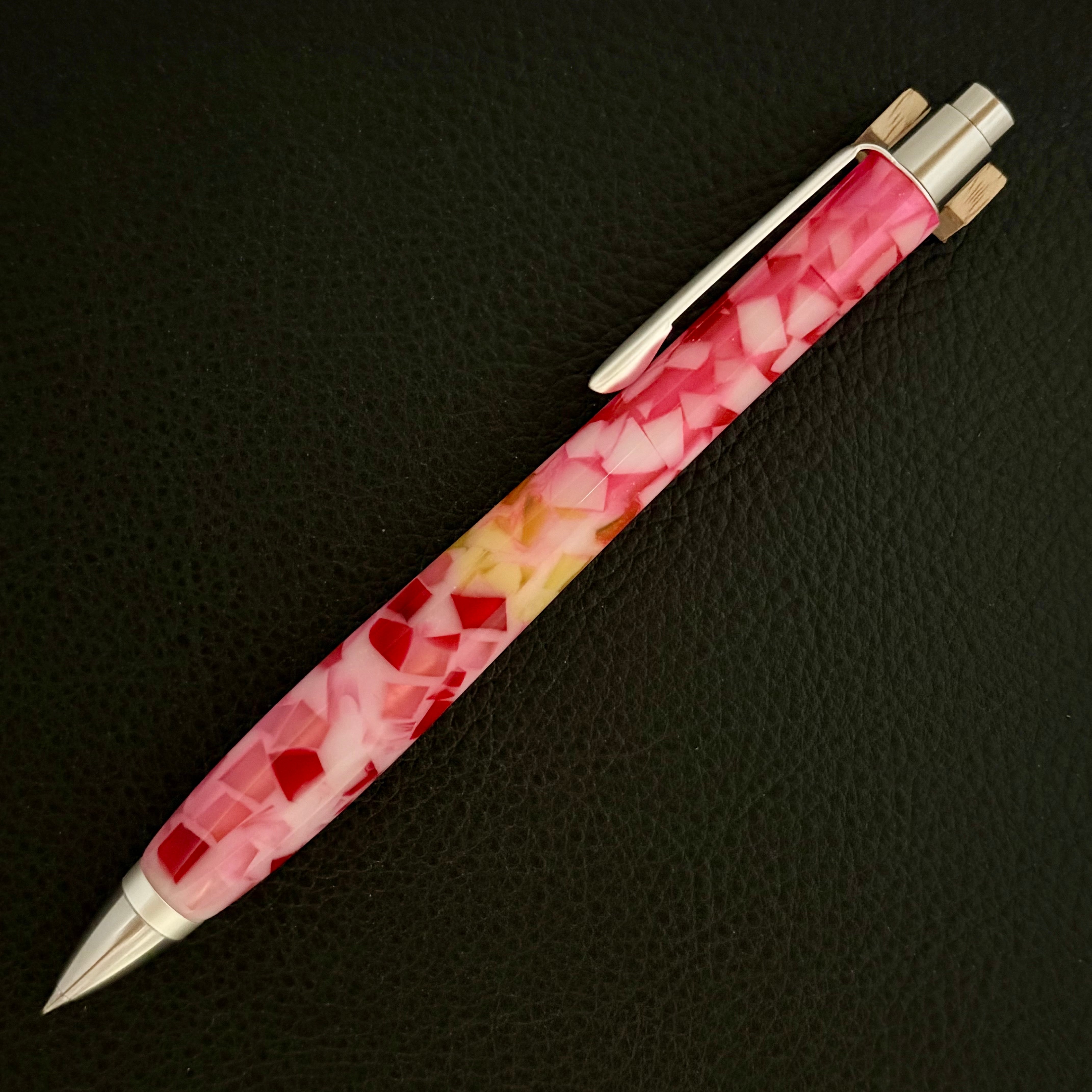 ボールペンのノックシステムは、ドイツ最高のクリックメカニズムを採用してあります。このメカニズムはユニークな機構のため、クリックしたときのカチカチ音が静かで、どんな場所でも気兼ねなく使うことができます。滑らかに動くこのプッシュ感覚を一度味わうと他には戻れなくなってしまうほどの魅力があります。 100分の1単位の加工精度で削り出されたペン先は、軸ブレも全くありません。