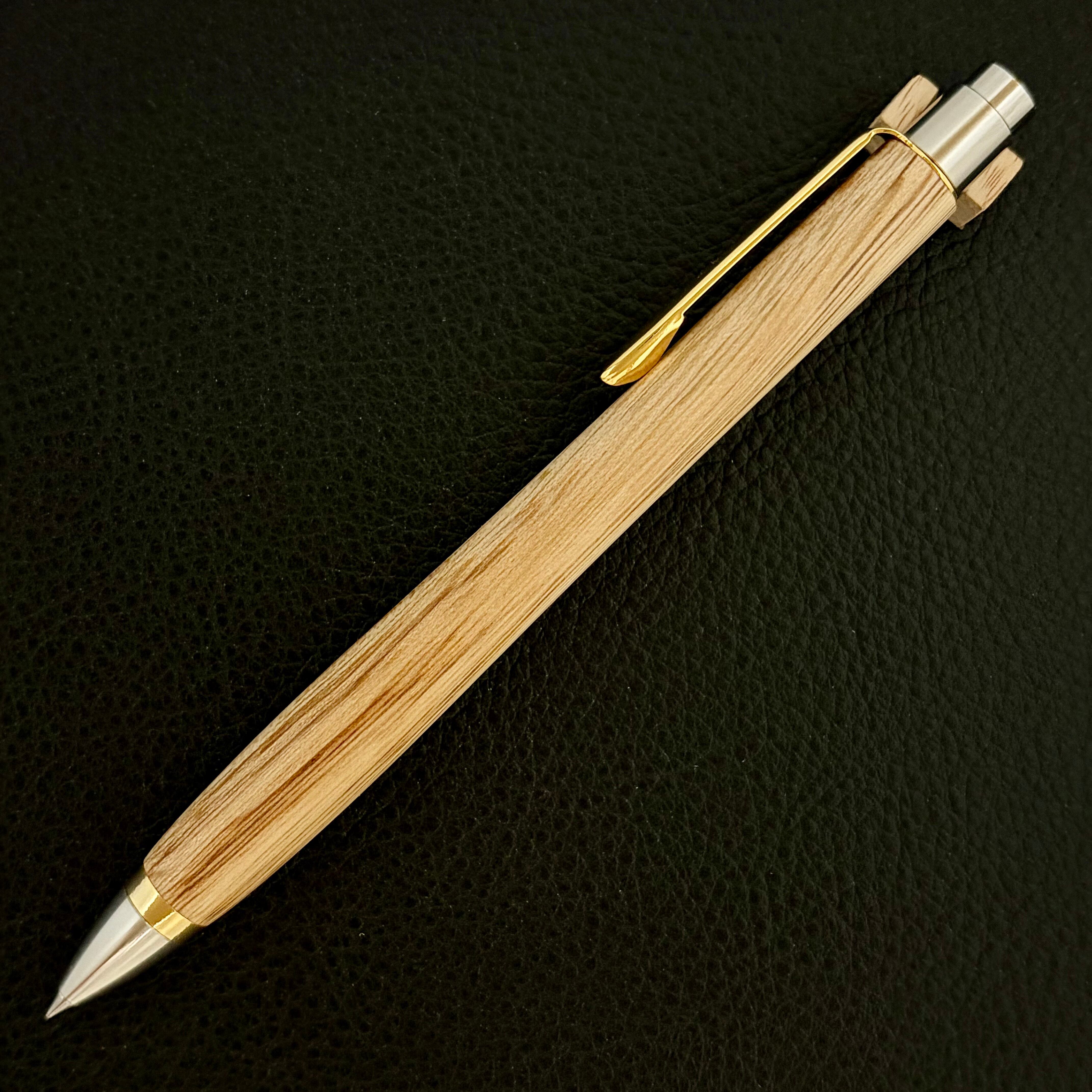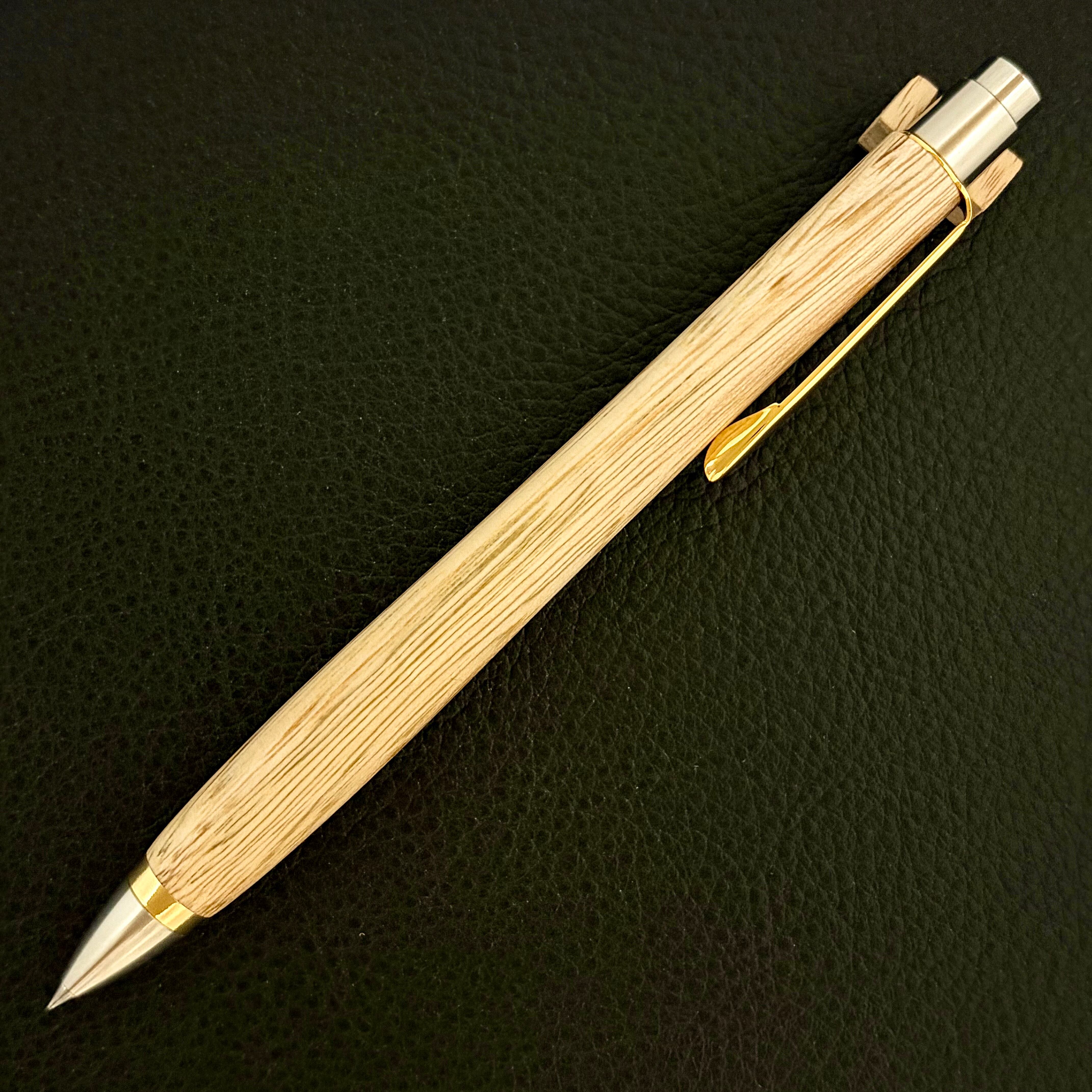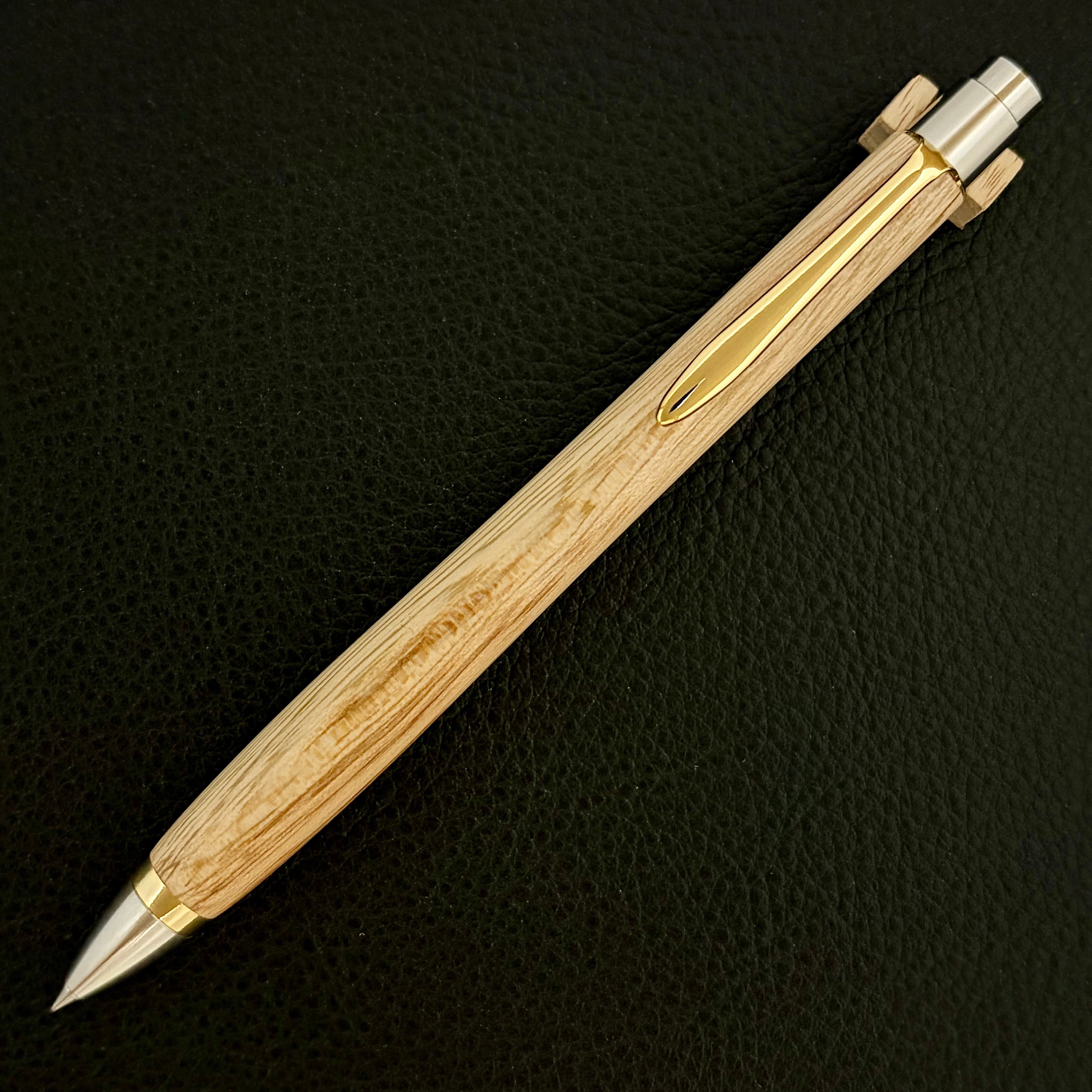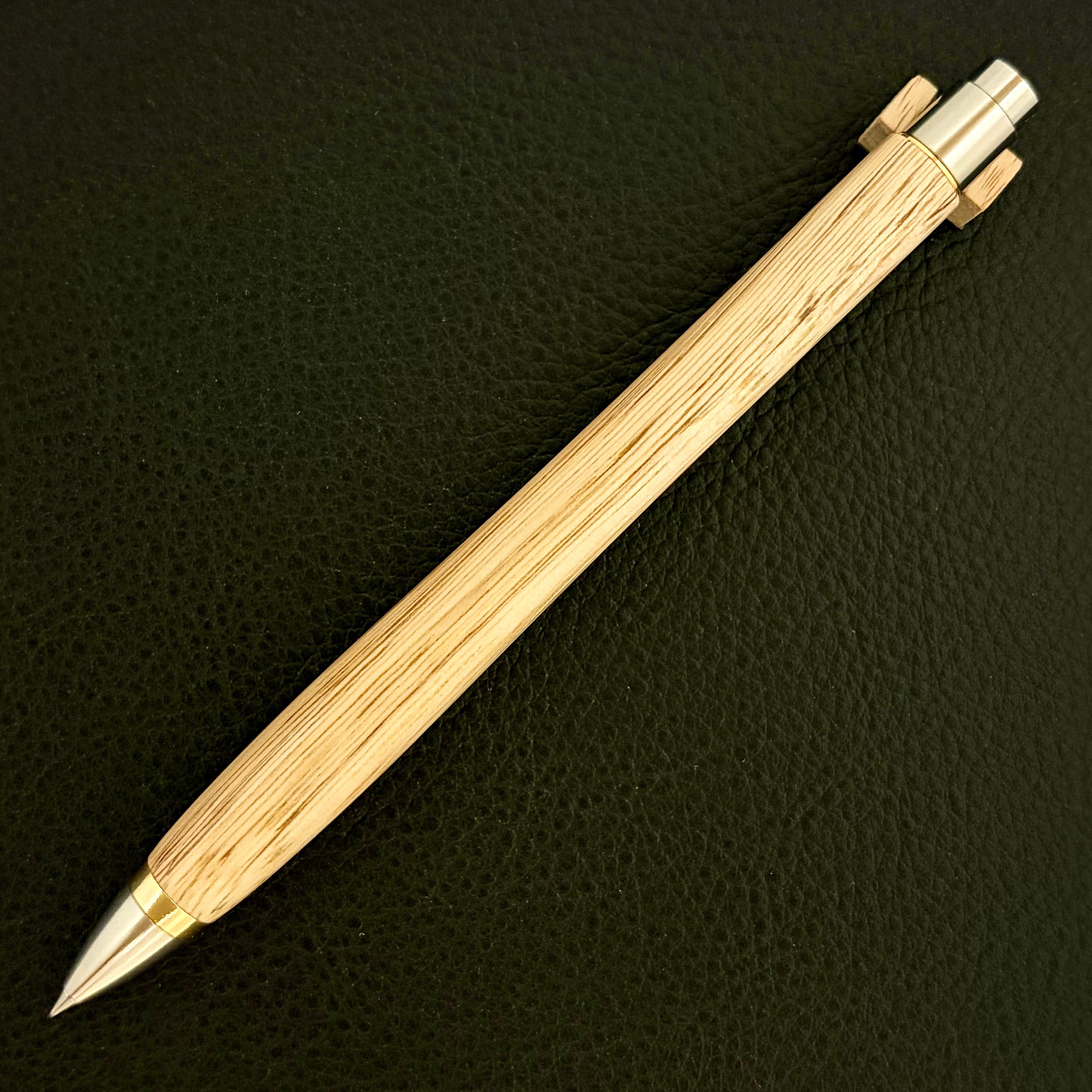 ボールペンのノックシステムは、ドイツ最高のクリックメカニズムを採用してあります。このメカニズムはユニークな機構のため、クリックしたときのカチカチ音が静かで、どんな場所でも気兼ねなく使うことができます。滑らかに動くこのプッシュ感覚を一度味わうと他には戻れなくなってしまうほどの魅力があります。 100分の1単位の加工精度で削り出されたペン先は、軸ブレも全くありません。