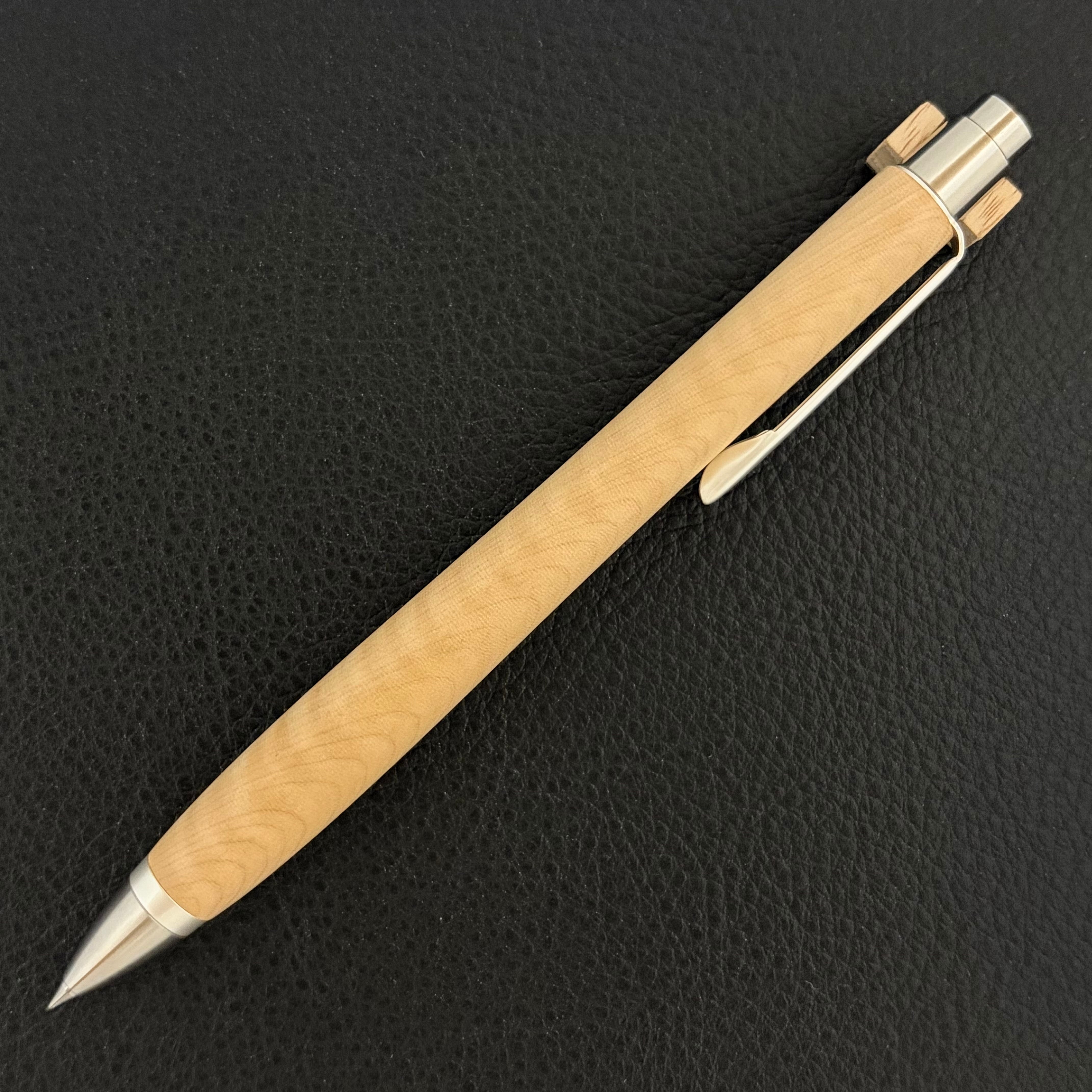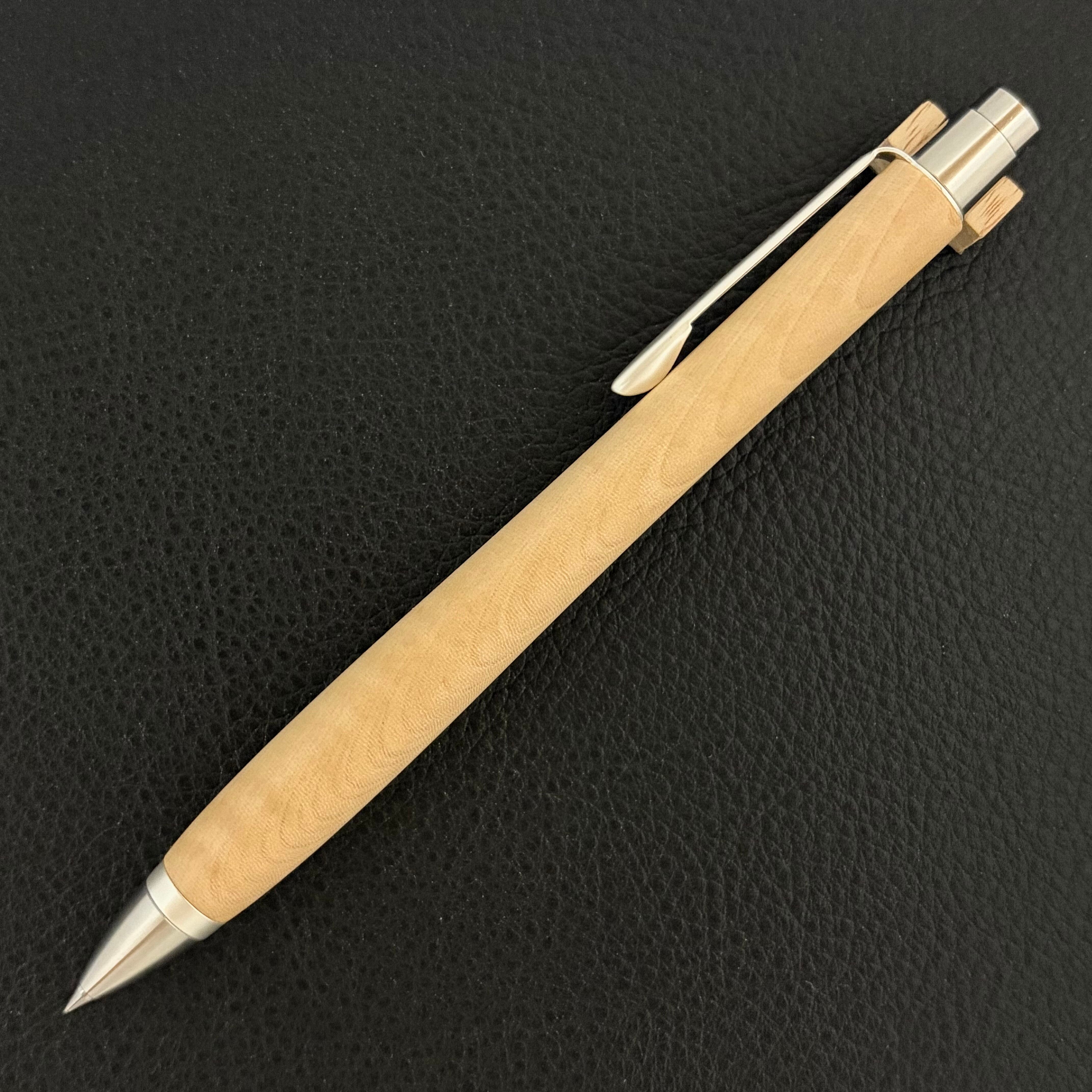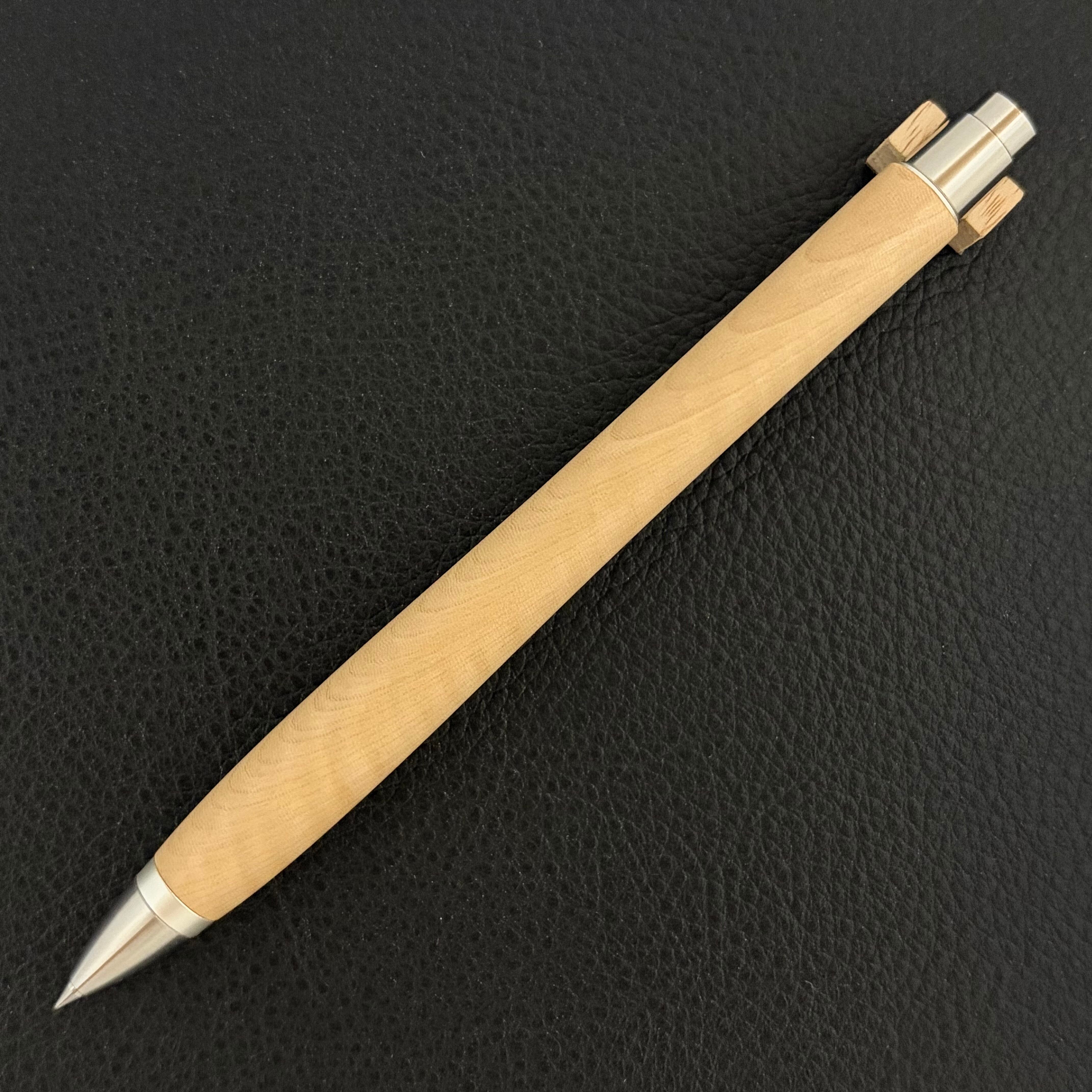 ボールペンのノックシステムは、ドイツ最高のクリックメカニズムを採用してあります。このメカニズムはユニークな機構のため、クリックしたときのカチカチ音が静かで、どんな場所でも気兼ねなく使うことができます。滑らかに動くこのプッシュ感覚を一度味わうと他には戻れなくなってしまうほどの魅力があります。 100分の1単位の加工精度で削り出されたペン先は、軸ブレも全くありません。