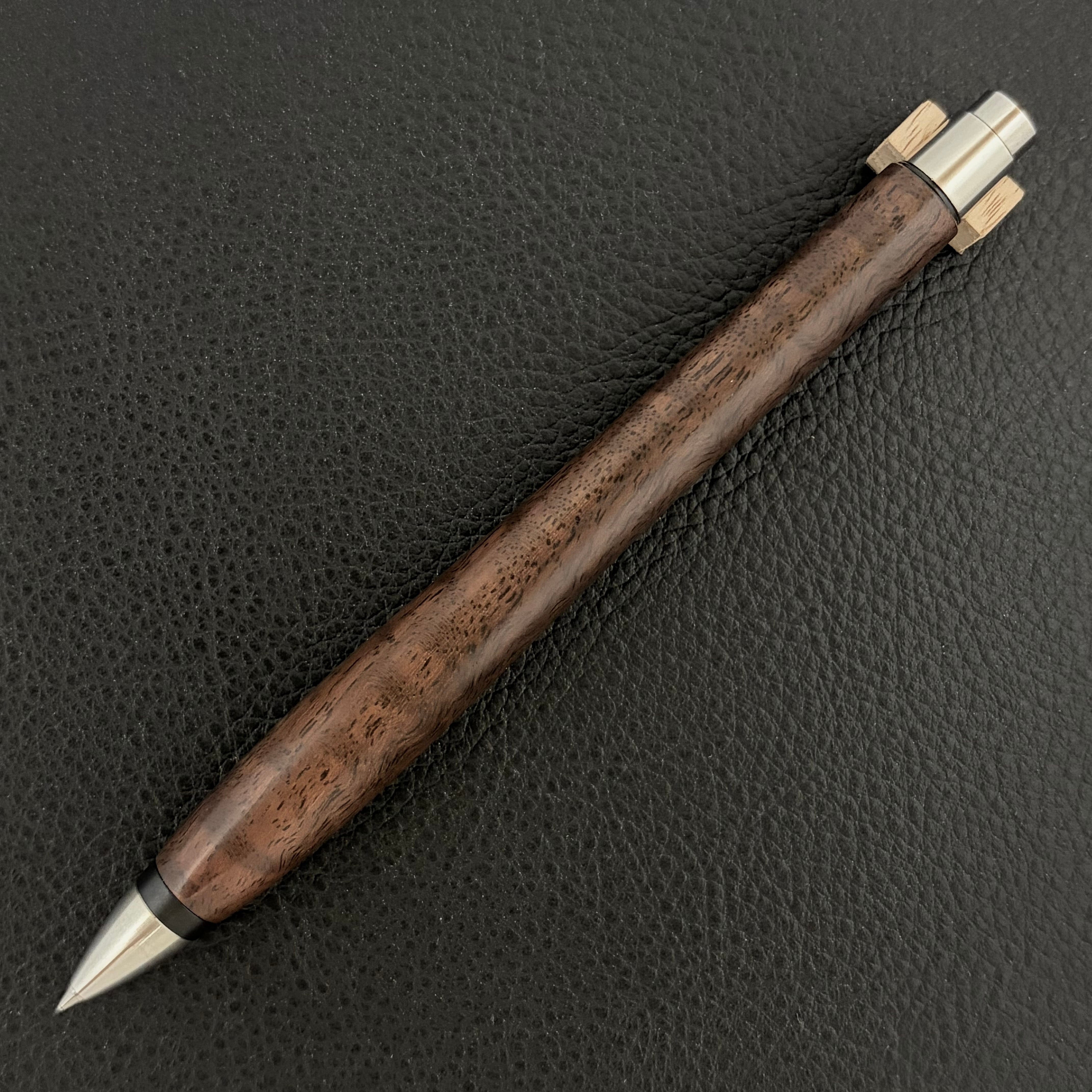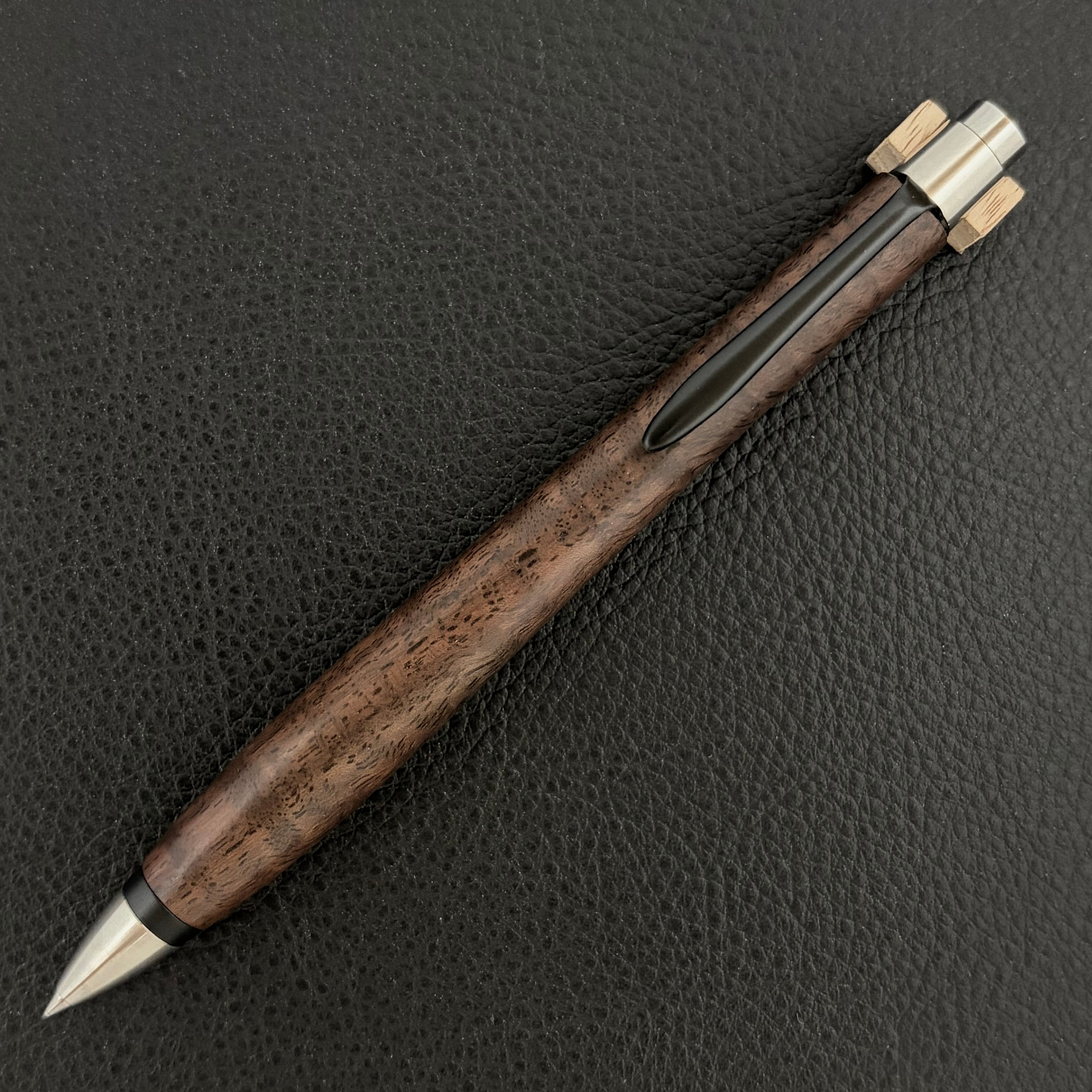 ボールペンのノックシステムは、ドイツ最高のクリックメカニズムを採用してあります。このメカニズムはユニークな機構のため、クリックしたときのカチカチ音が静かで、どんな場所でも気兼ねなく使うことができます。滑らかに動くこのプッシュ感覚を一度味わうと他には戻れなくなってしまうほどの魅力があります。 100分の1単位の加工精度で削り出されたペン先は、軸ブレも全くありません。