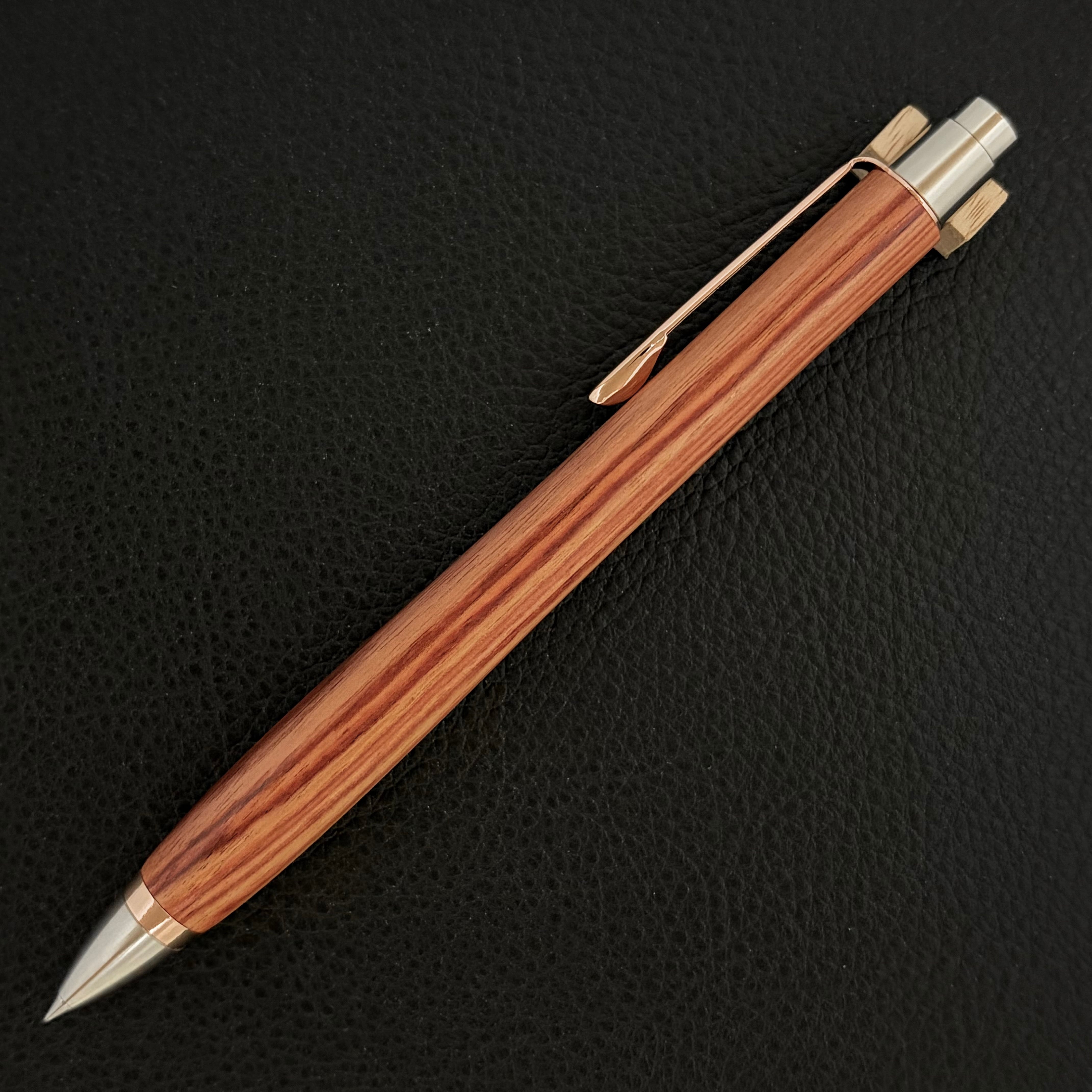 ボールペンのノックシステムは、ドイツ最高のクリックメカニズムを採用してあります。このメカニズムはユニークな機構のため、クリックしたときのカチカチ音が静かで、どんな場所でも気兼ねなく使うことができます。滑らかに動くこのプッシュ感覚を一度味わうと他には戻れなくなってしまうほどの魅力があります。 100分の1単位の加工精度で削り出されたペン先は、軸ブレも全くありません。