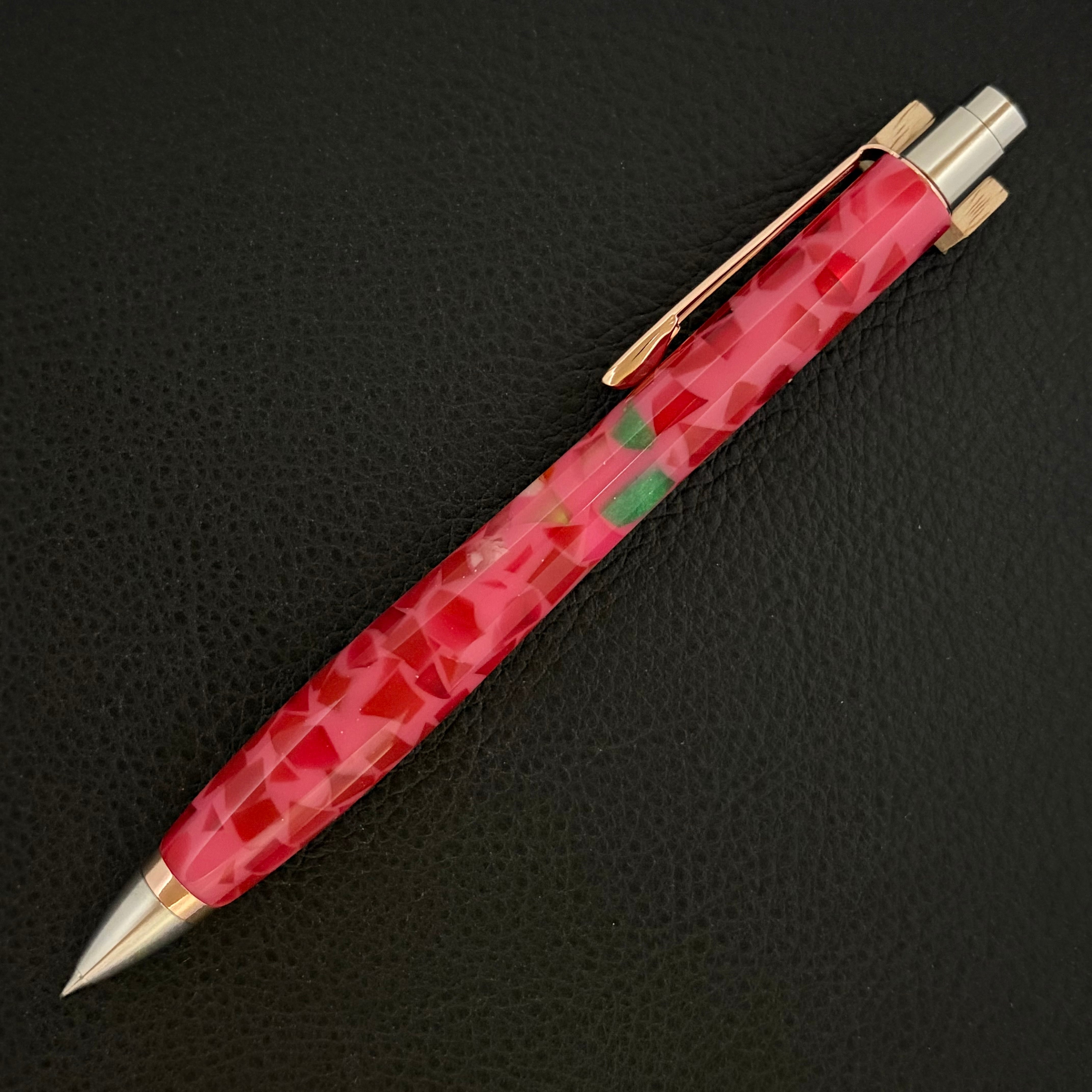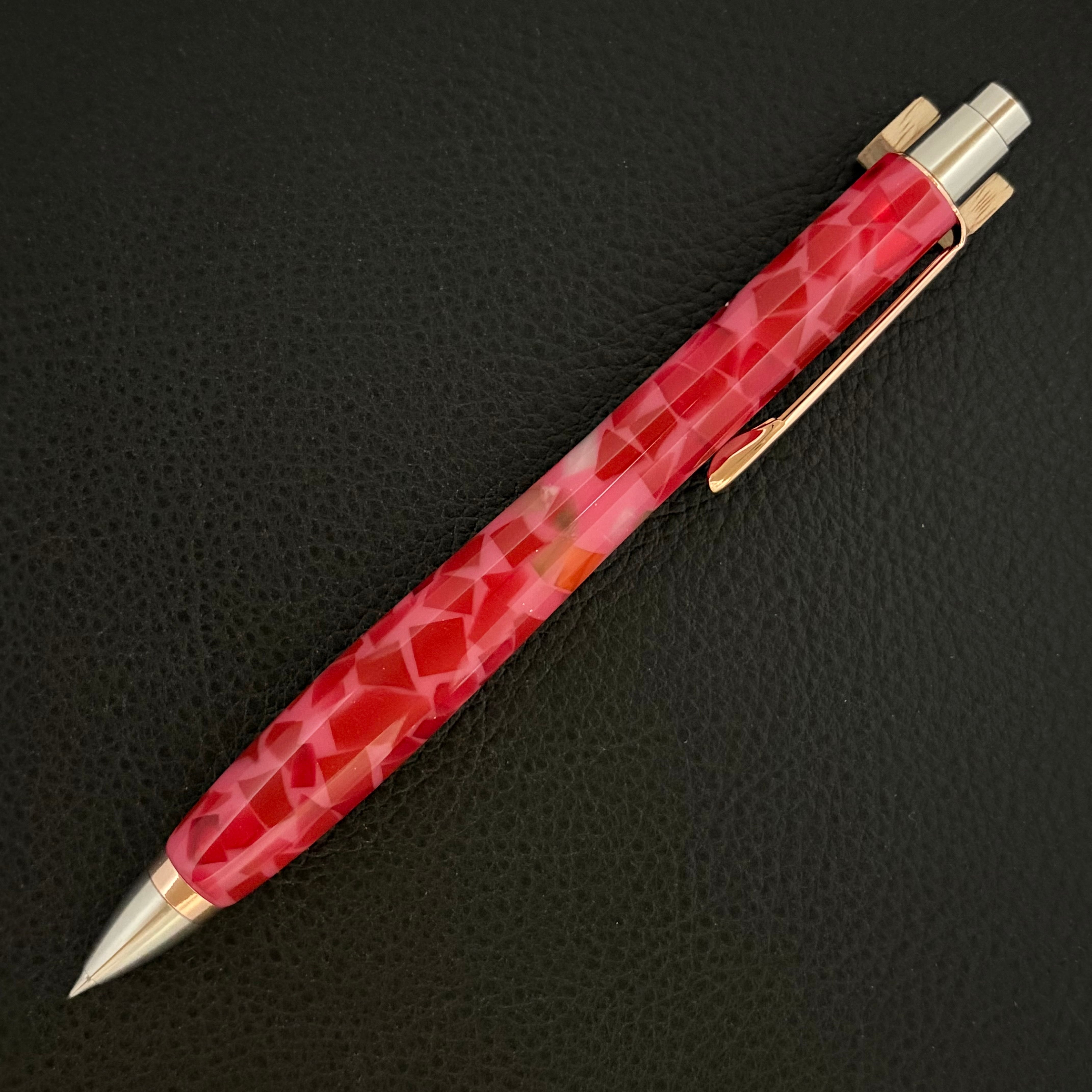 ボールペンのノックシステムは、ドイツ最高のクリックメカニズムを採用してあります。このメカニズムはユニークな機構のため、クリックしたときのカチカチ音が静かで、どんな場所でも気兼ねなく使うことができます。滑らかに動くこのプッシュ感覚を一度味わうと他には戻れなくなってしまうほどの魅力があります。 100分の1単位の加工精度で削り出されたペン先は、軸ブレも全くありません。