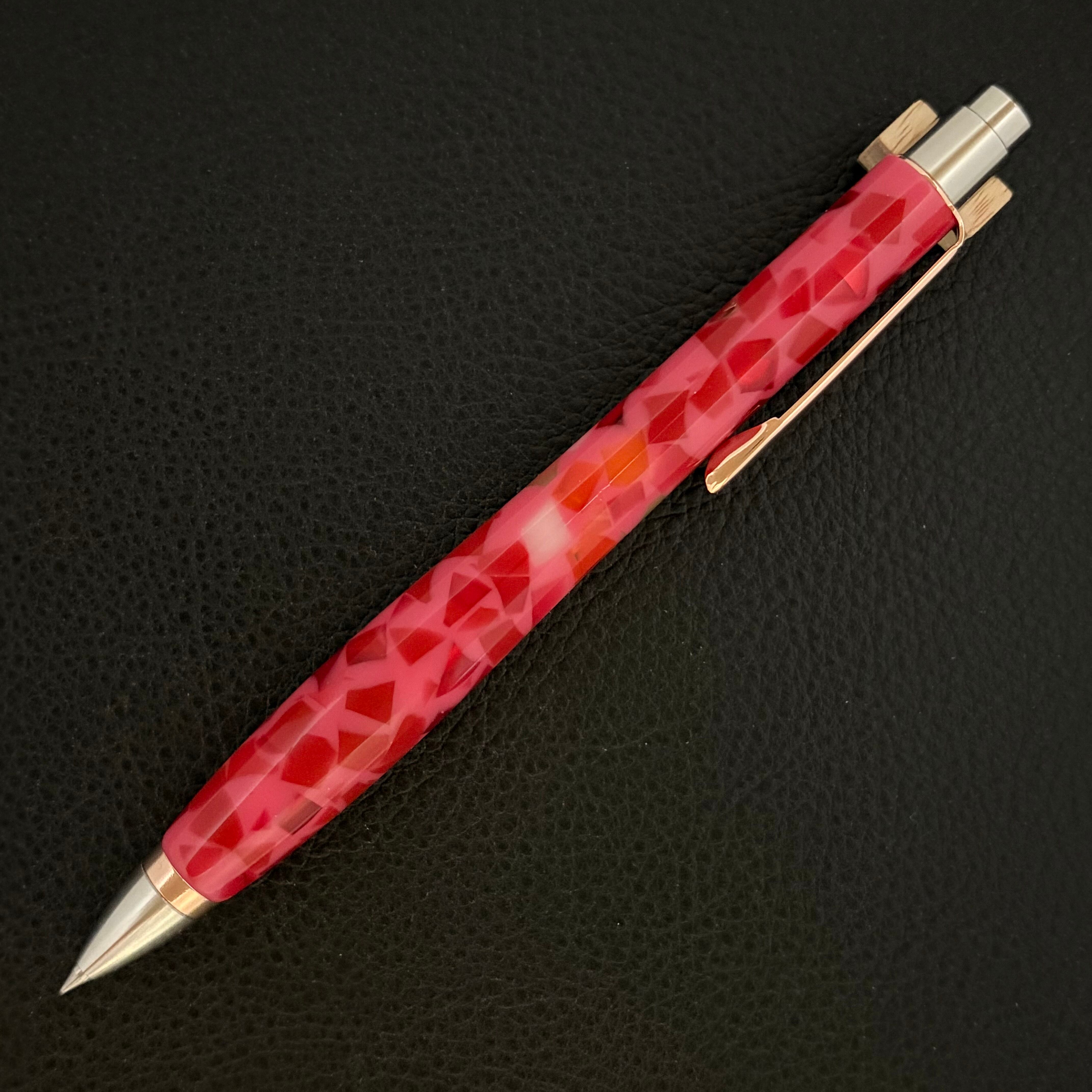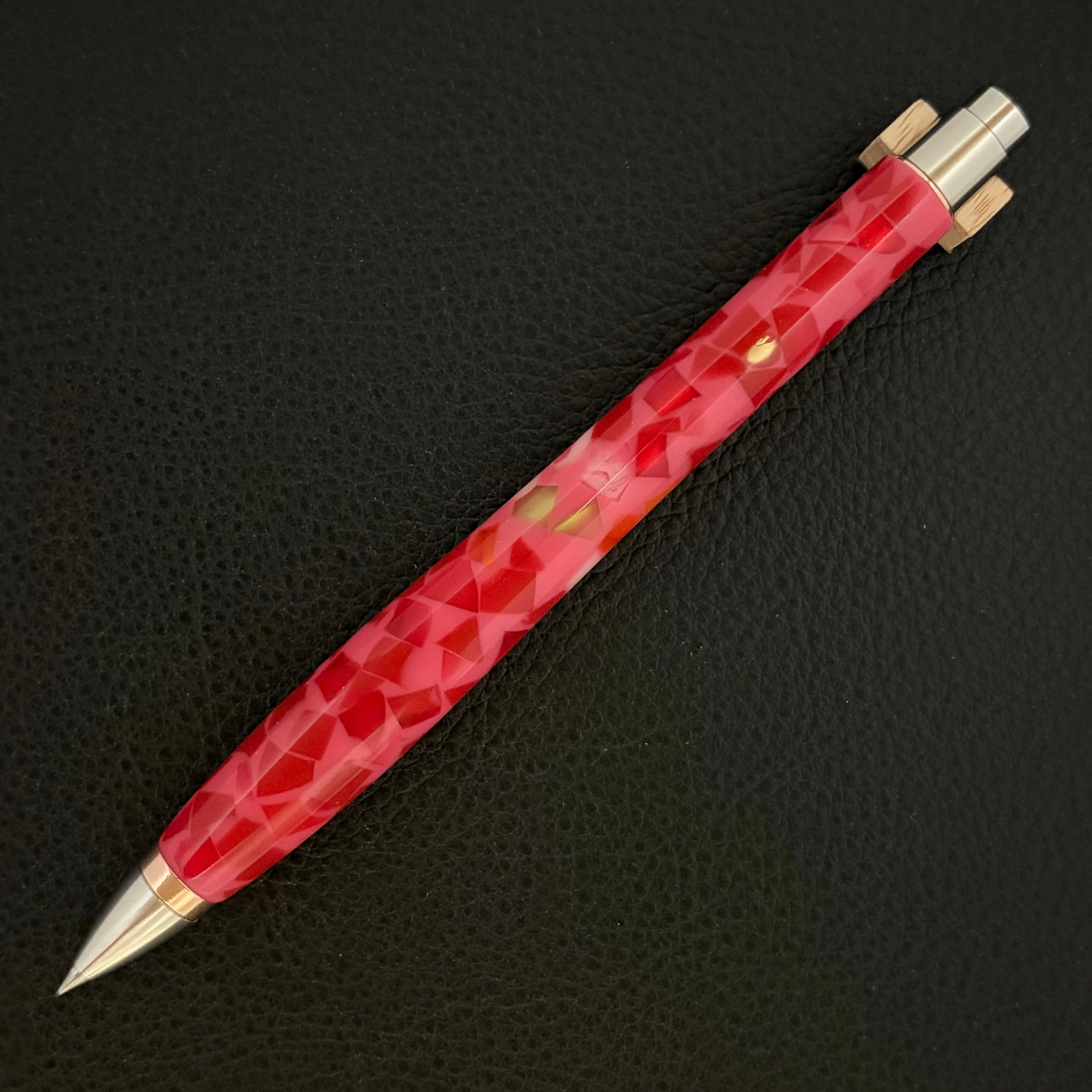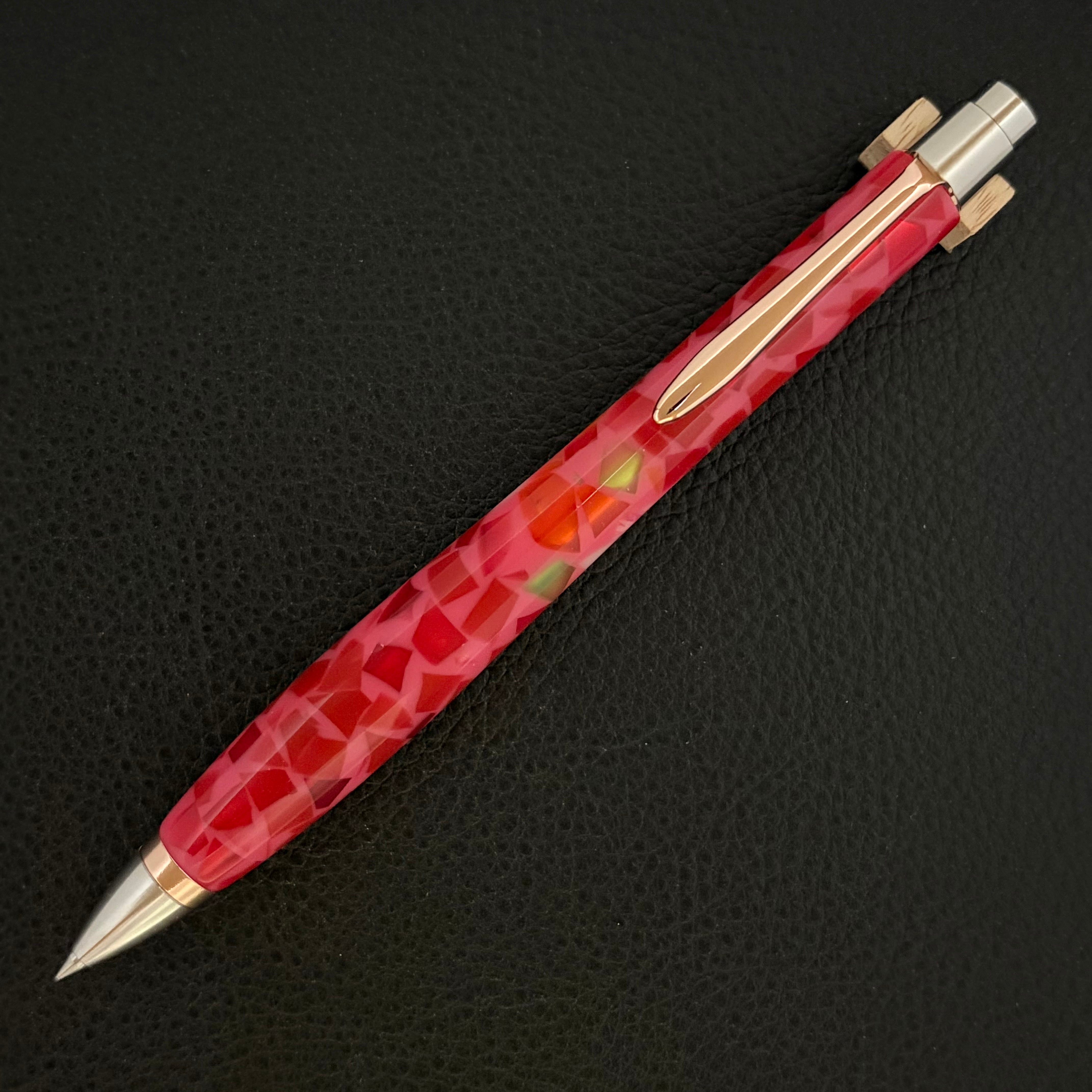 ボールペンのノックシステムは、ドイツ最高のクリックメカニズムを採用してあります。このメカニズムはユニークな機構のため、クリックしたときのカチカチ音が静かで、どんな場所でも気兼ねなく使うことができます。滑らかに動くこのプッシュ感覚を一度味わうと他には戻れなくなってしまうほどの魅力があります。 100分の1単位の加工精度で削り出されたペン先は、軸ブレも全くありません。
