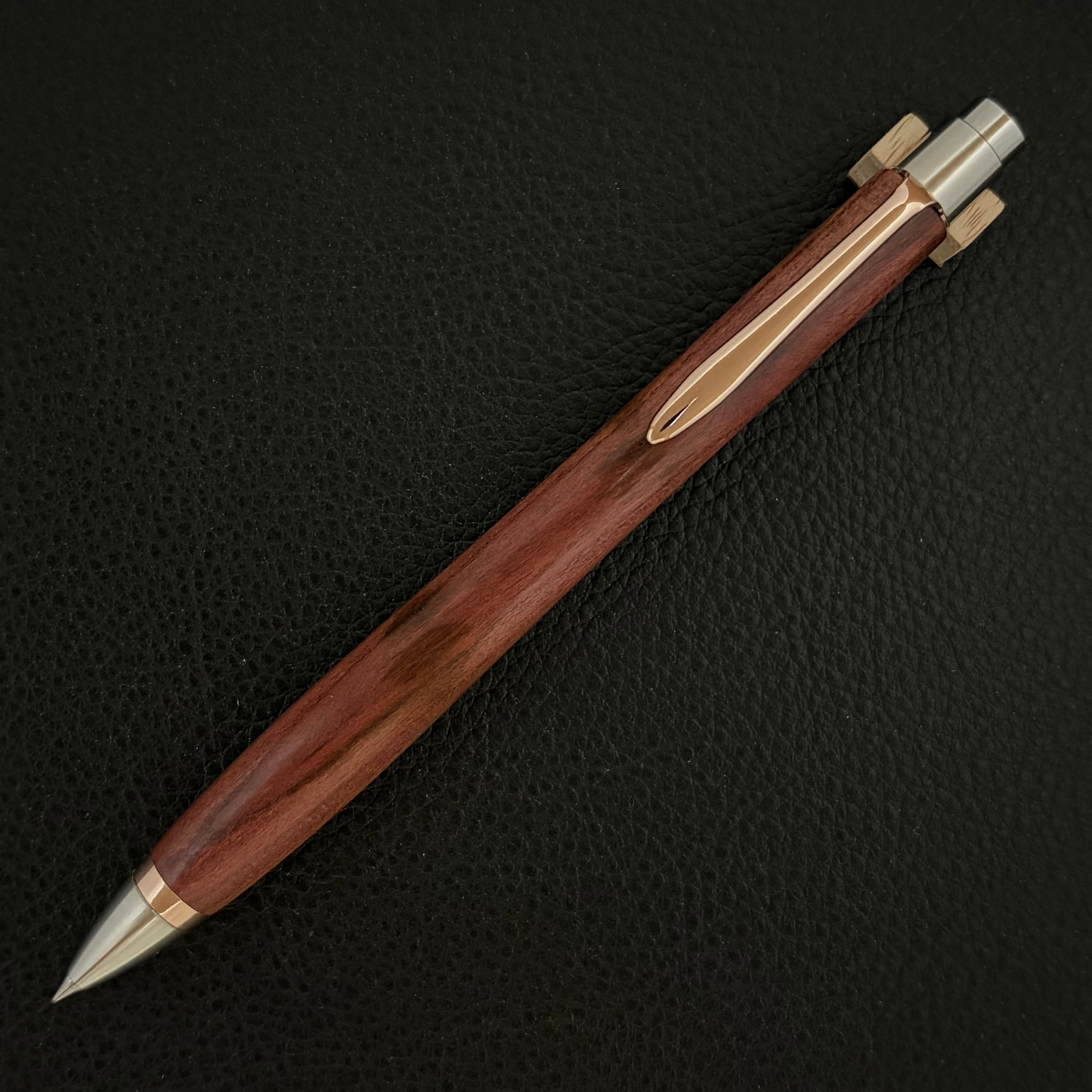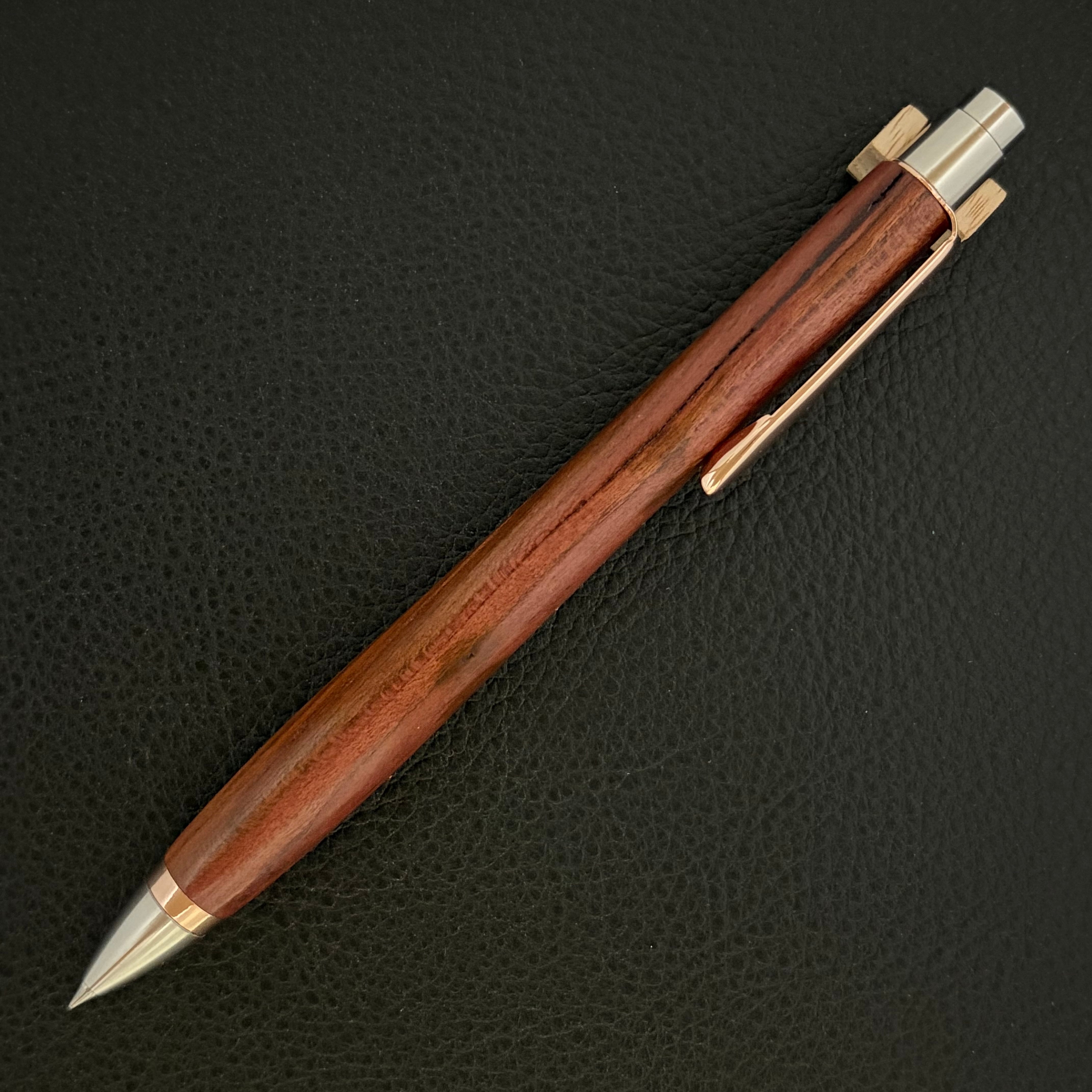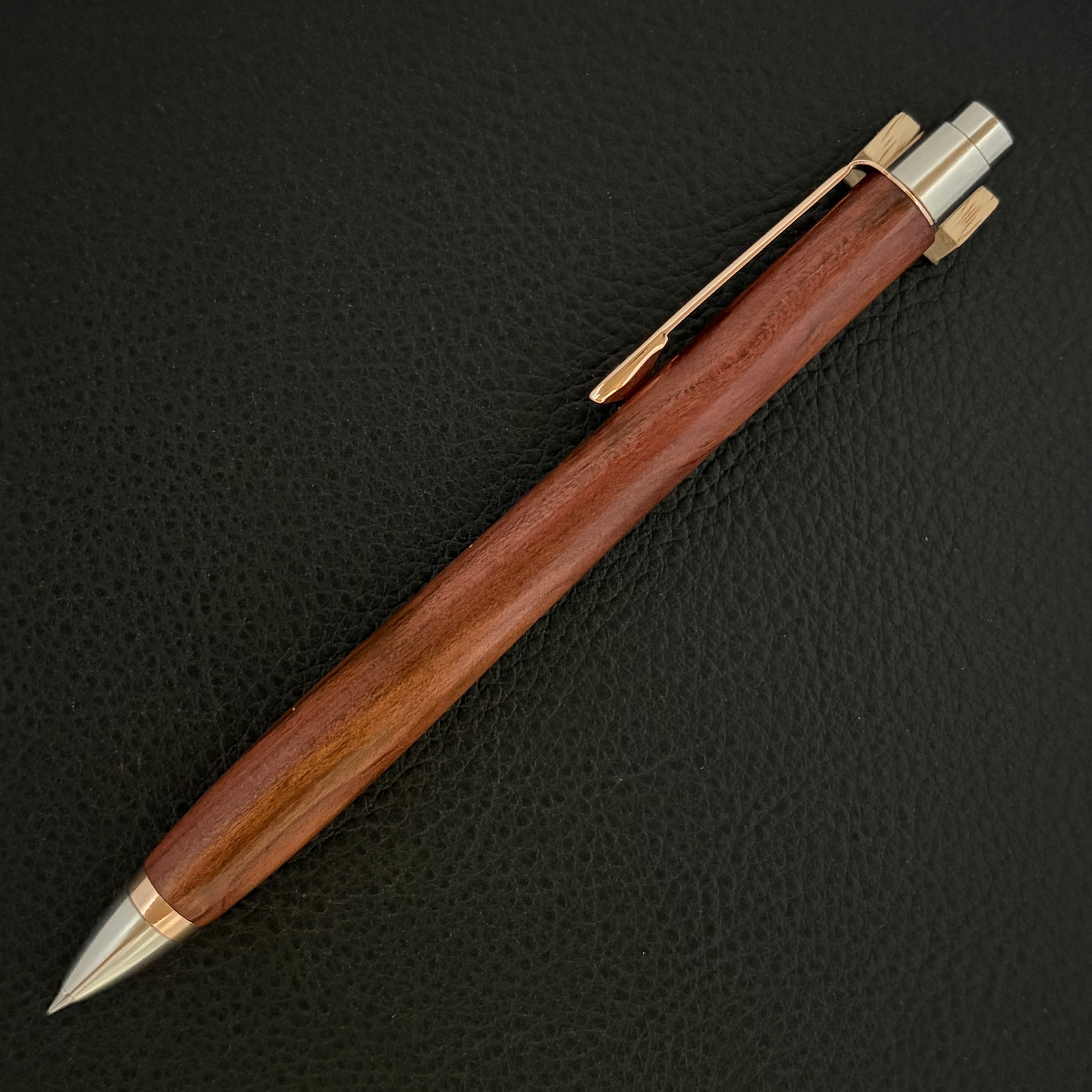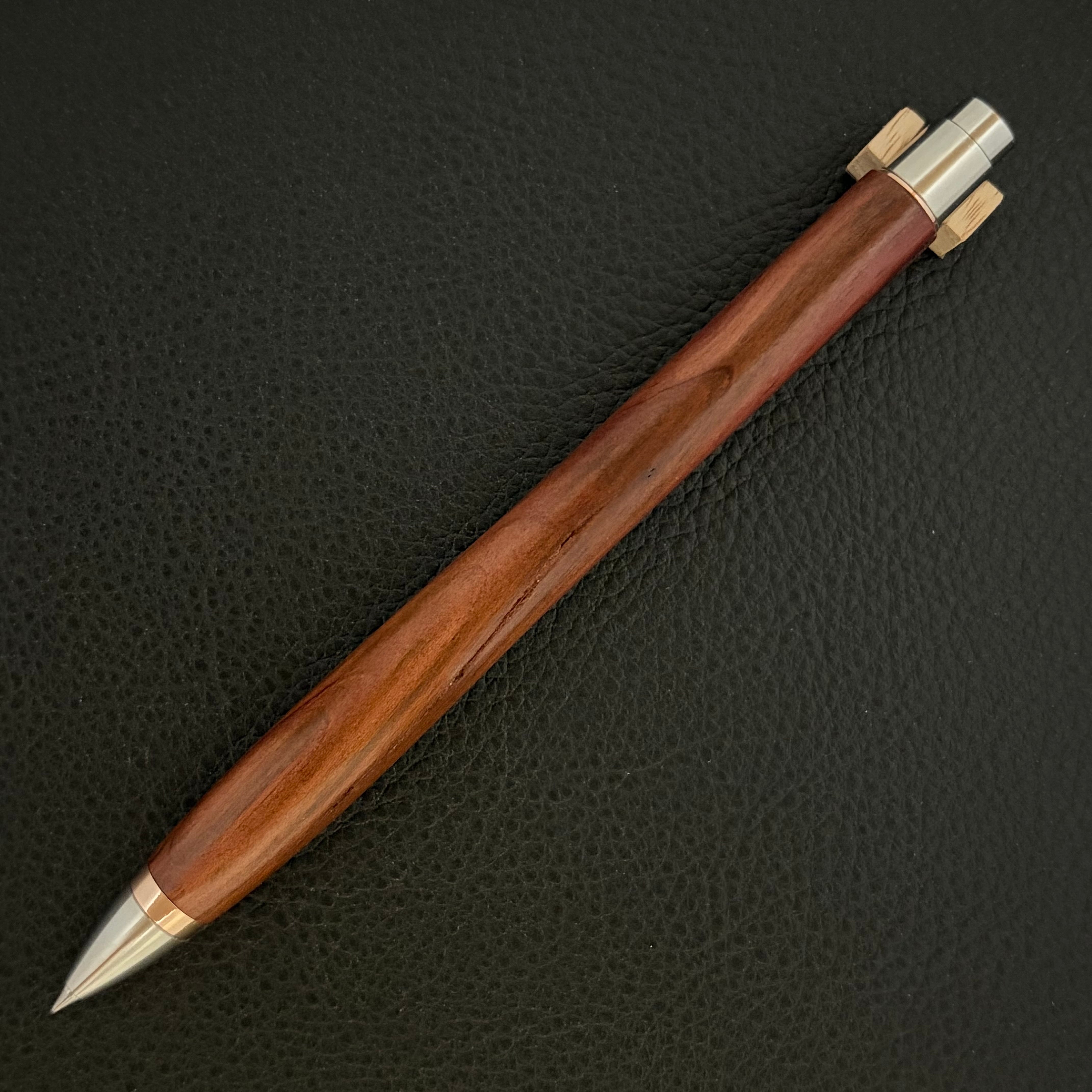 ボールペンのノックシステムは、ドイツ最高のクリックメカニズムを採用してあります。このメカニズムはユニークな機構のため、クリックしたときのカチカチ音が静かで、どんな場所でも気兼ねなく使うことができます。滑らかに動くこのプッシュ感覚を一度味わうと他には戻れなくなってしまうほどの魅力があります。 100分の1単位の加工精度で削り出されたペン先は、軸ブレも全くありません。