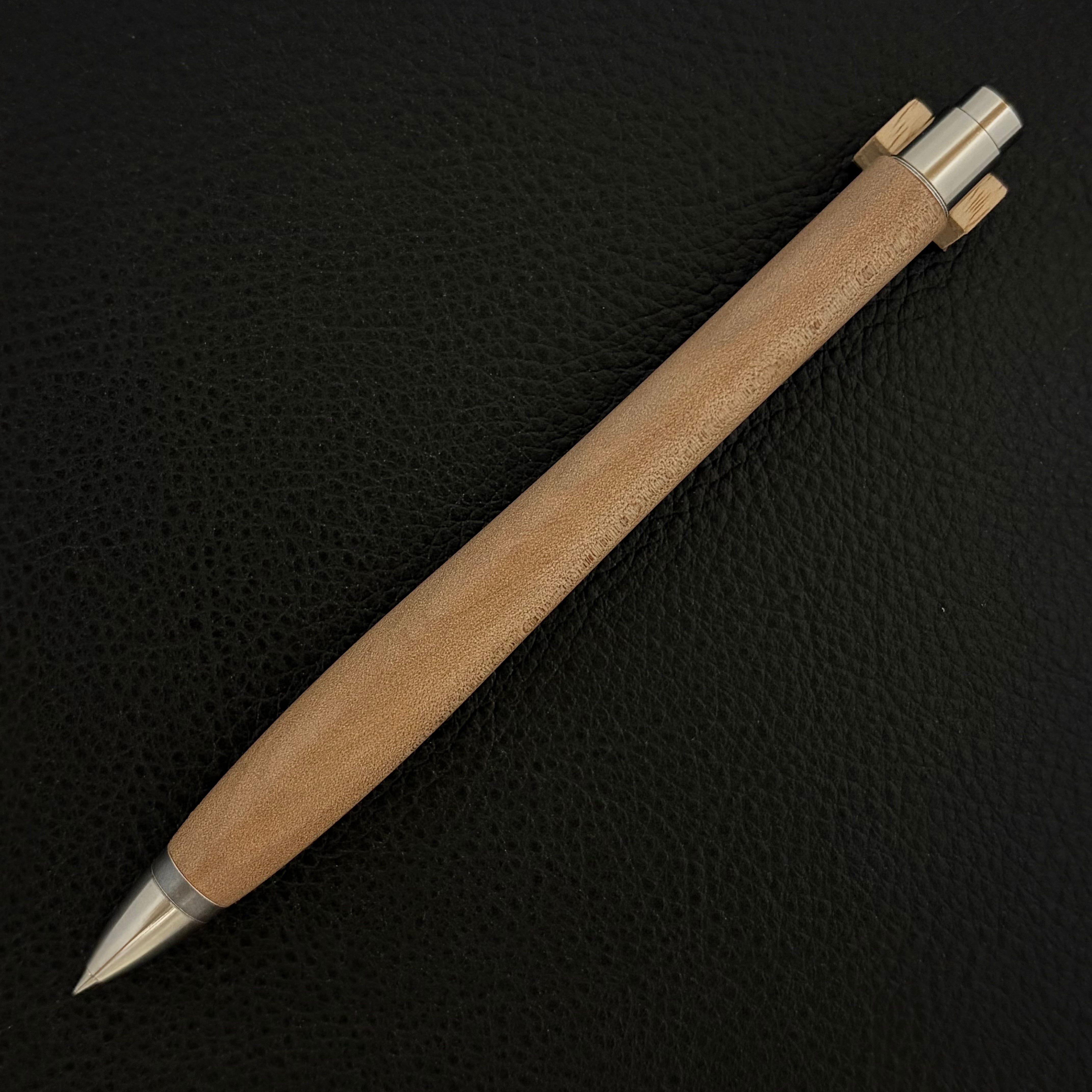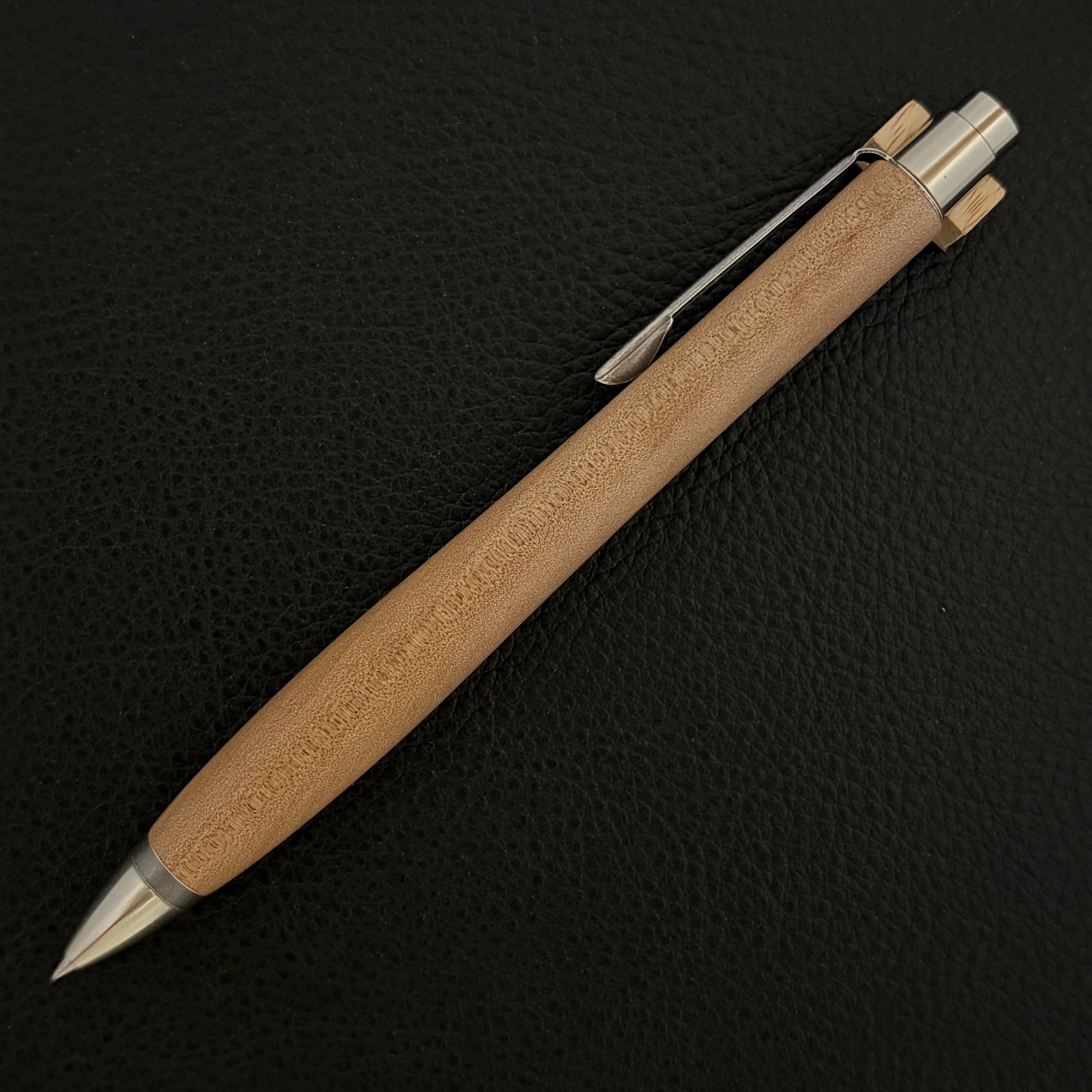 ボールペンのノックシステムは、ドイツ最高のクリックメカニズムを採用してあります。このメカニズムはユニークな機構のため、クリックしたときのカチカチ音が静かで、どんな場所でも気兼ねなく使うことができます。滑らかに動くこのプッシュ感覚を一度味わうと他には戻れなくなってしまうほどの魅力があります。 100分の1単位の加工精度で削り出されたペン先は、軸ブレも全くありません。