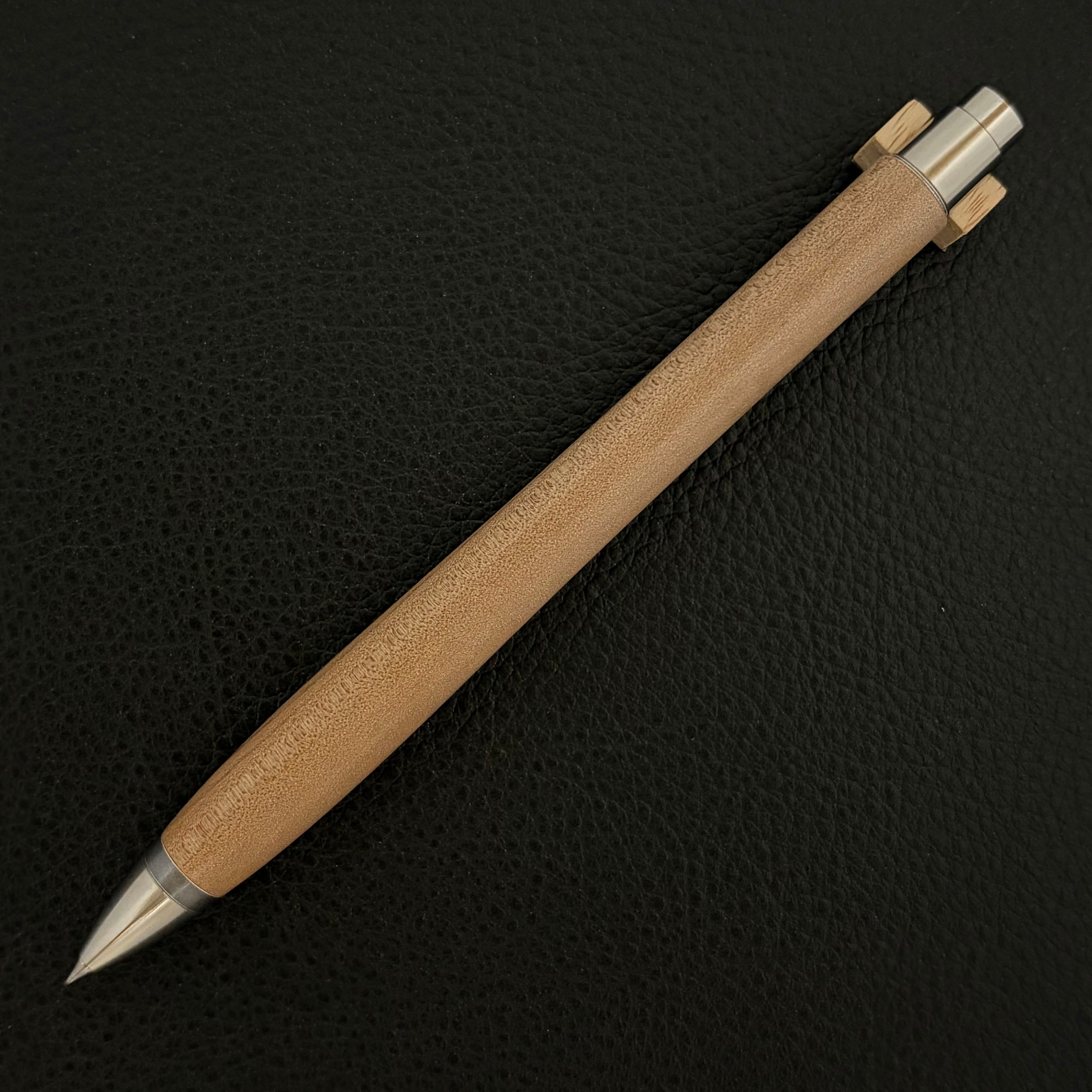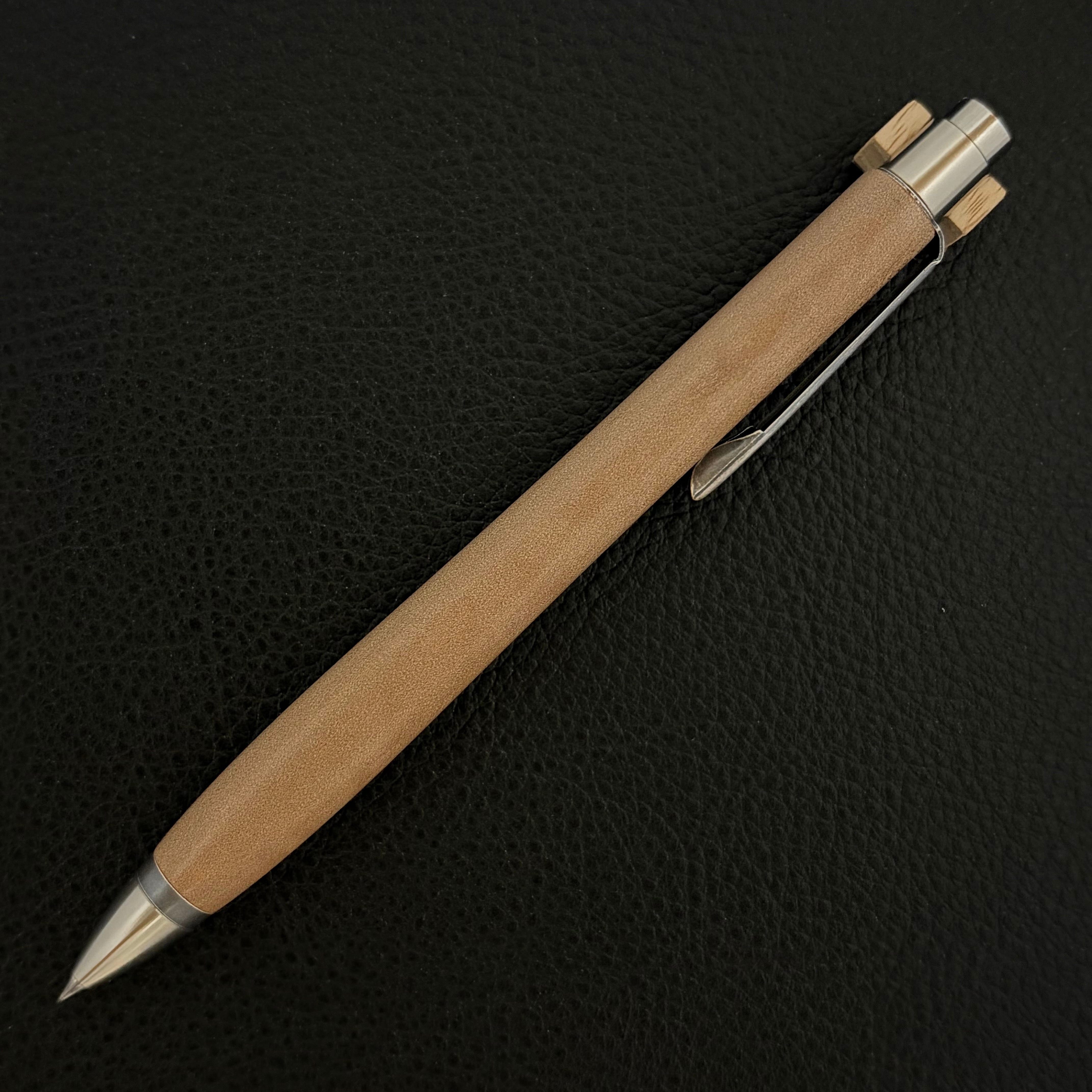 ボールペンのノックシステムは、ドイツ最高のクリックメカニズムを採用してあります。このメカニズムはユニークな機構のため、クリックしたときのカチカチ音が静かで、どんな場所でも気兼ねなく使うことができます。滑らかに動くこのプッシュ感覚を一度味わうと他には戻れなくなってしまうほどの魅力があります。 100分の1単位の加工精度で削り出されたペン先は、軸ブレも全くありません。