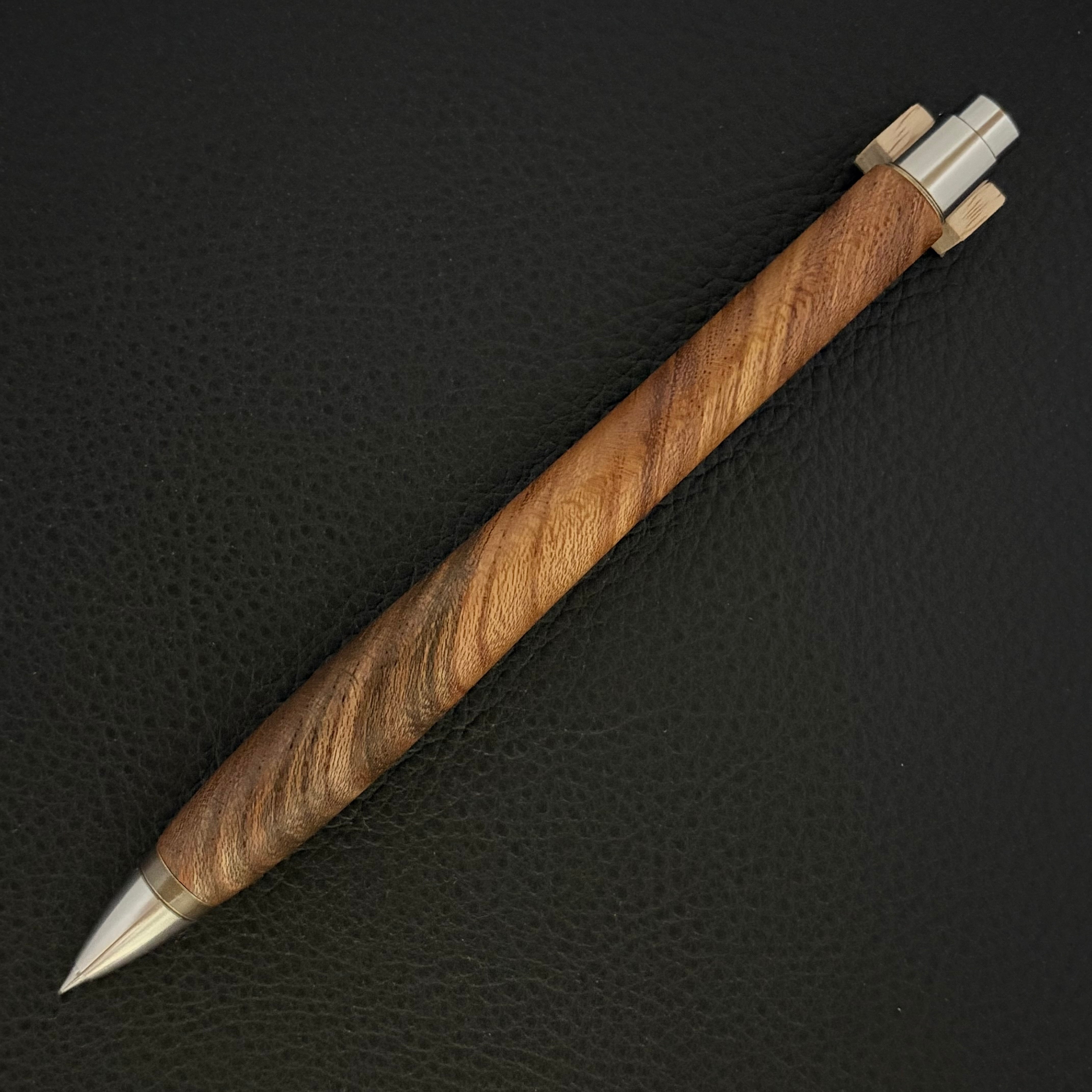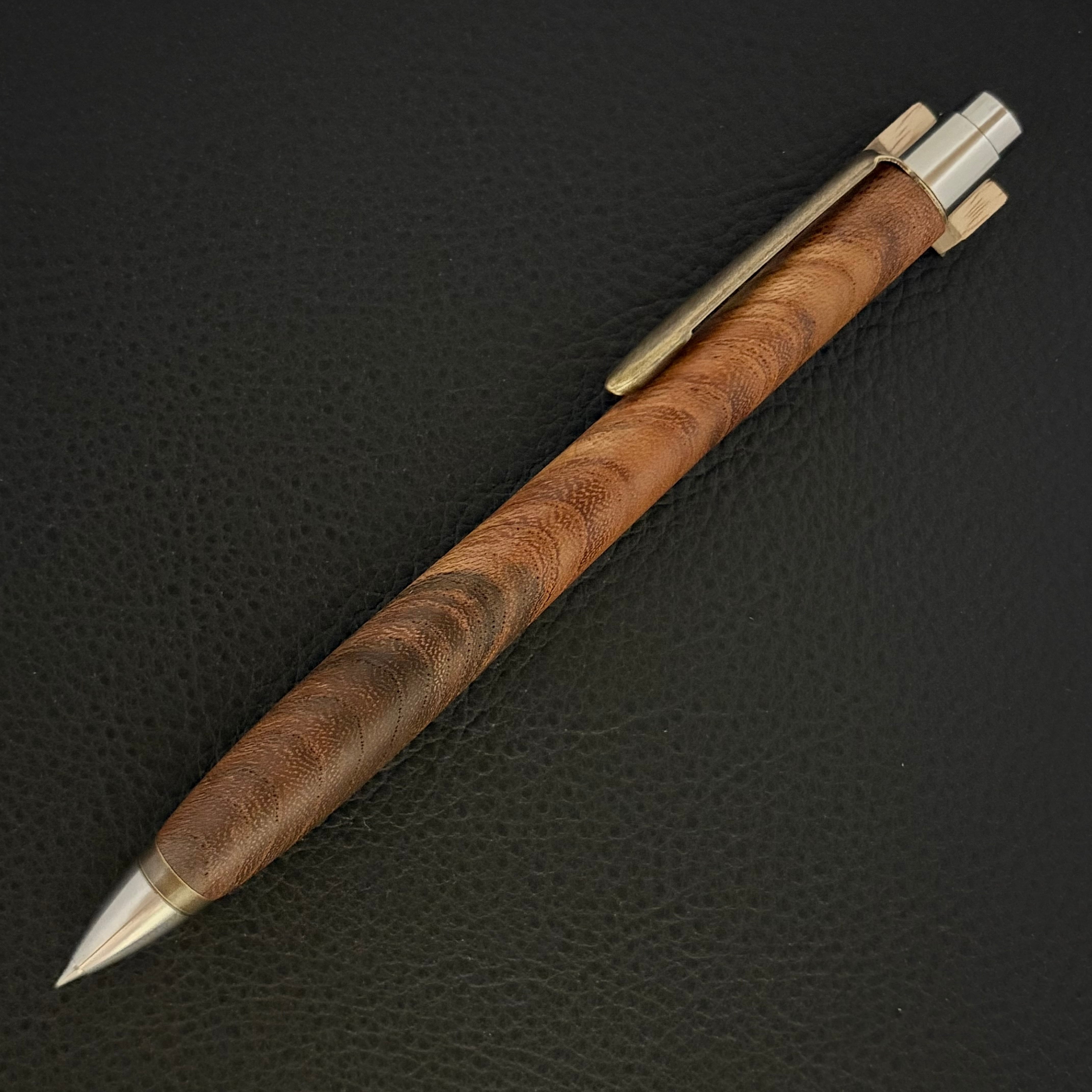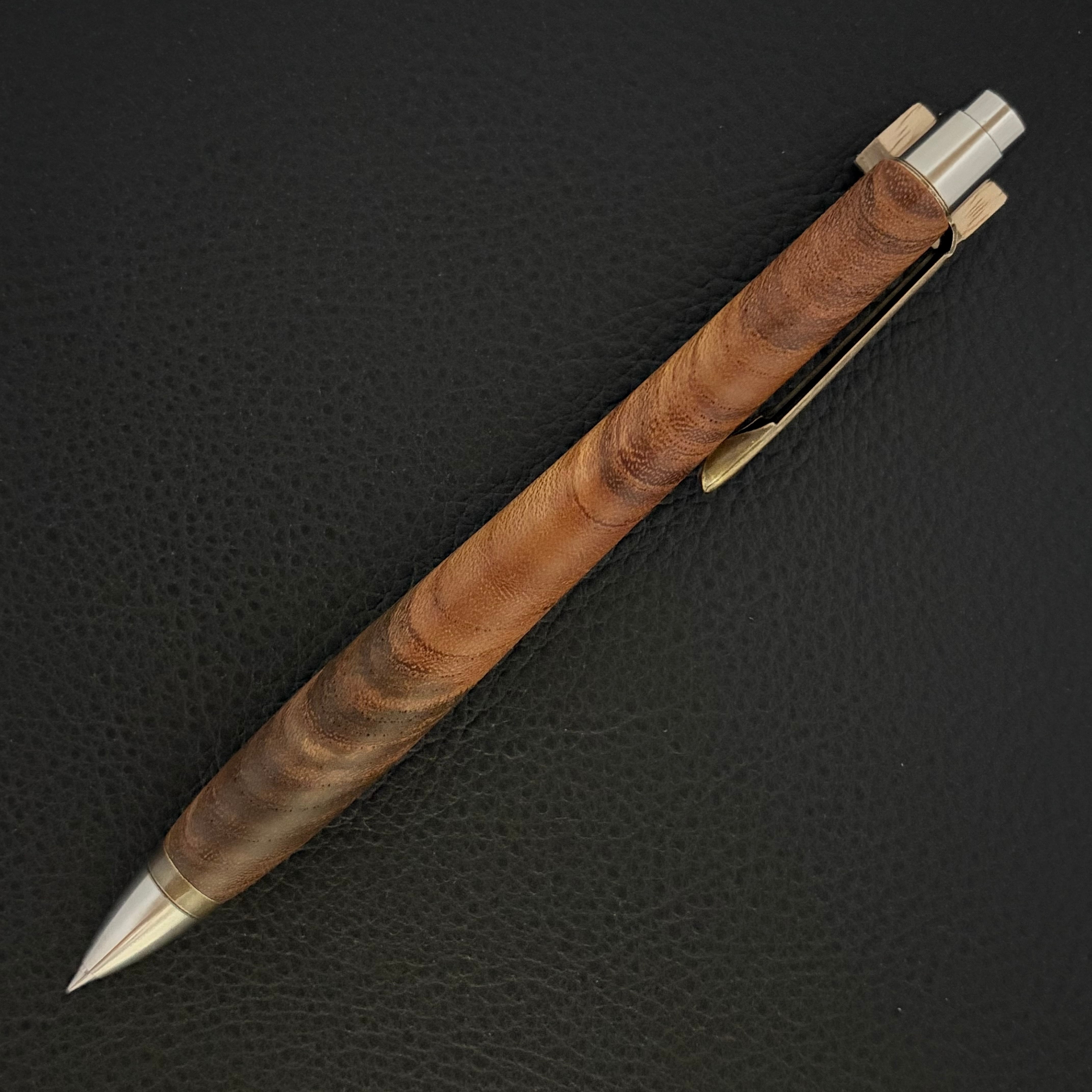ボールペンのノックシステムは、ドイツ最高のクリックメカニズムを採用してあります。このメカニズムはユニークな機構のため、クリックしたときのカチカチ音が静かで、どんな場所でも気兼ねなく使うことができます。滑らかに動くこのプッシュ感覚を一度味わうと他には戻れなくなってしまうほどの魅力があります。 100分の1単位の加工精度で削り出されたペン先は、軸ブレも全くありません。
