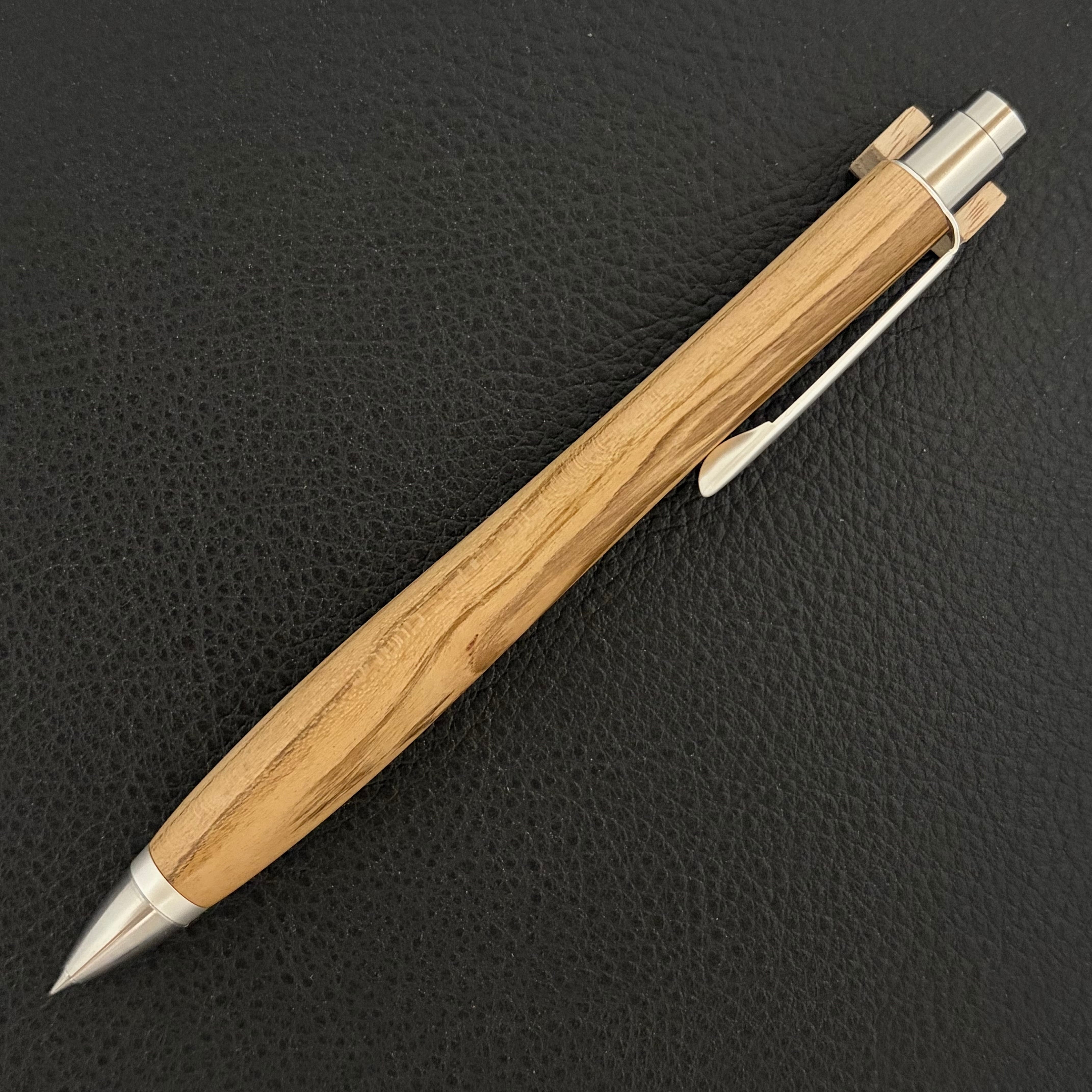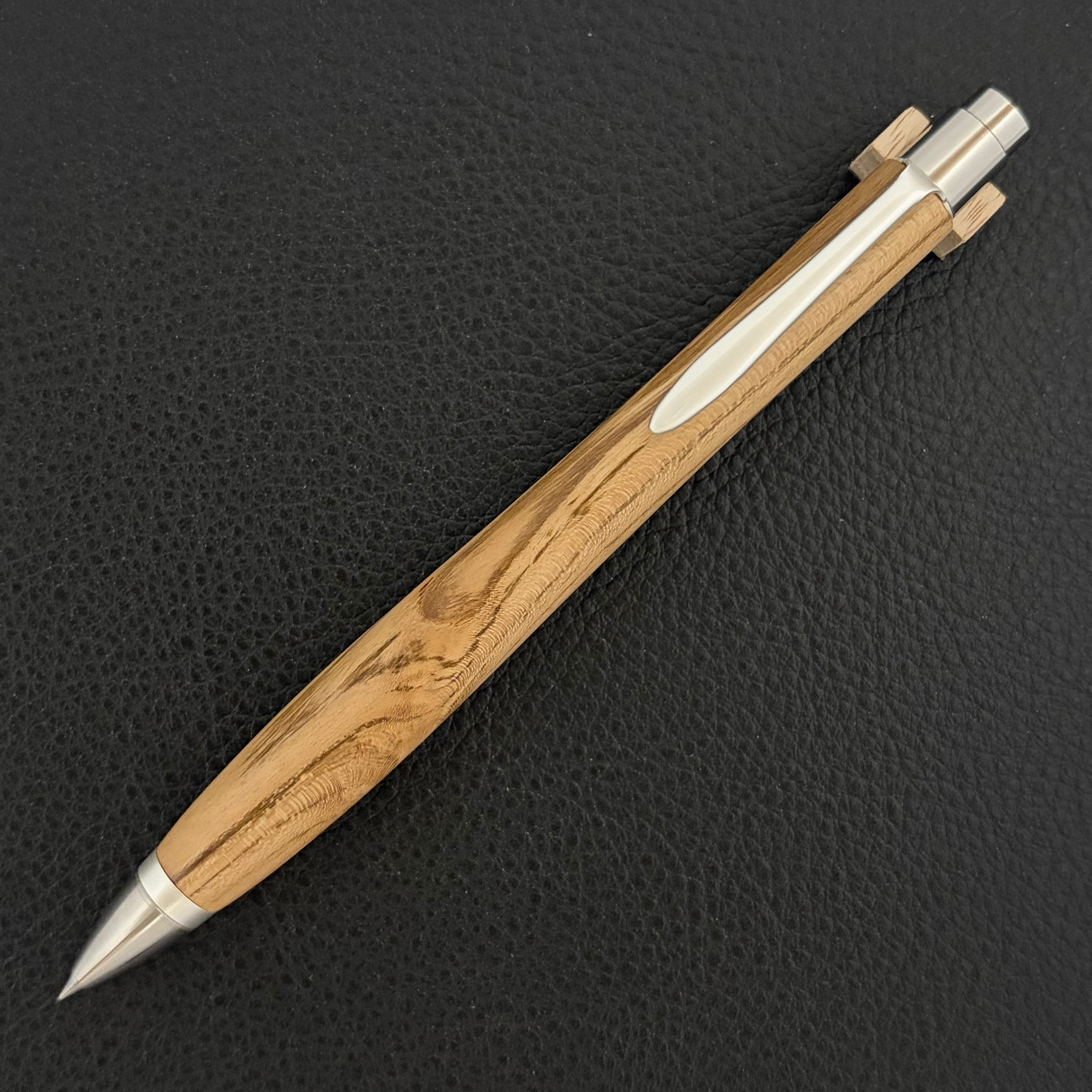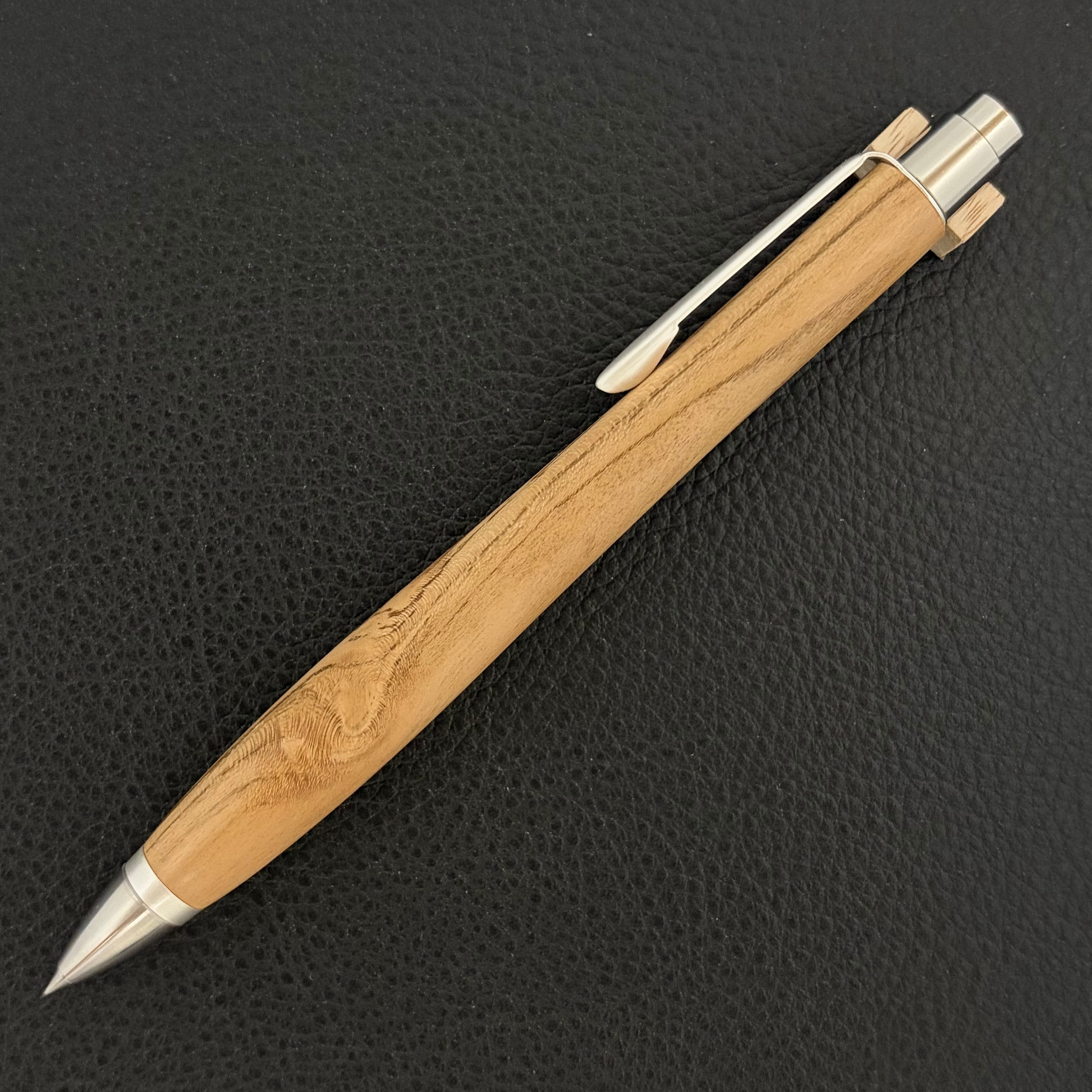 ボールペンのノックシステムは、ドイツ最高のクリックメカニズムを採用してあります。このメカニズムはユニークな機構のため、クリックしたときのカチカチ音が静かで、どんな場所でも気兼ねなく使うことができます。滑らかに動くこのプッシュ感覚を一度味わうと他には戻れなくなってしまうほどの魅力があります。 100分の1単位の加工精度で削り出されたペン先は、軸ブレも全くありません。