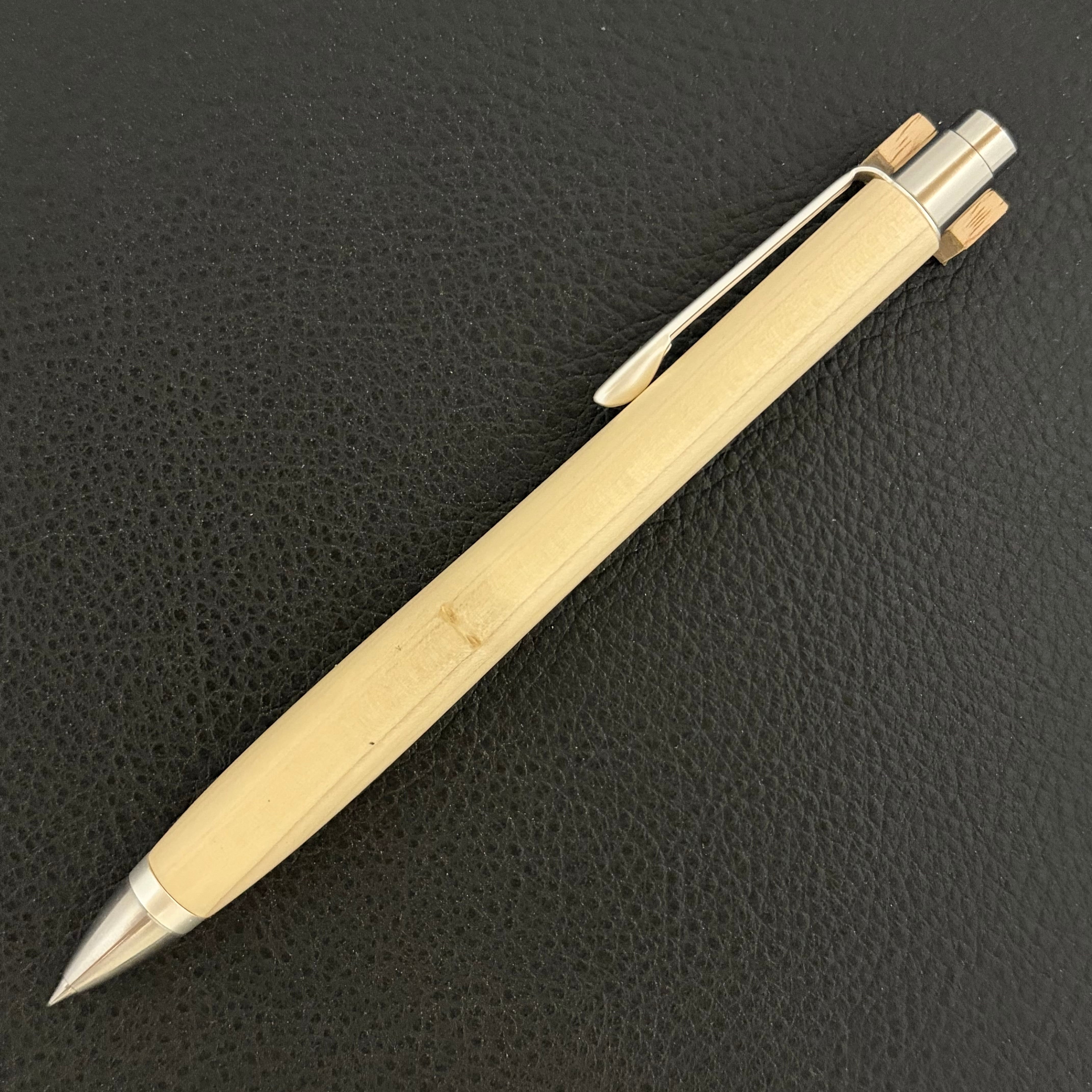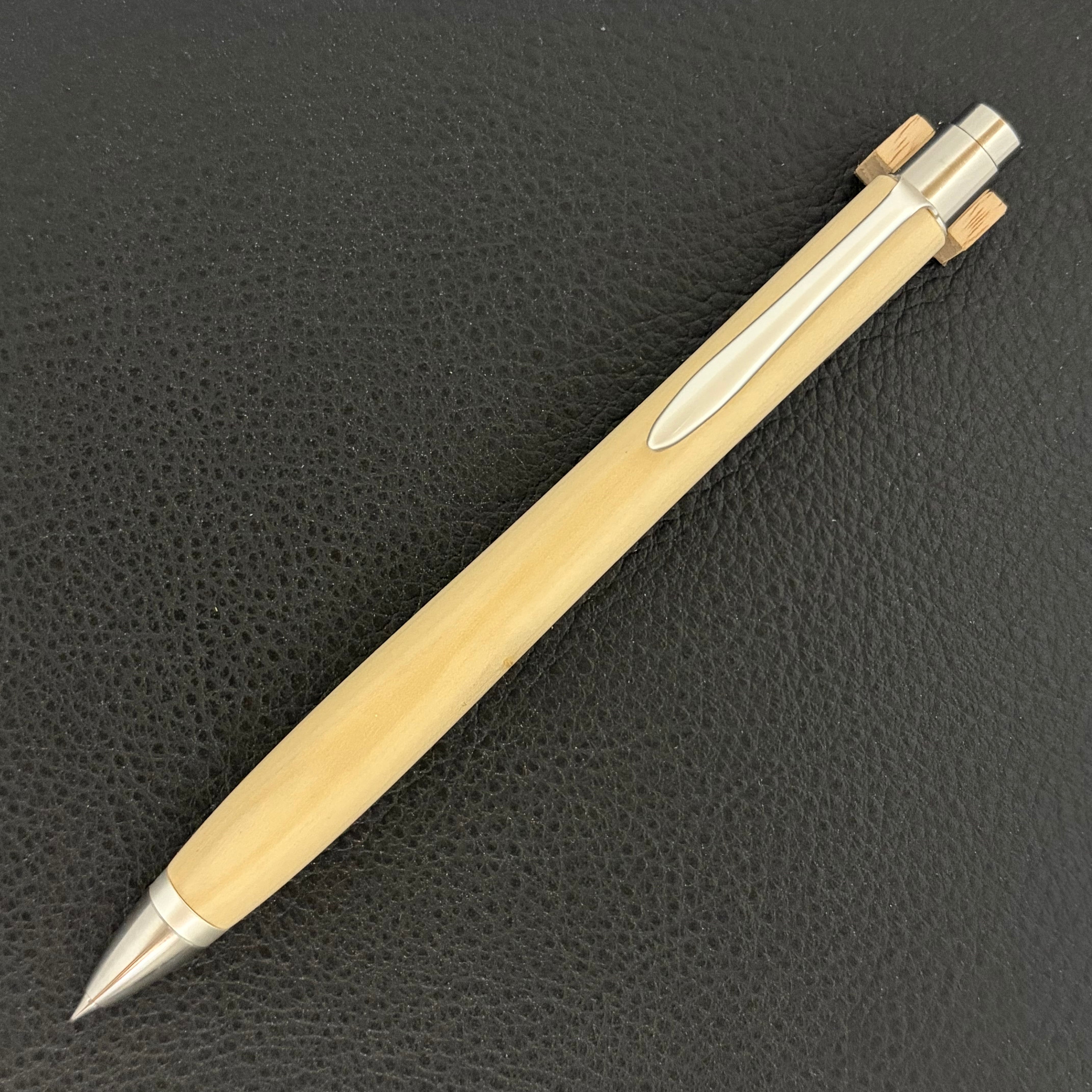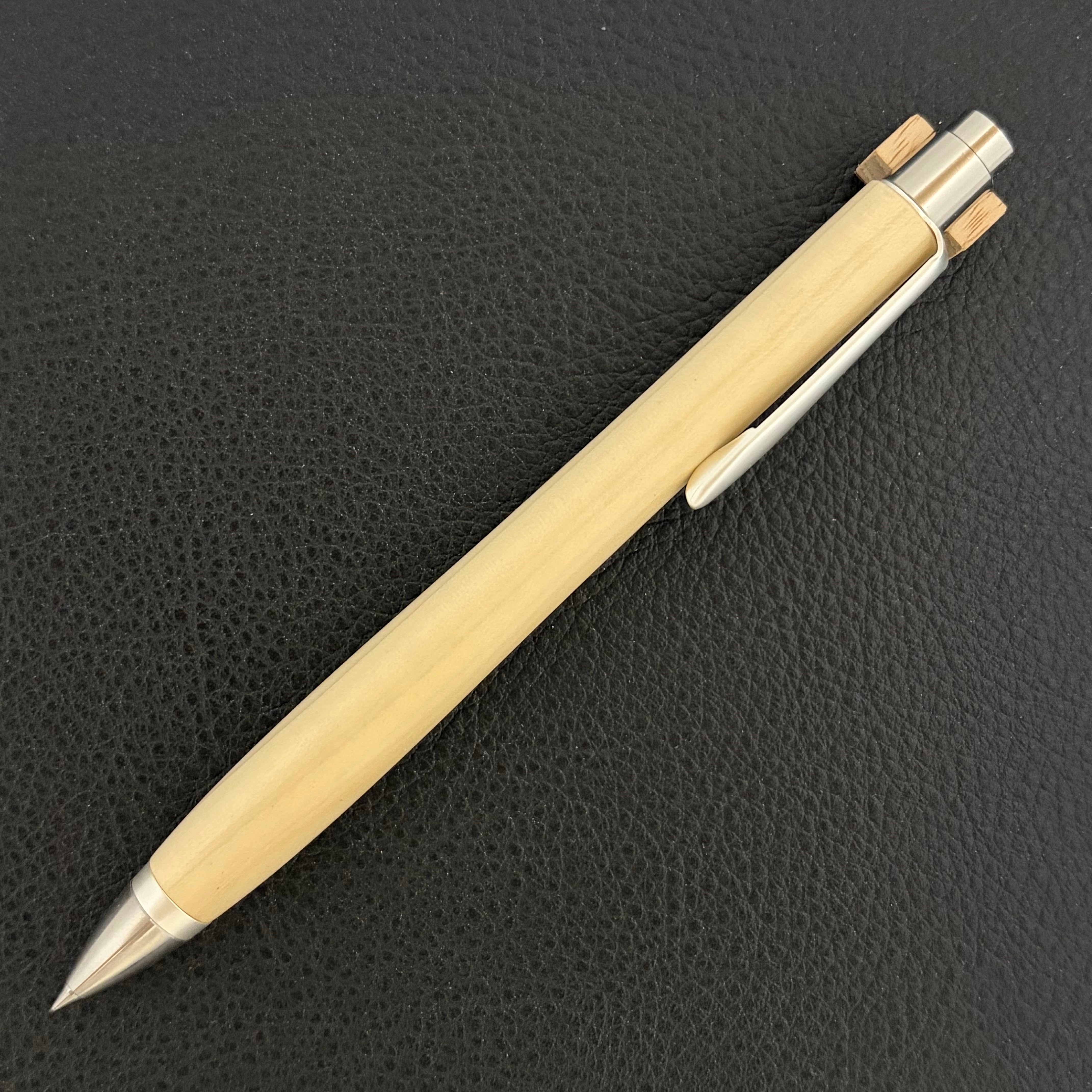 ボールペンのノックシステムは、ドイツ最高のクリックメカニズムを採用してあります。このメカニズムはユニークな機構のため、クリックしたときのカチカチ音が静かで、どんな場所でも気兼ねなく使うことができます。滑らかに動くこのプッシュ感覚を一度味わうと他には戻れなくなってしまうほどの魅力があります。 100分の1単位の加工精度で削り出されたペン先は、軸ブレも全くありません。
