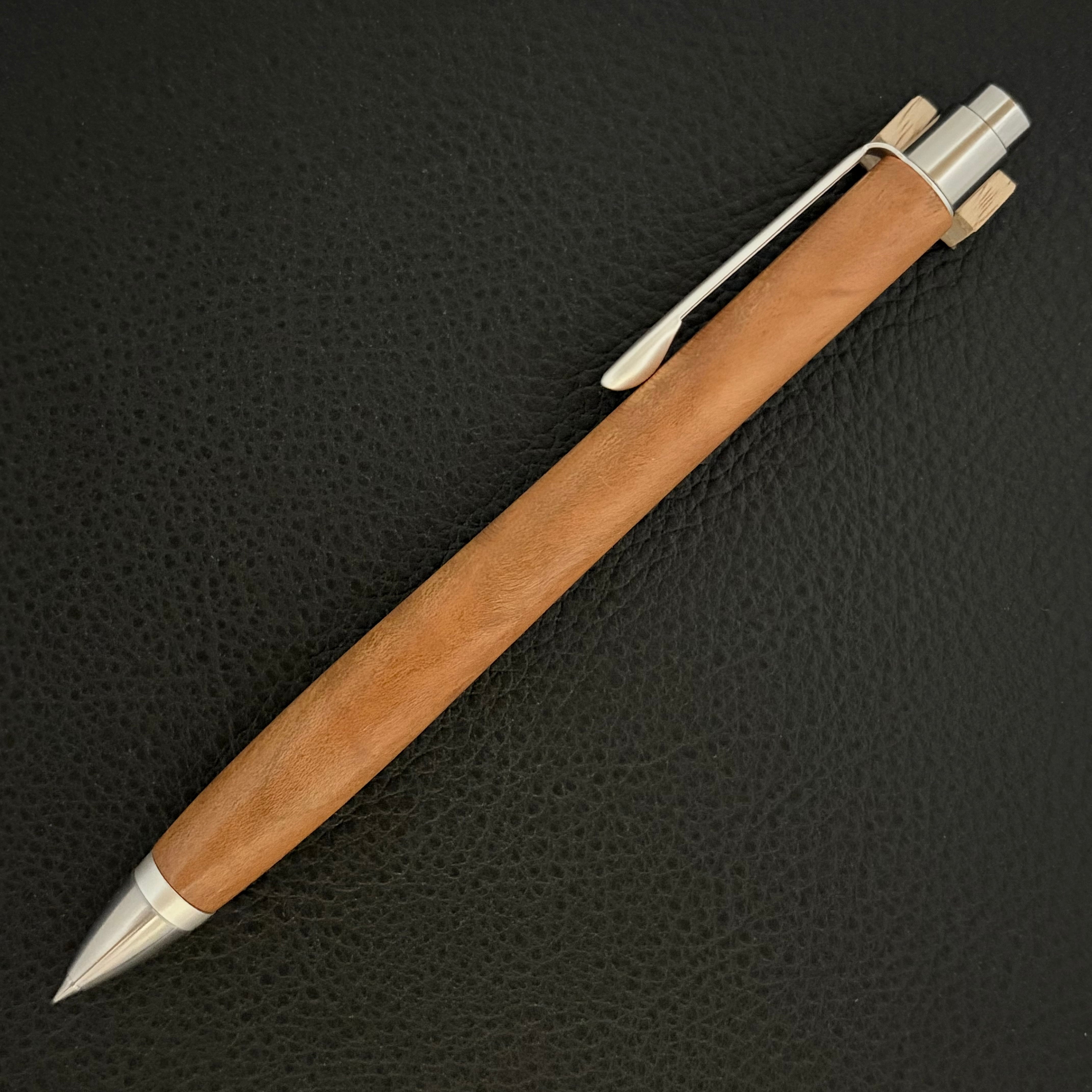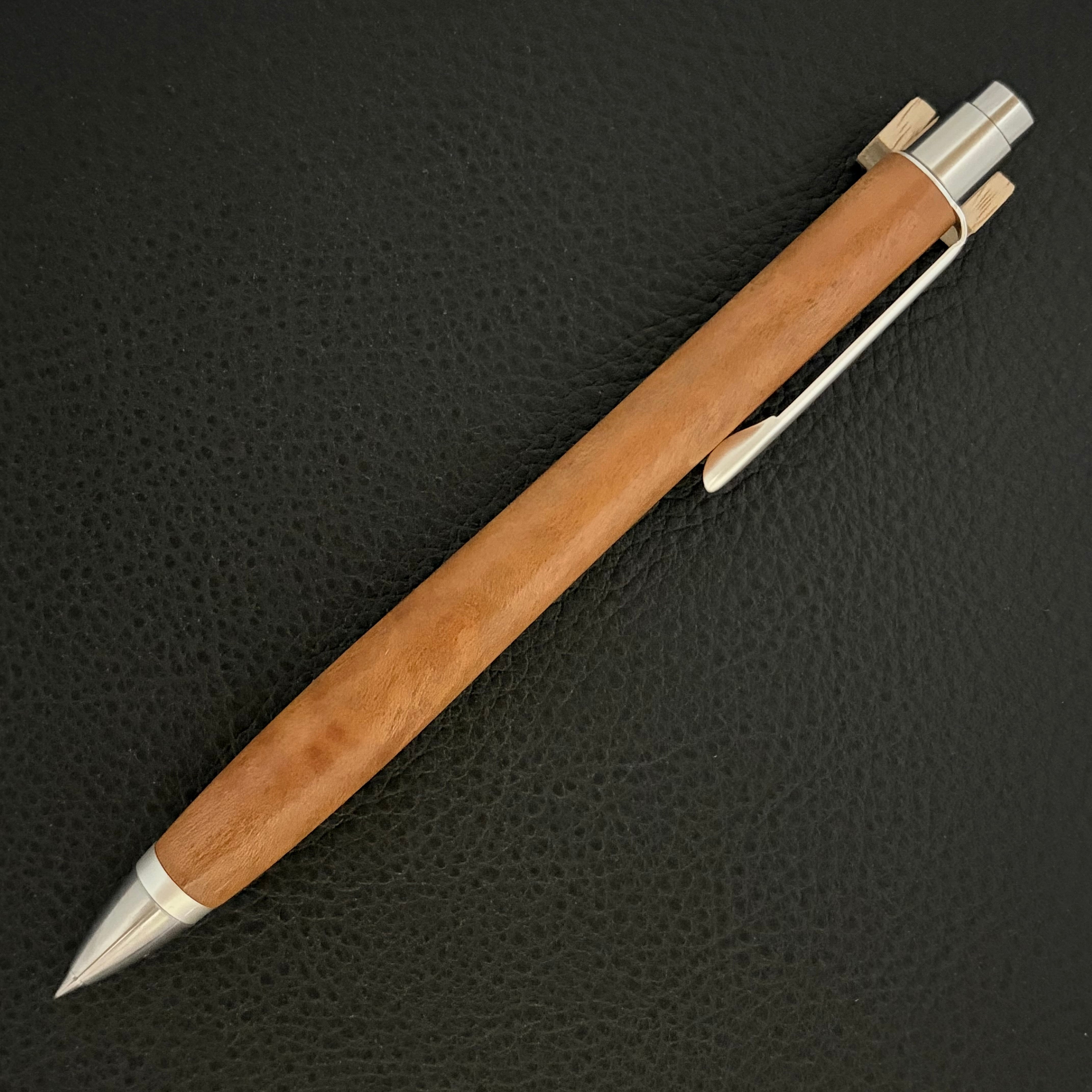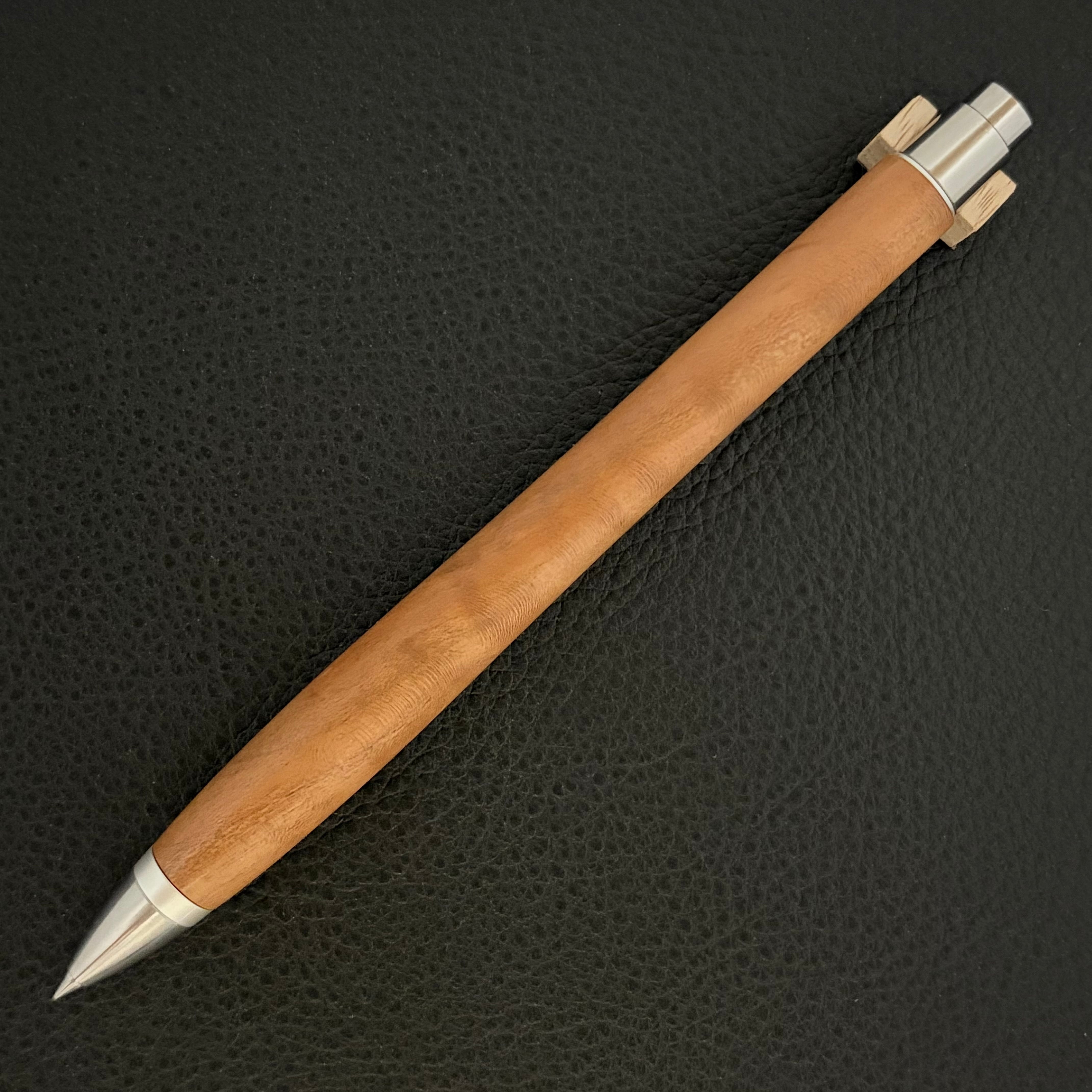 ボールペンのノックシステムは、ドイツ最高のクリックメカニズムを採用してあります。このメカニズムはユニークな機構のため、クリックしたときのカチカチ音が静かで、どんな場所でも気兼ねなく使うことができます。滑らかに動くこのプッシュ感覚を一度味わうと他には戻れなくなってしまうほどの魅力があります。 100分の1単位の加工精度で削り出されたペン先は、軸ブレも全くありません。