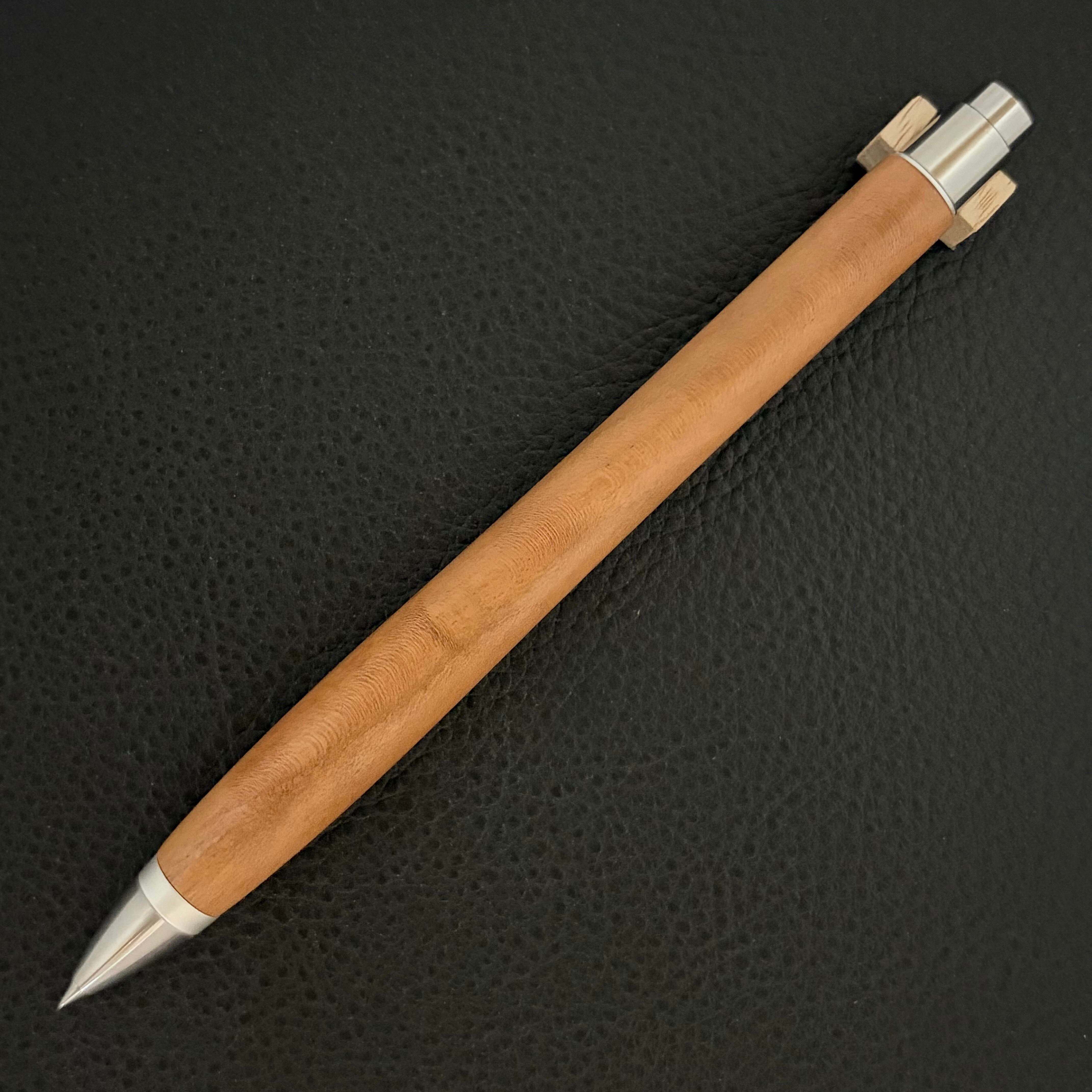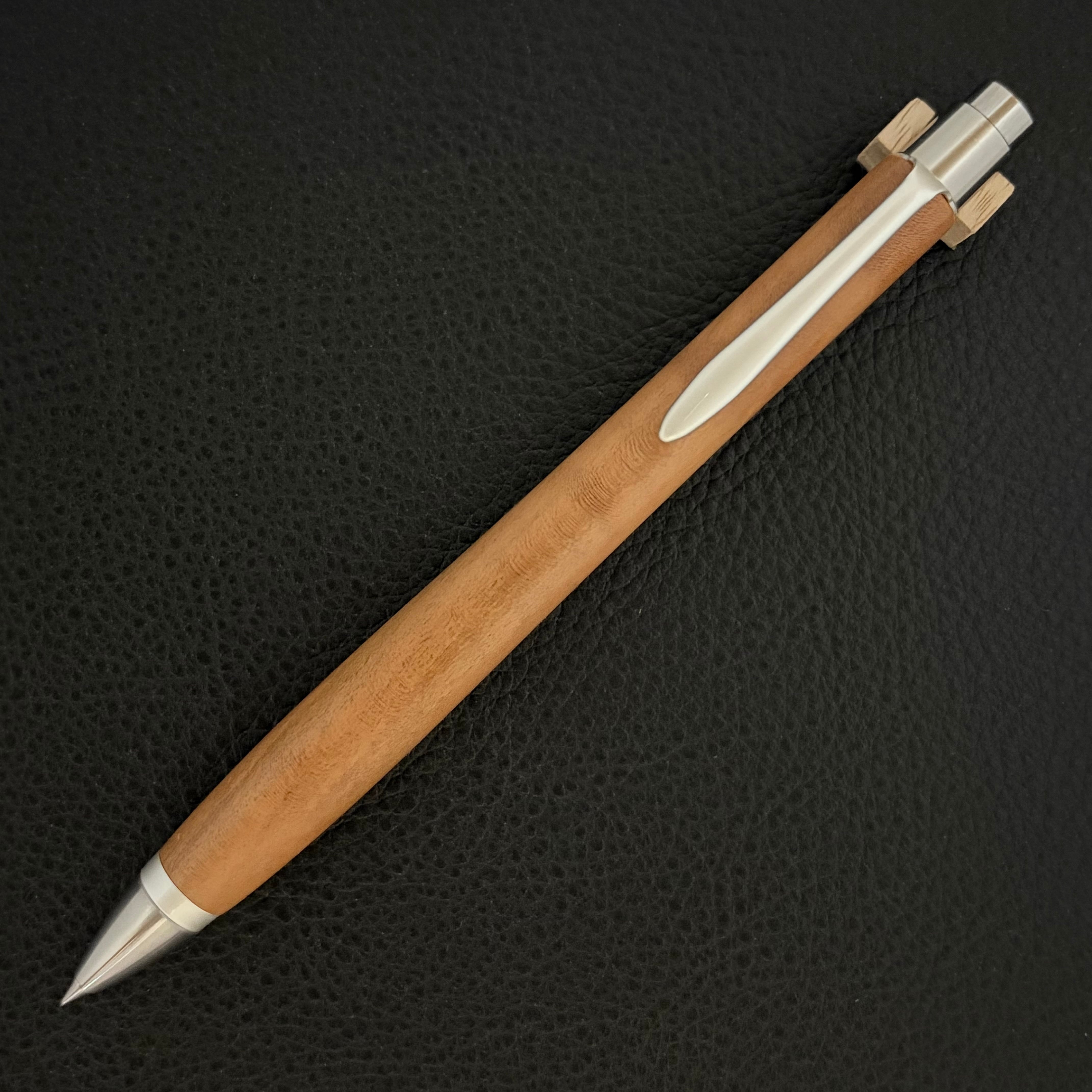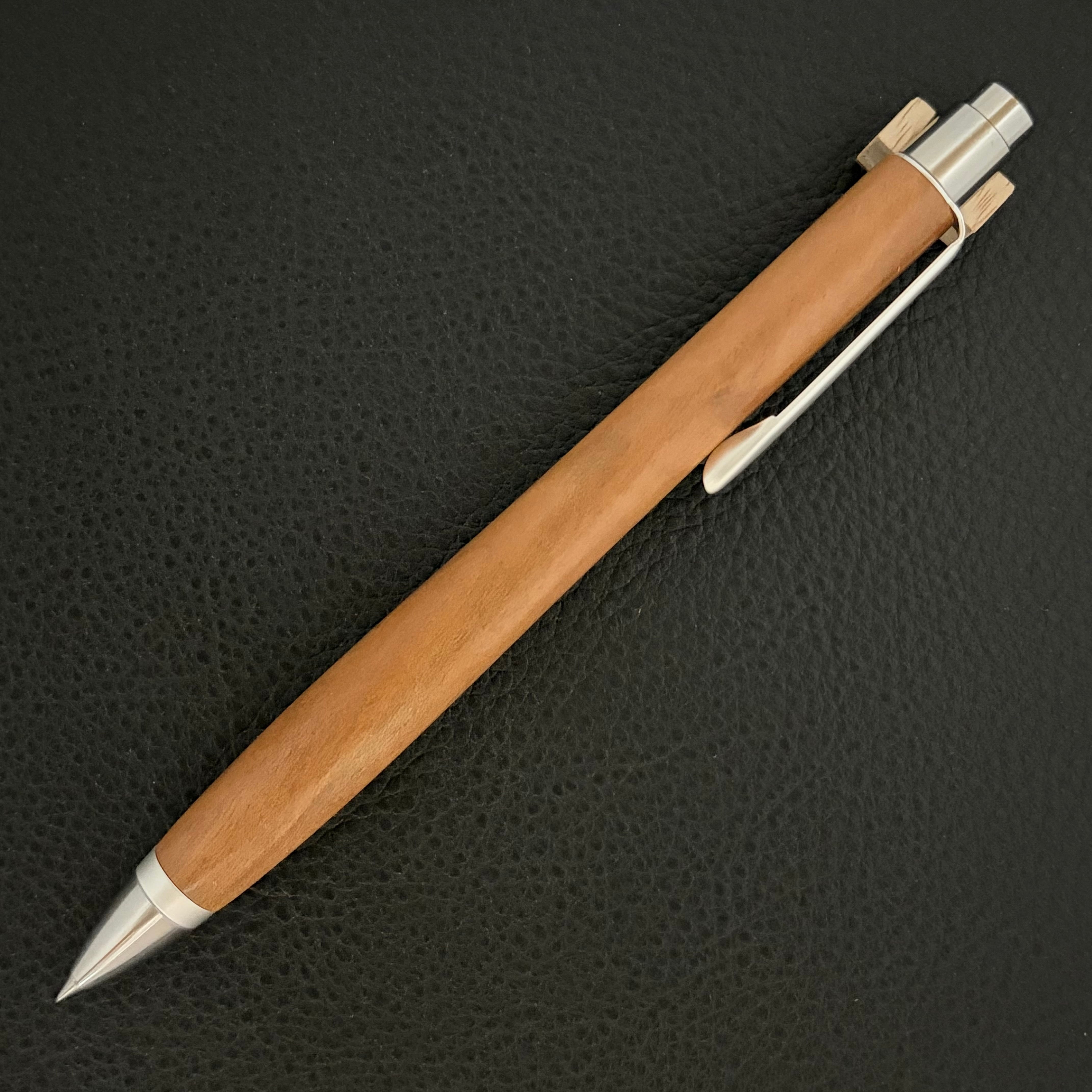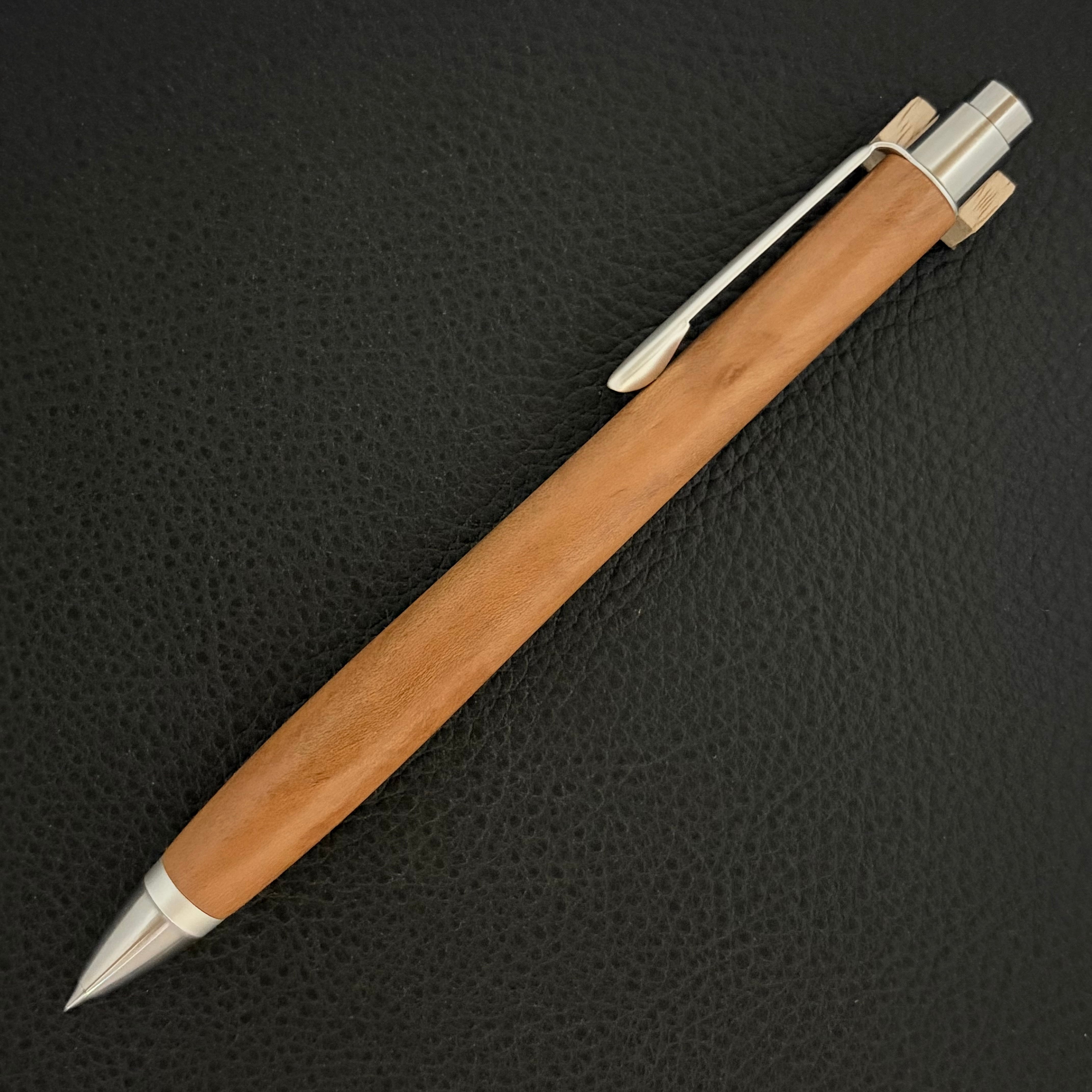 ボールペンのノックシステムは、ドイツ最高のクリックメカニズムを採用してあります。このメカニズムはユニークな機構のため、クリックしたときのカチカチ音が静かで、どんな場所でも気兼ねなく使うことができます。滑らかに動くこのプッシュ感覚を一度味わうと他には戻れなくなってしまうほどの魅力があります。 100分の1単位の加工精度で削り出されたペン先は、軸ブレも全くありません。