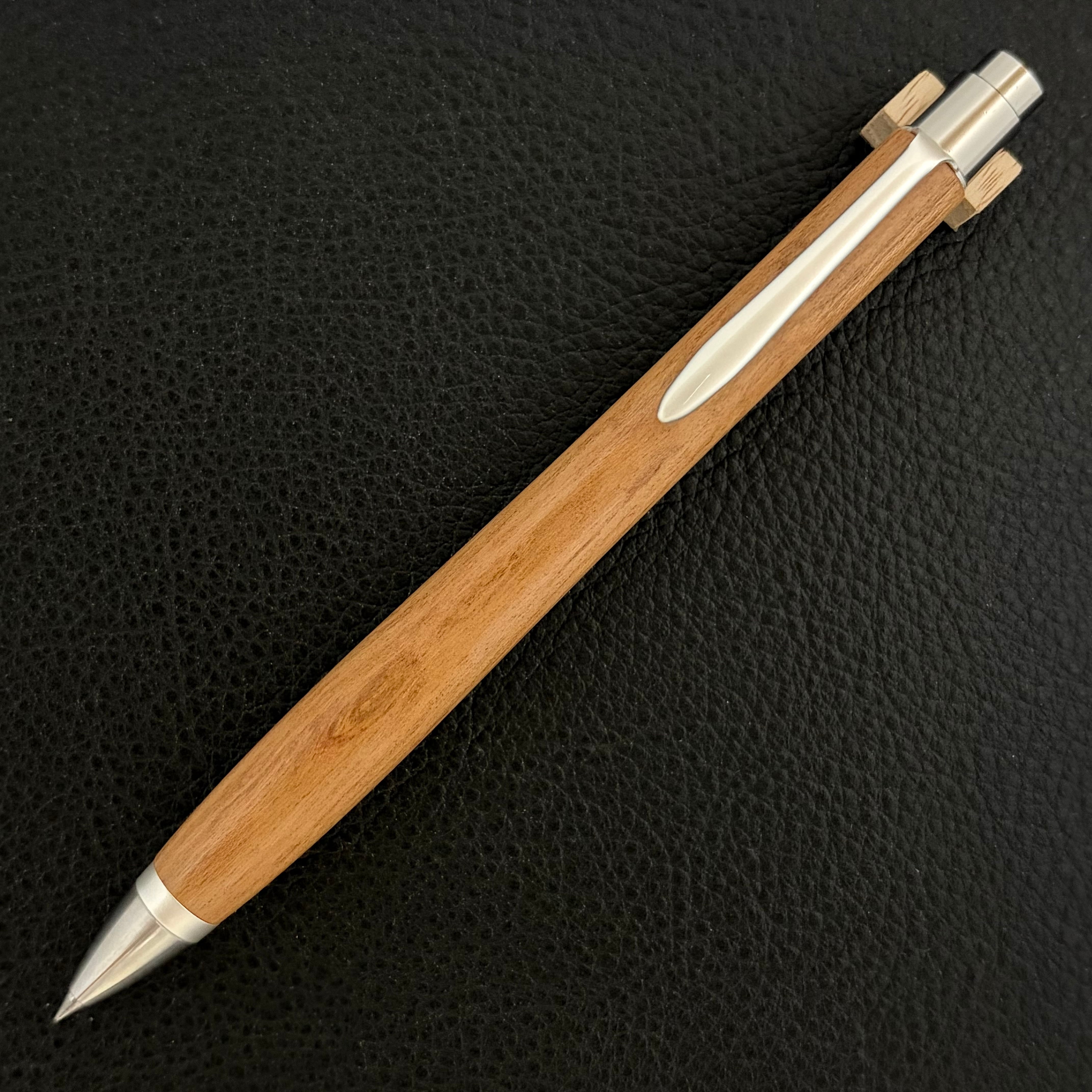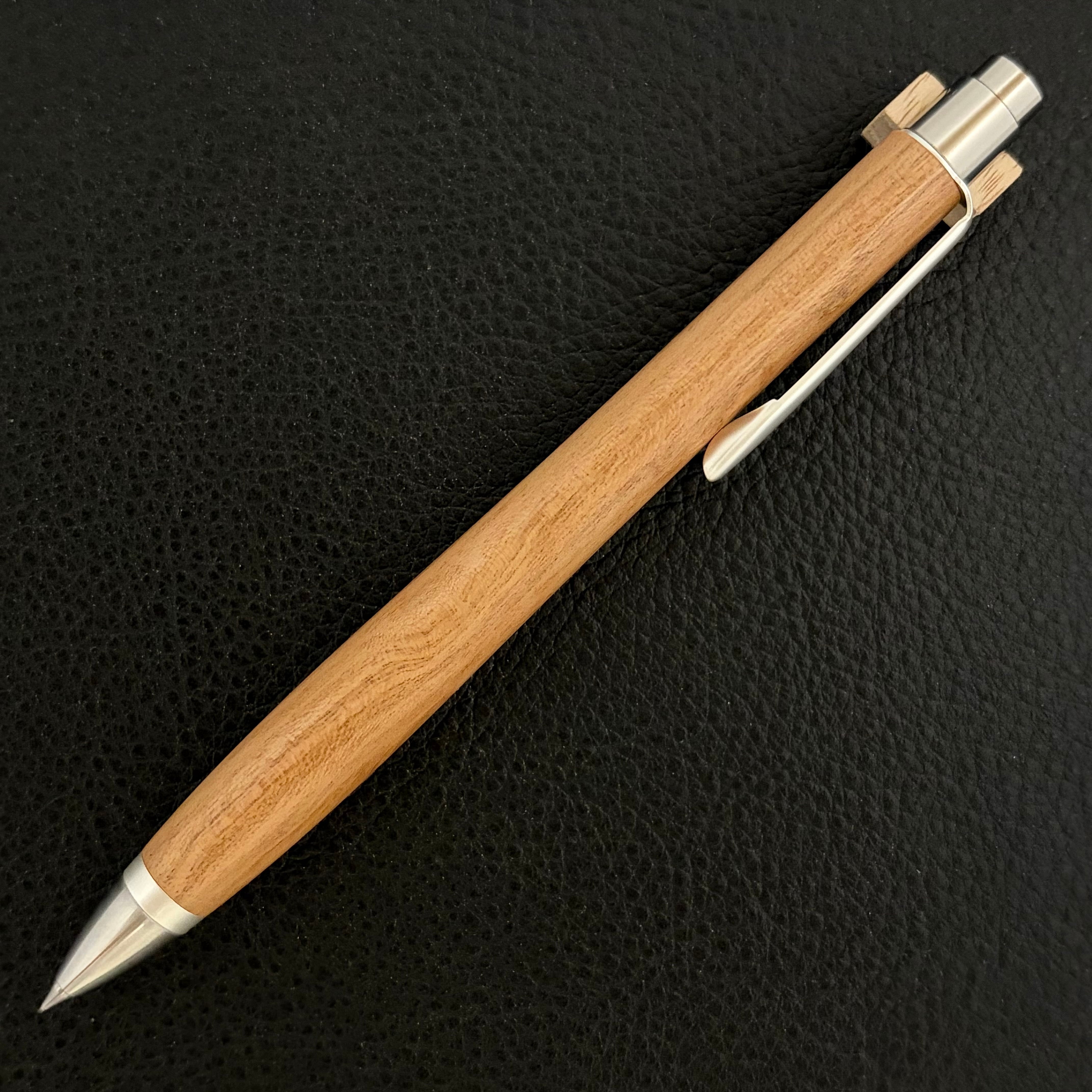 ボールペンのノックシステムは、ドイツ最高のクリックメカニズムを採用してあります。このメカニズムはユニークな機構のため、クリックしたときのカチカチ音が静かで、どんな場所でも気兼ねなく使うことができます。滑らかに動くこのプッシュ感覚を一度味わうと他には戻れなくなってしまうほどの魅力があります。 100分の1単位の加工精度で削り出されたペン先は、軸ブレも全くありません。