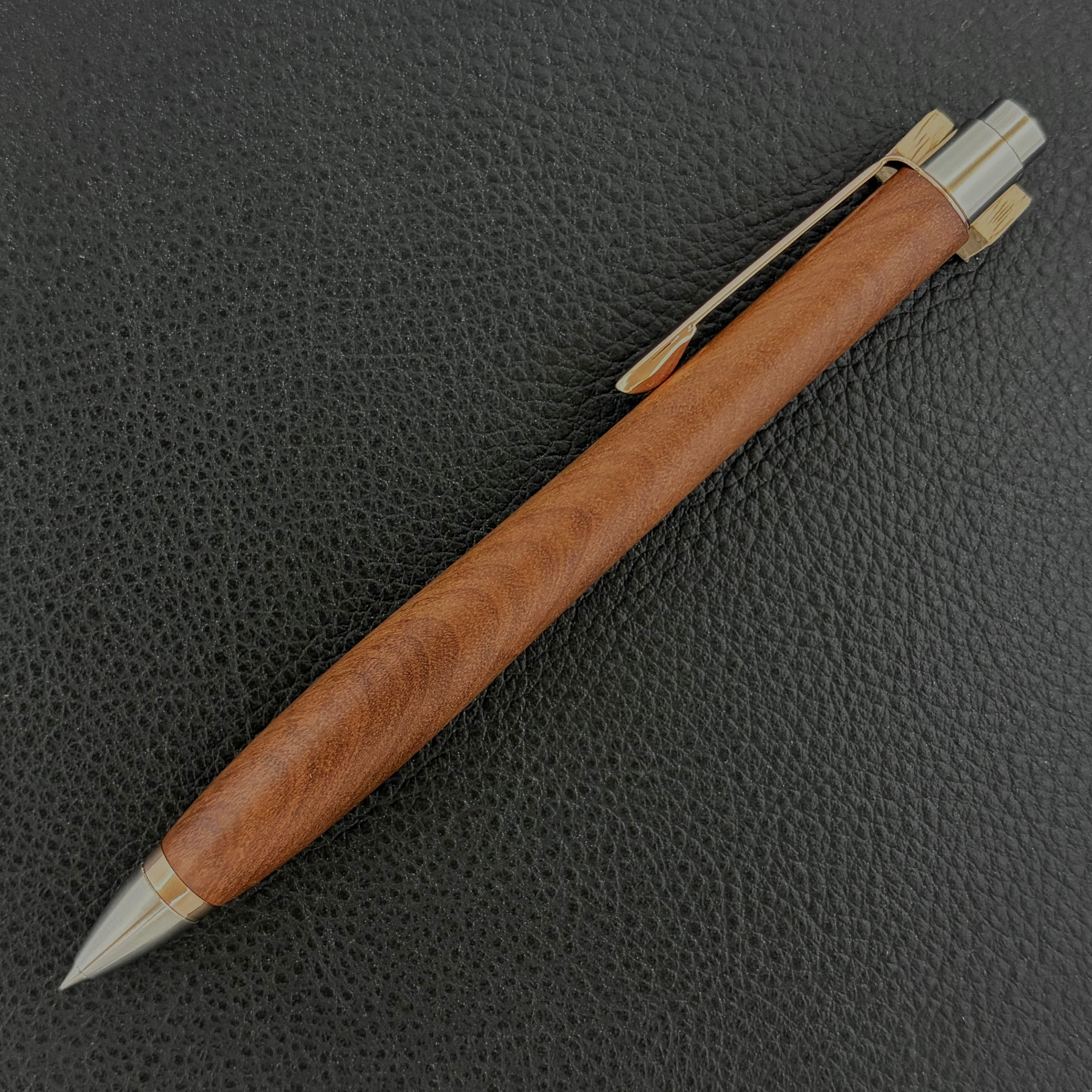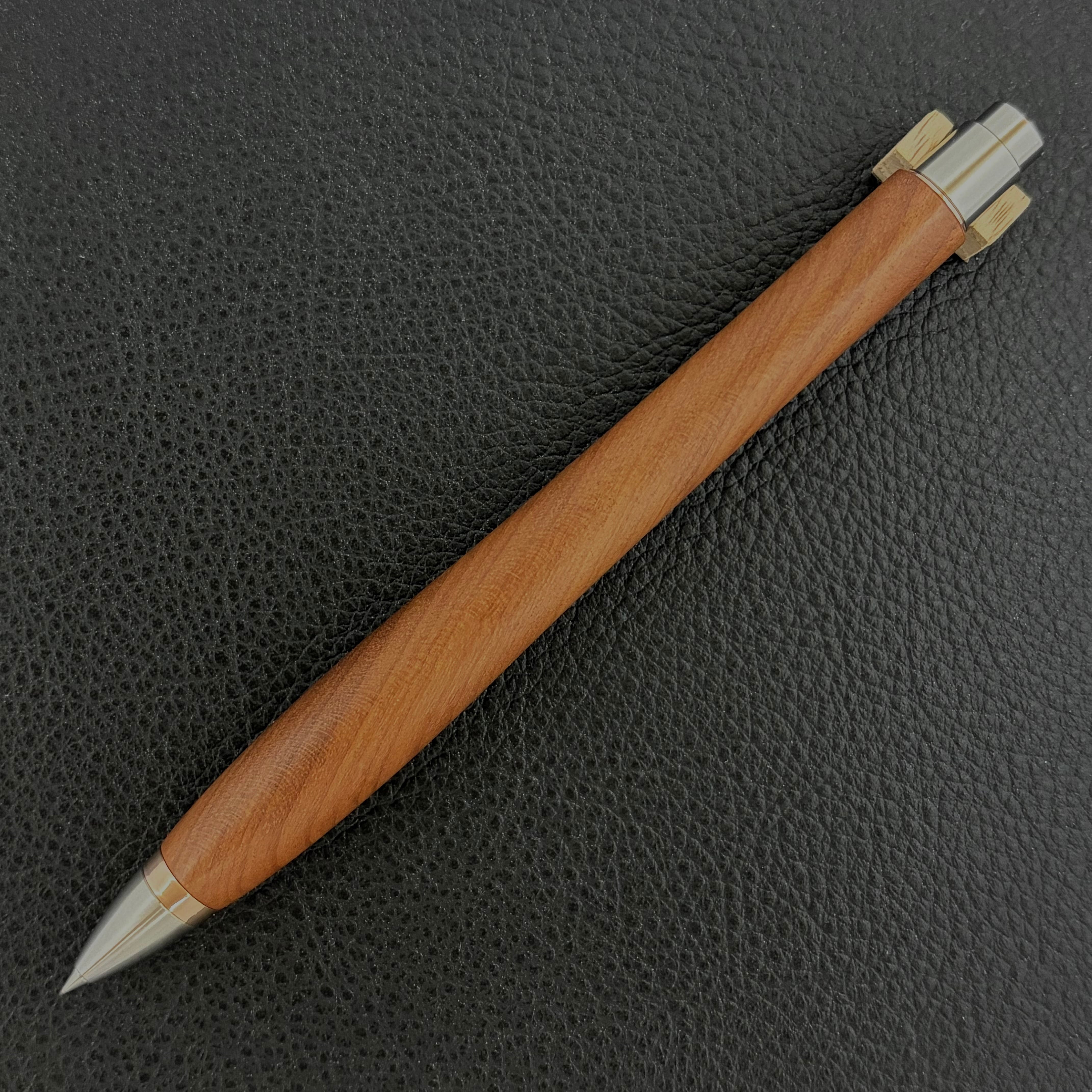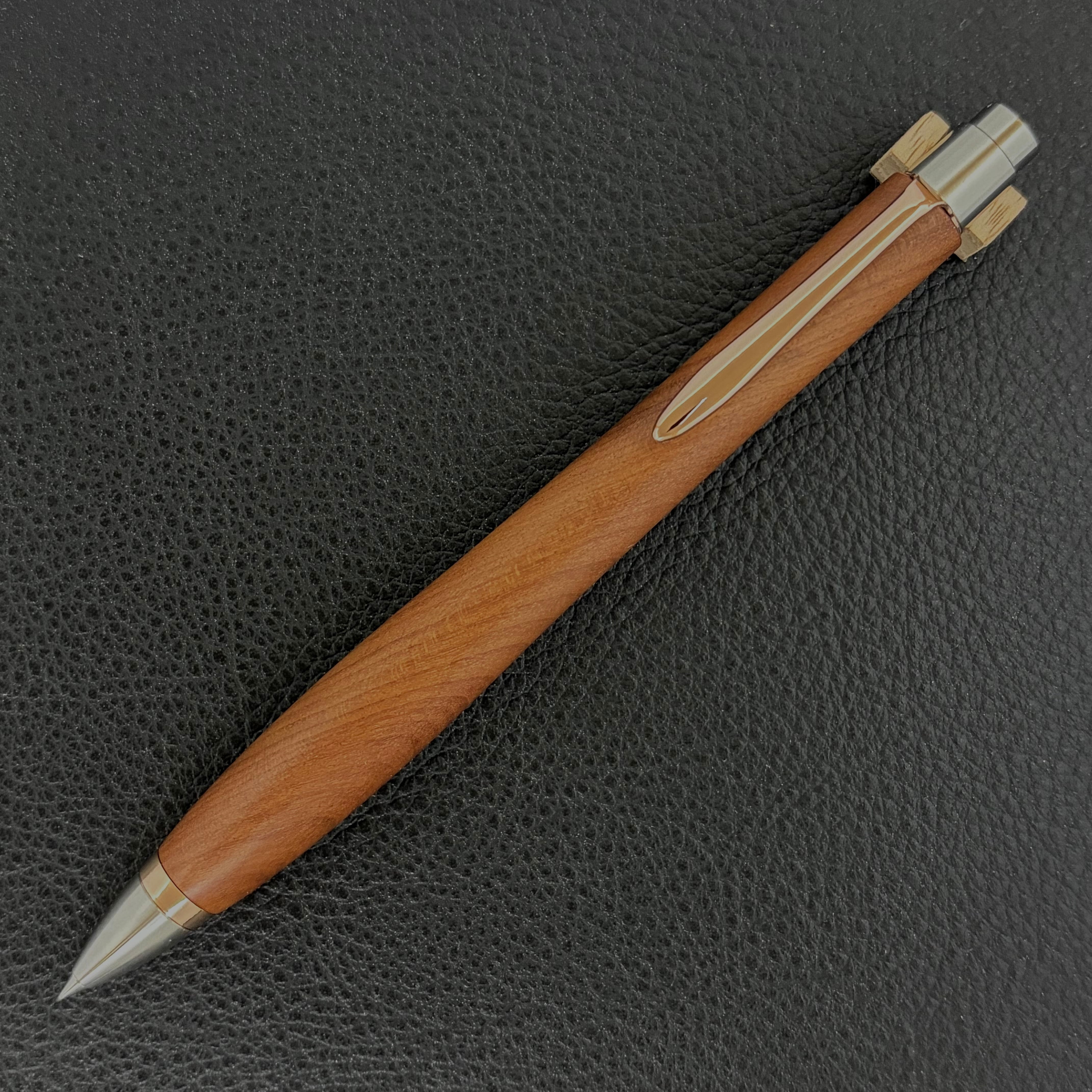 ボールペンのノックシステムは、ドイツ最高のクリックメカニズムを採用してあります。このメカニズムはユニークな機構のため、クリックしたときのカチカチ音が静かで、どんな場所でも気兼ねなく使うことができます。滑らかに動くこのプッシュ感覚を一度味わうと他には戻れなくなってしまうほどの魅力があります。 100分の1単位の加工精度で削り出されたペン先は、軸ブレも全くありません。