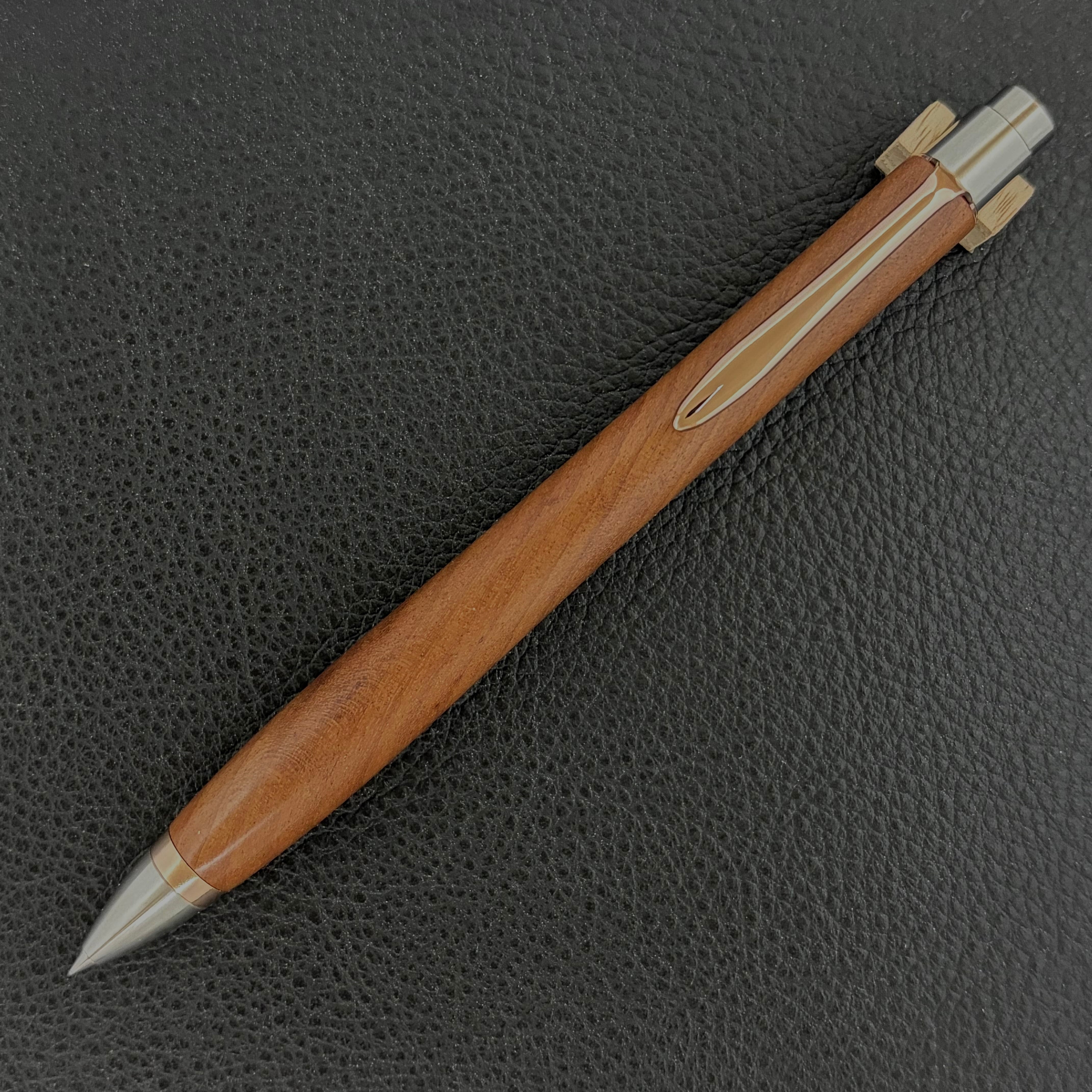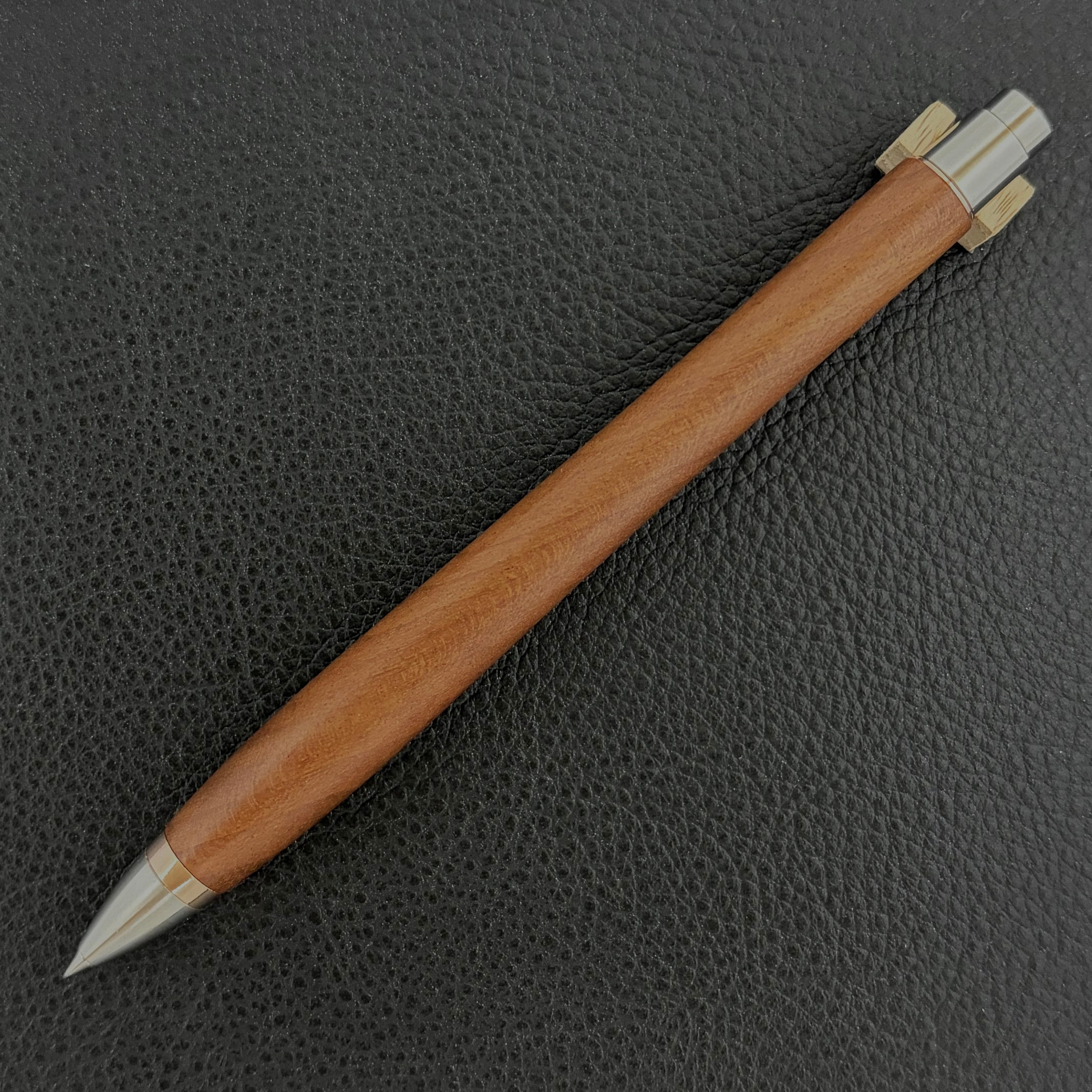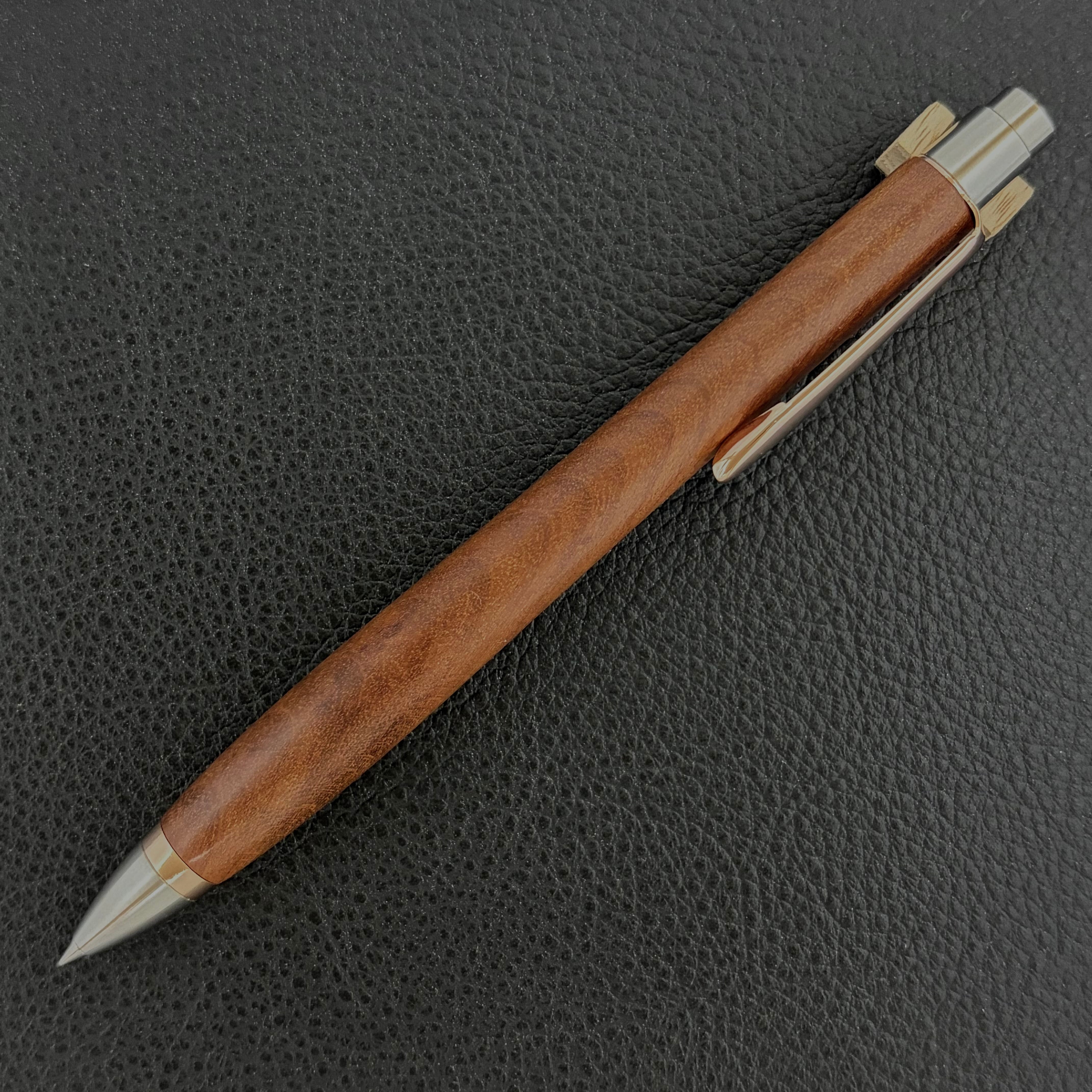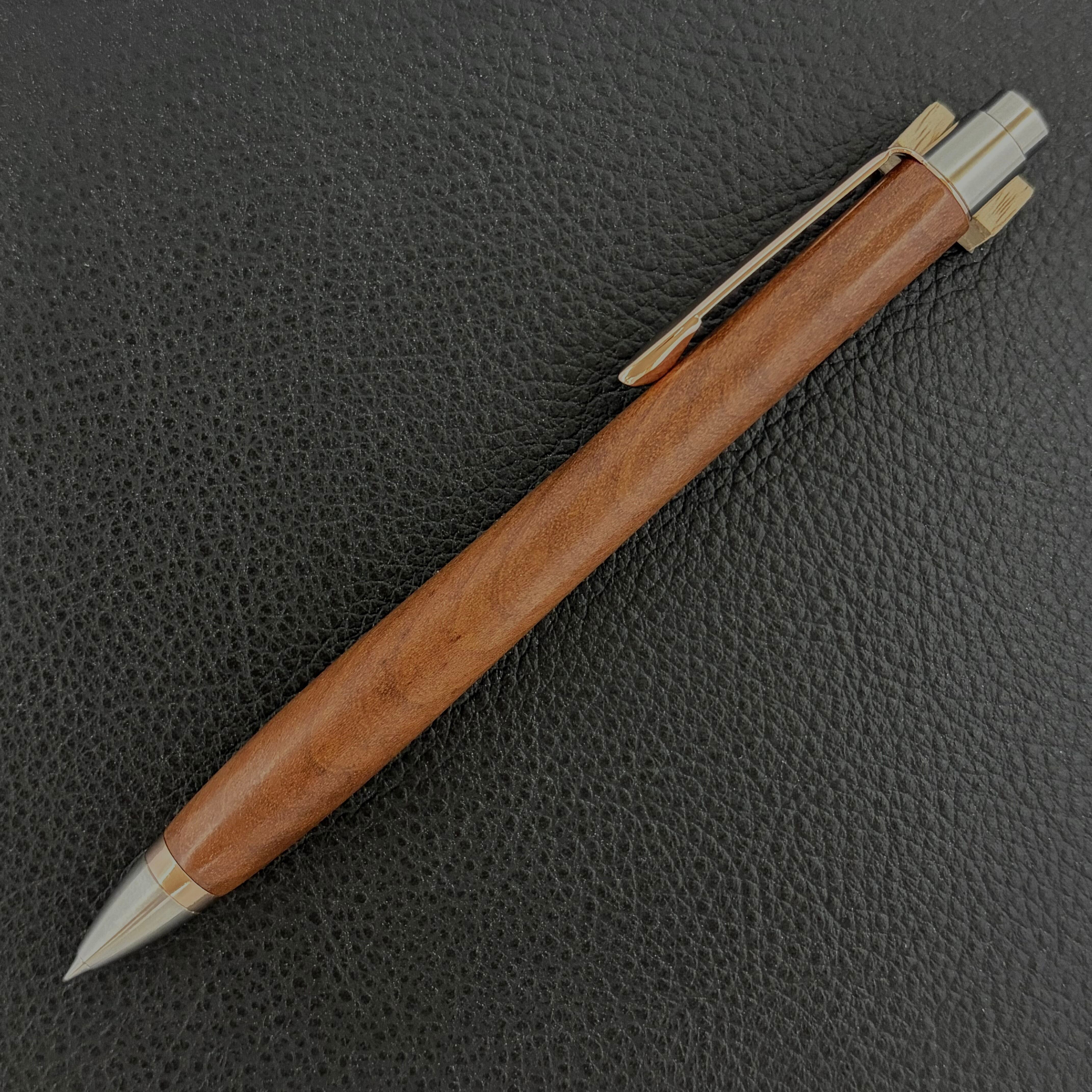 ボールペンのノックシステムは、ドイツ最高のクリックメカニズムを採用してあります。このメカニズムはユニークな機構のため、クリックしたときのカチカチ音が静かで、どんな場所でも気兼ねなく使うことができます。滑らかに動くこのプッシュ感覚を一度味わうと他には戻れなくなってしまうほどの魅力があります。 100分の1単位の加工精度で削り出されたペン先は、軸ブレも全くありません。