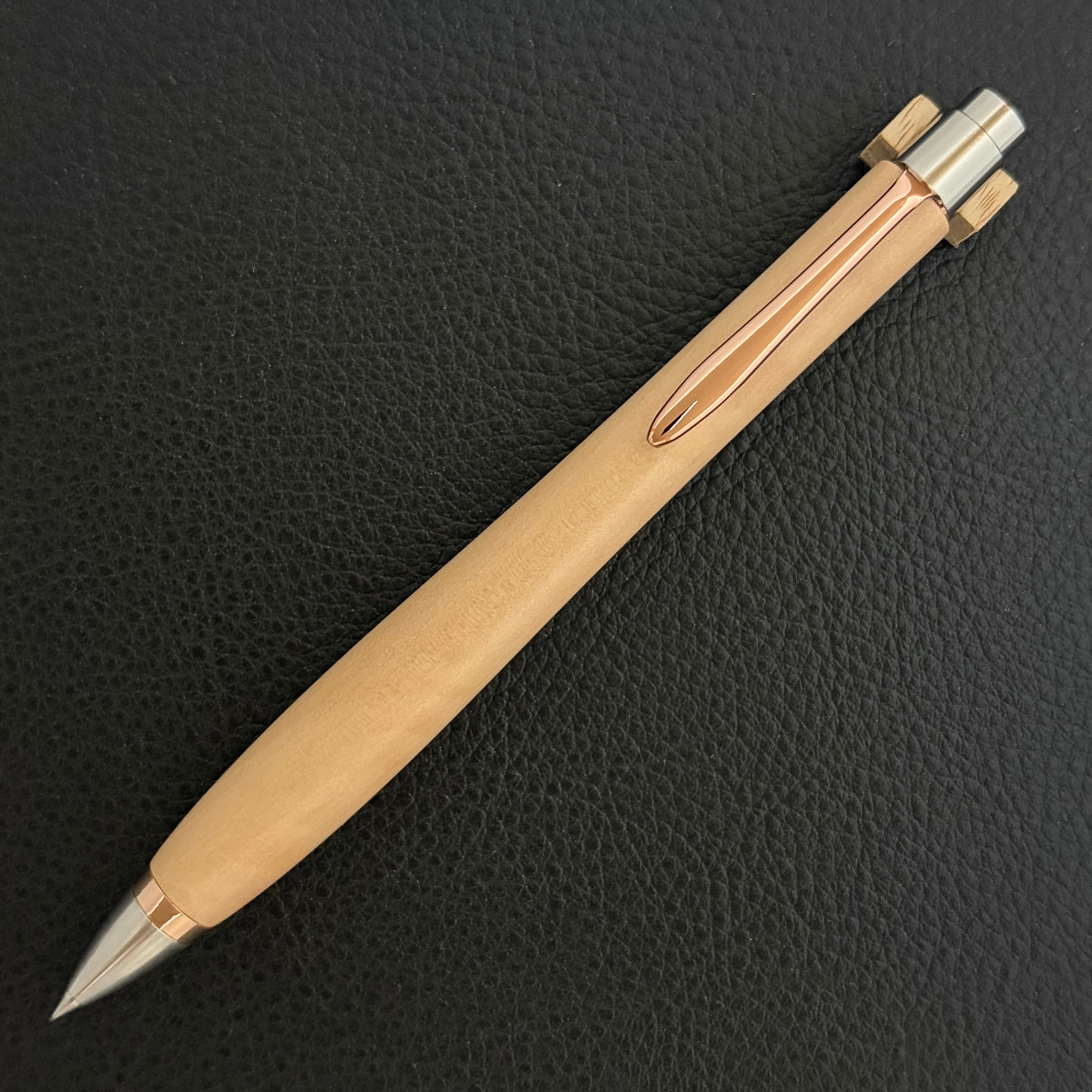 ボールペンのノックシステムは、ドイツ最高のクリックメカニズムを採用してあります。このメカニズムはユニークな機構のため、クリックしたときのカチカチ音が静かで、どんな場所でも気兼ねなく使うことができます。滑らかに動くこのプッシュ感覚を一度味わうと他には戻れなくなってしまうほどの魅力があります。 100分の1単位の加工精度で削り出されたペン先は、軸ブレも全くありません。