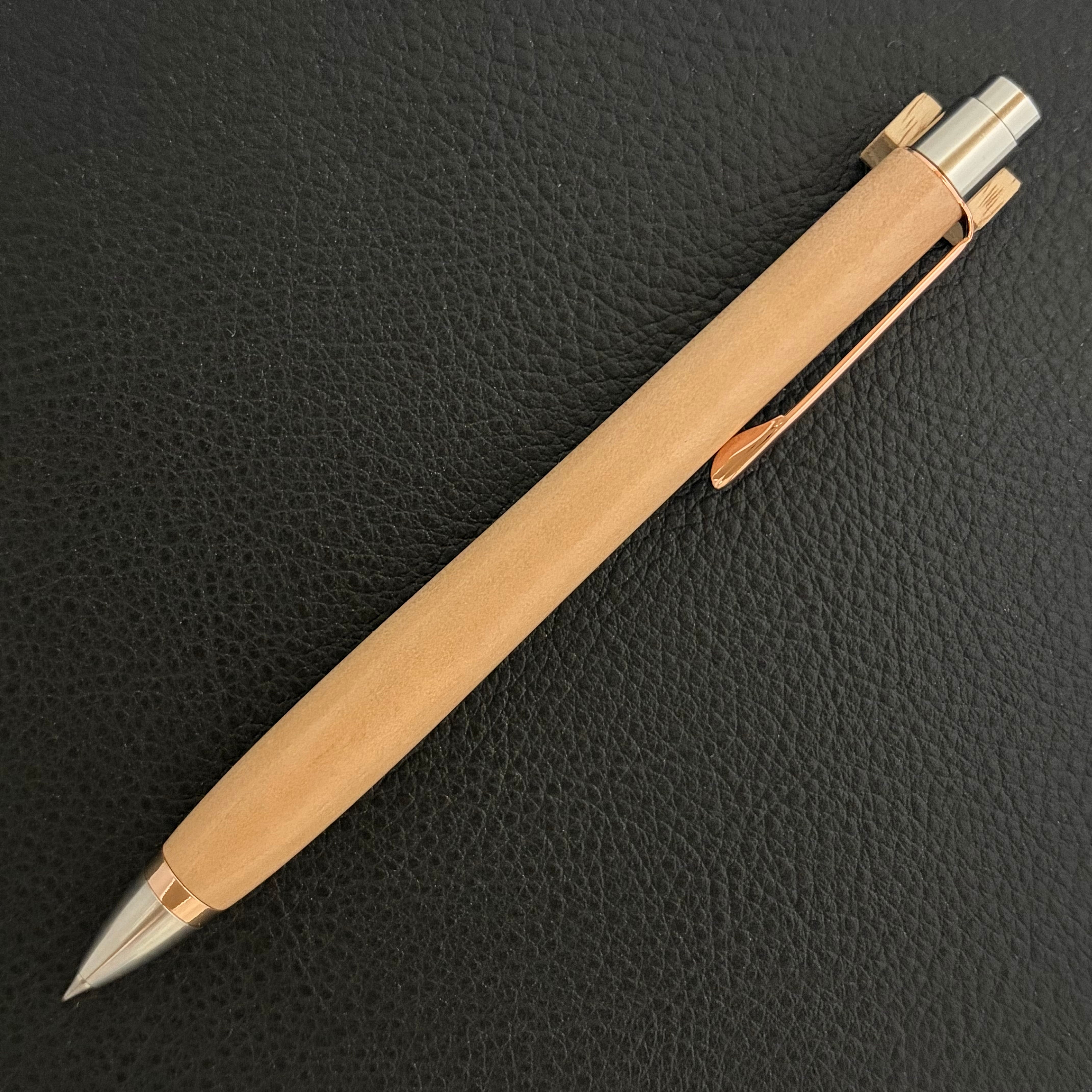 ボールペンのノックシステムは、ドイツ最高のクリックメカニズムを採用してあります。このメカニズムはユニークな機構のため、クリックしたときのカチカチ音が静かで、どんな場所でも気兼ねなく使うことができます。滑らかに動くこのプッシュ感覚を一度味わうと他には戻れなくなってしまうほどの魅力があります。 100分の1単位の加工精度で削り出されたペン先は、軸ブレも全くありません。