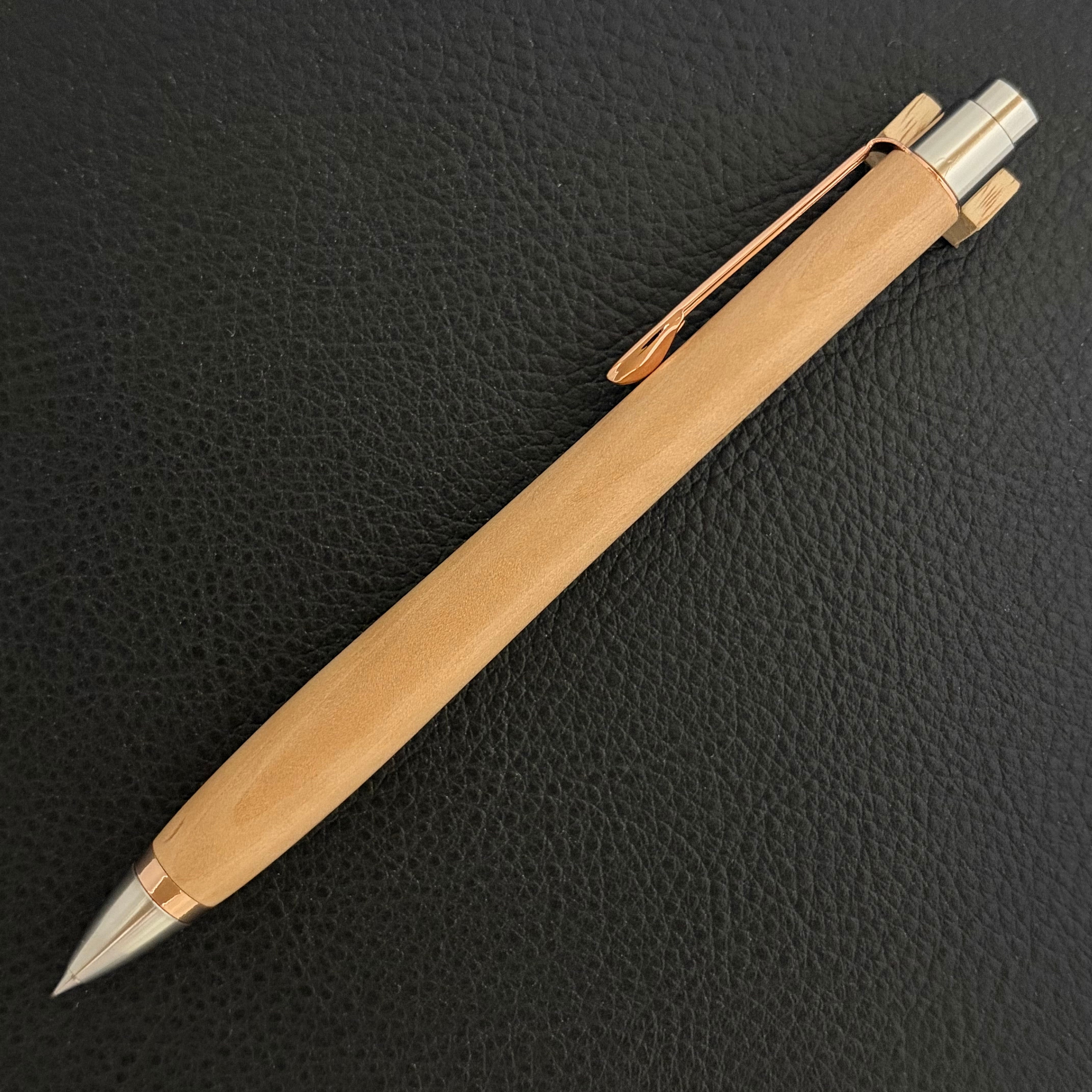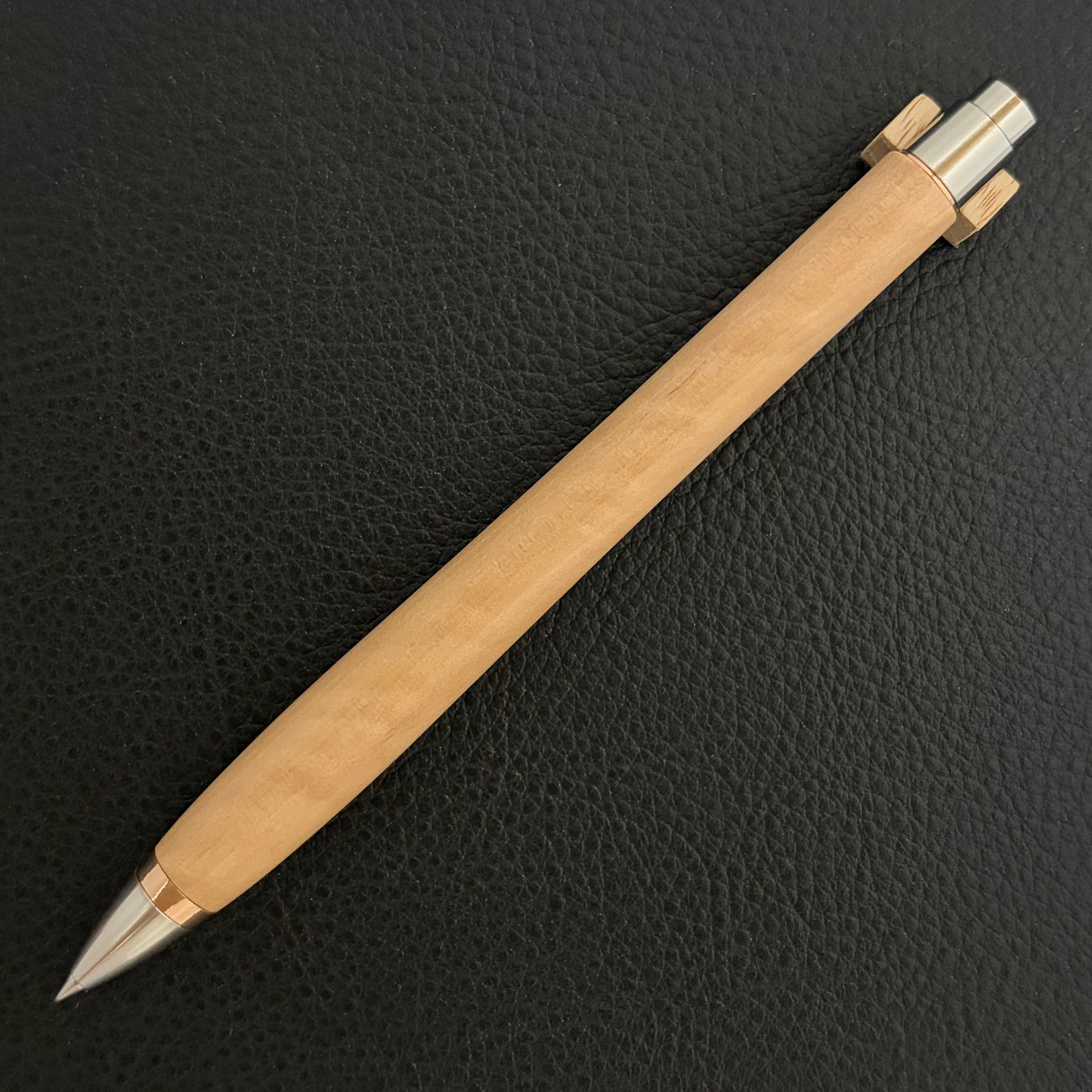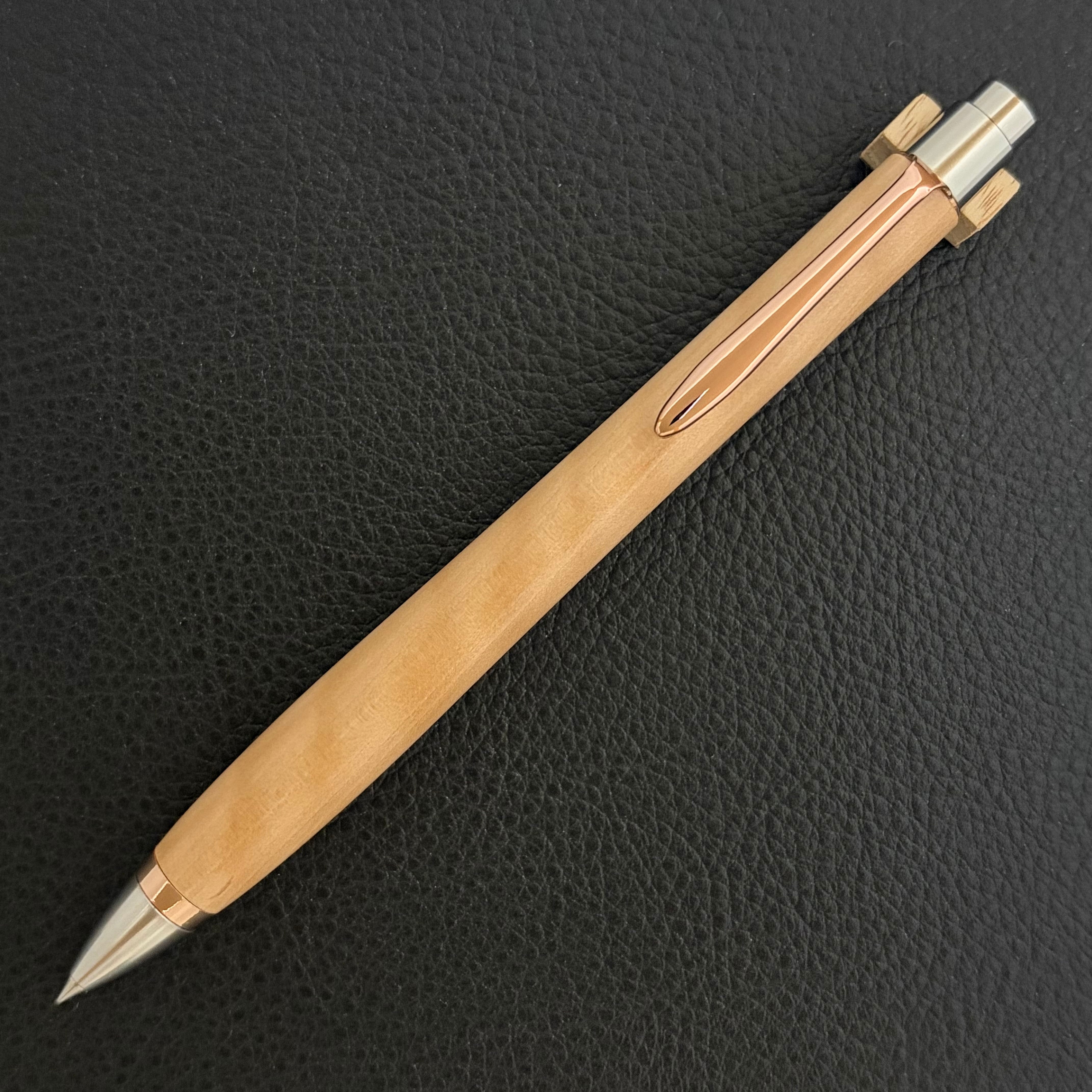 ボールペンのノックシステムは、ドイツ最高のクリックメカニズムを採用してあります。このメカニズムはユニークな機構のため、クリックしたときのカチカチ音が静かで、どんな場所でも気兼ねなく使うことができます。滑らかに動くこのプッシュ感覚を一度味わうと他には戻れなくなってしまうほどの魅力があります。 100分の1単位の加工精度で削り出されたペン先は、軸ブレも全くありません。