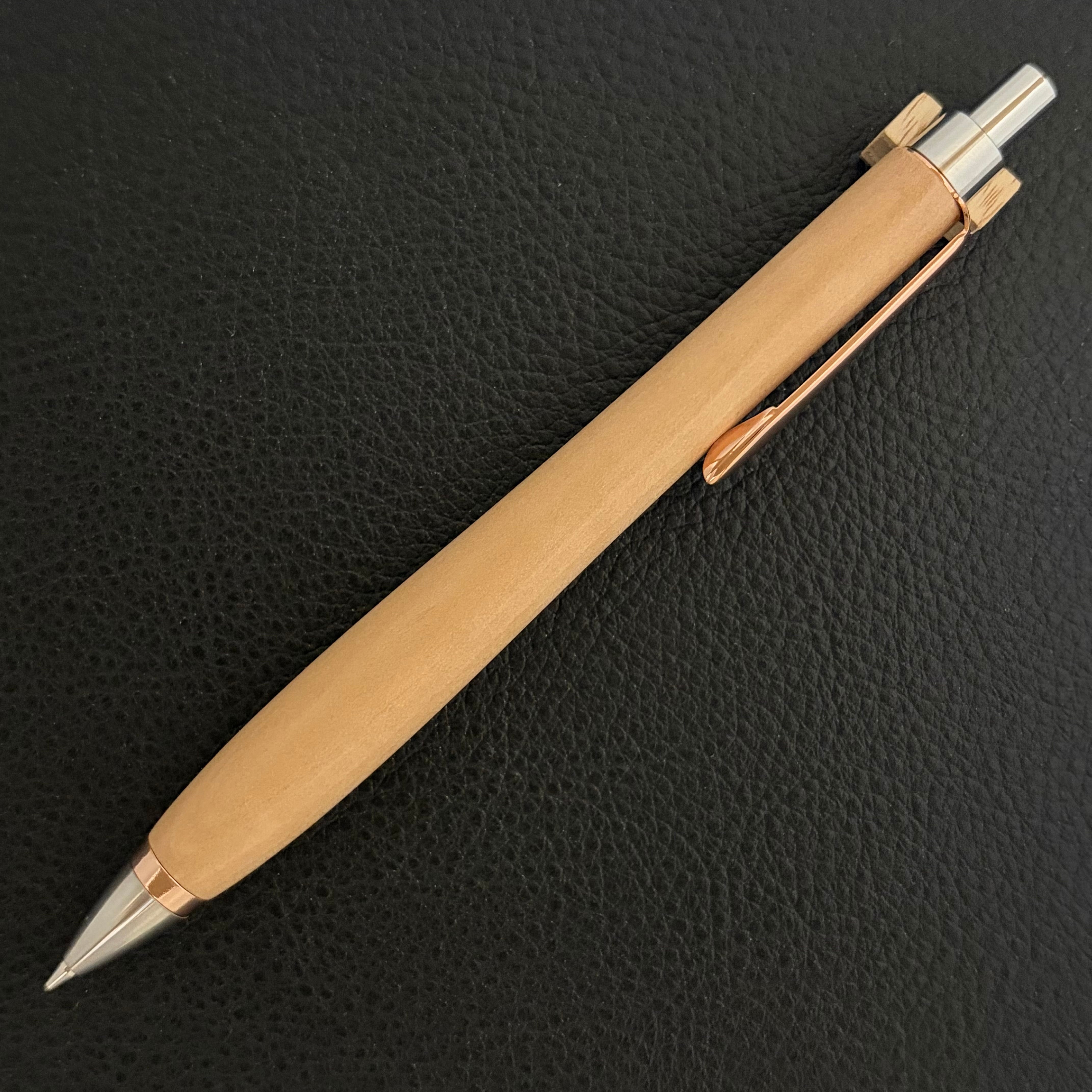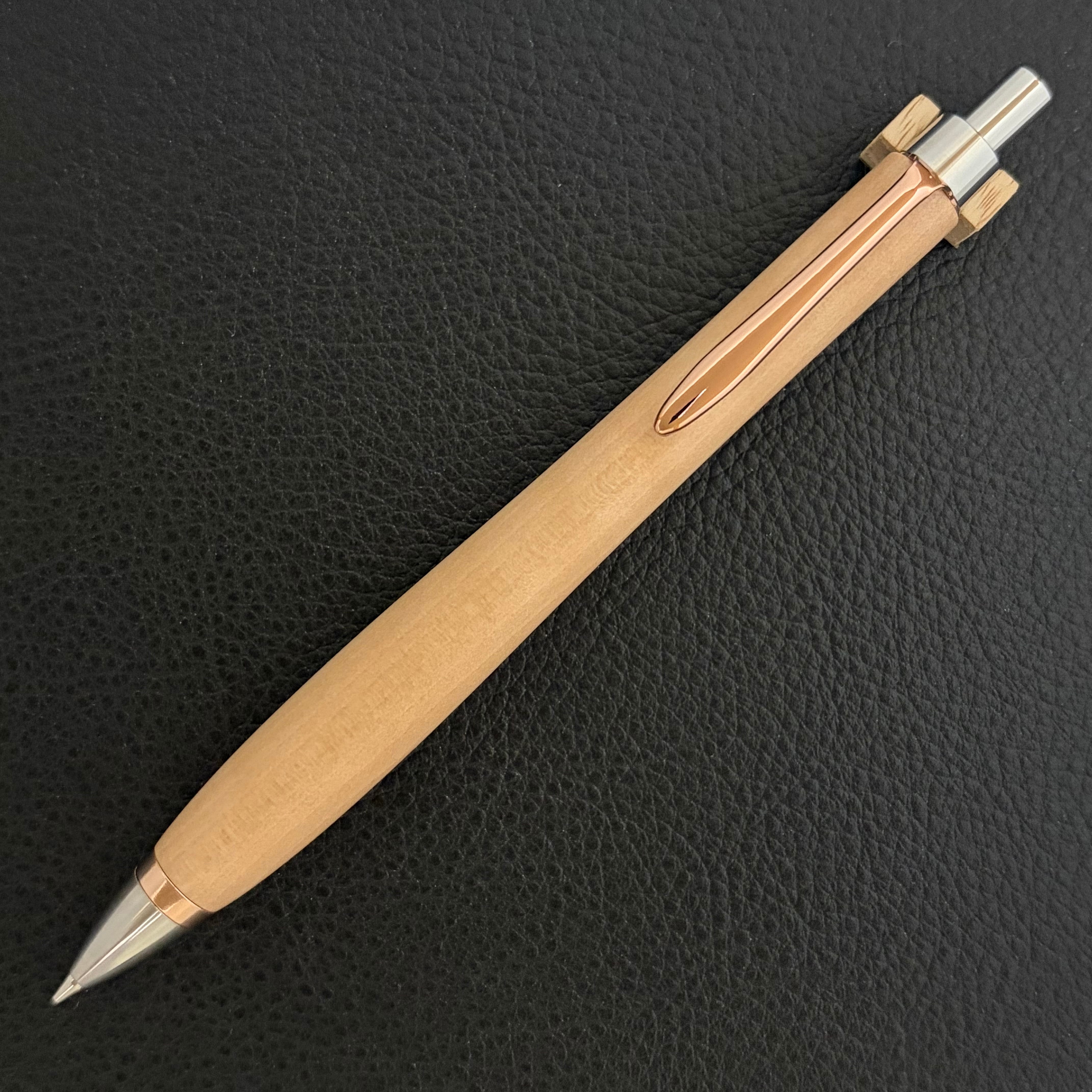 ペンシルは軸ブレが起こりにくい固定式口金を採用し、木の表情を最大限に楽しめる木軸の長さと、書き心地にこだわったバランスで金具を設計してあります。