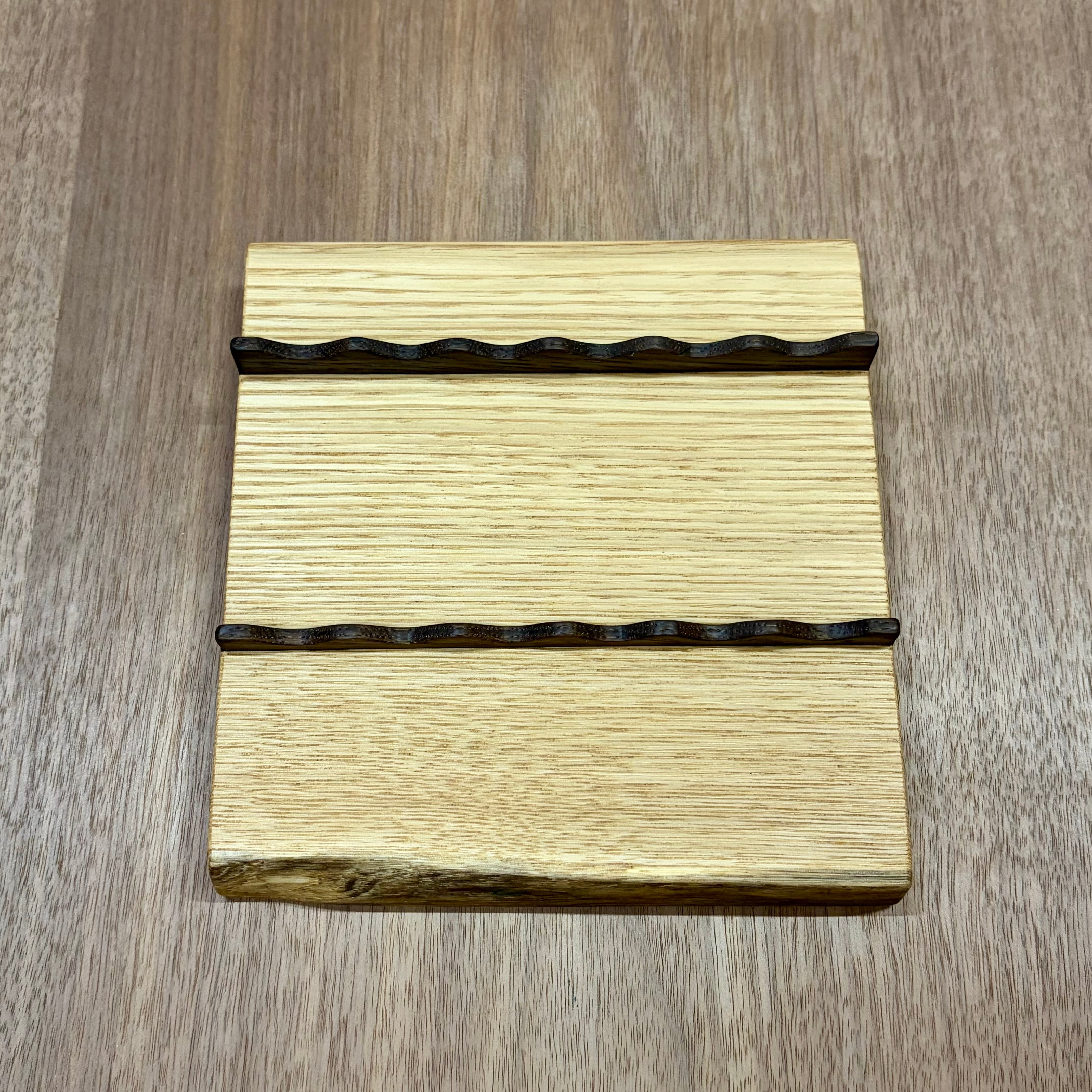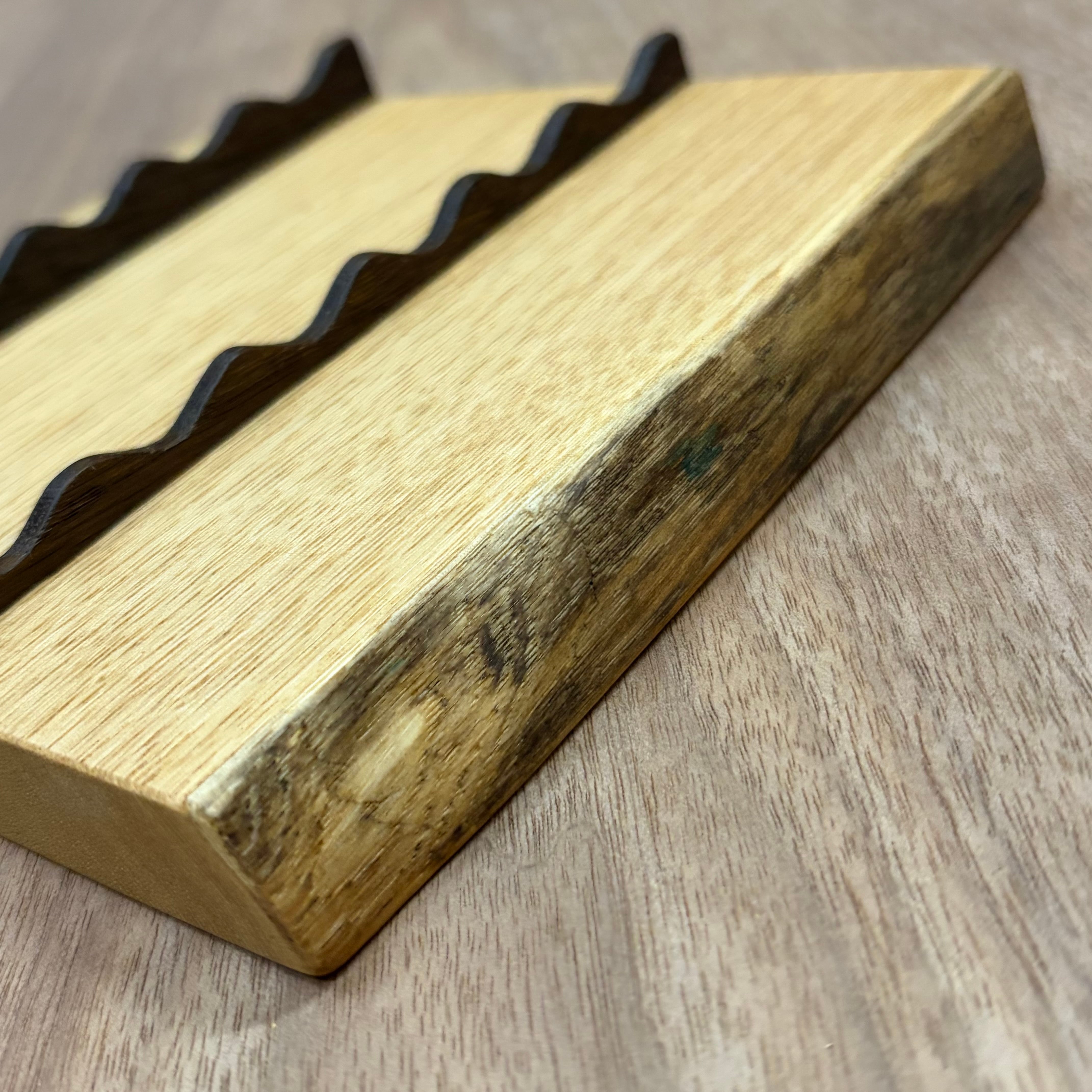 デスクの上でペンを6本飾ることができる、木の温かみや表情をそのまま活かした6本置きペントレイです。ペンを優しく支えれる茶色の曲線部分はローステッドオークを加工しています。