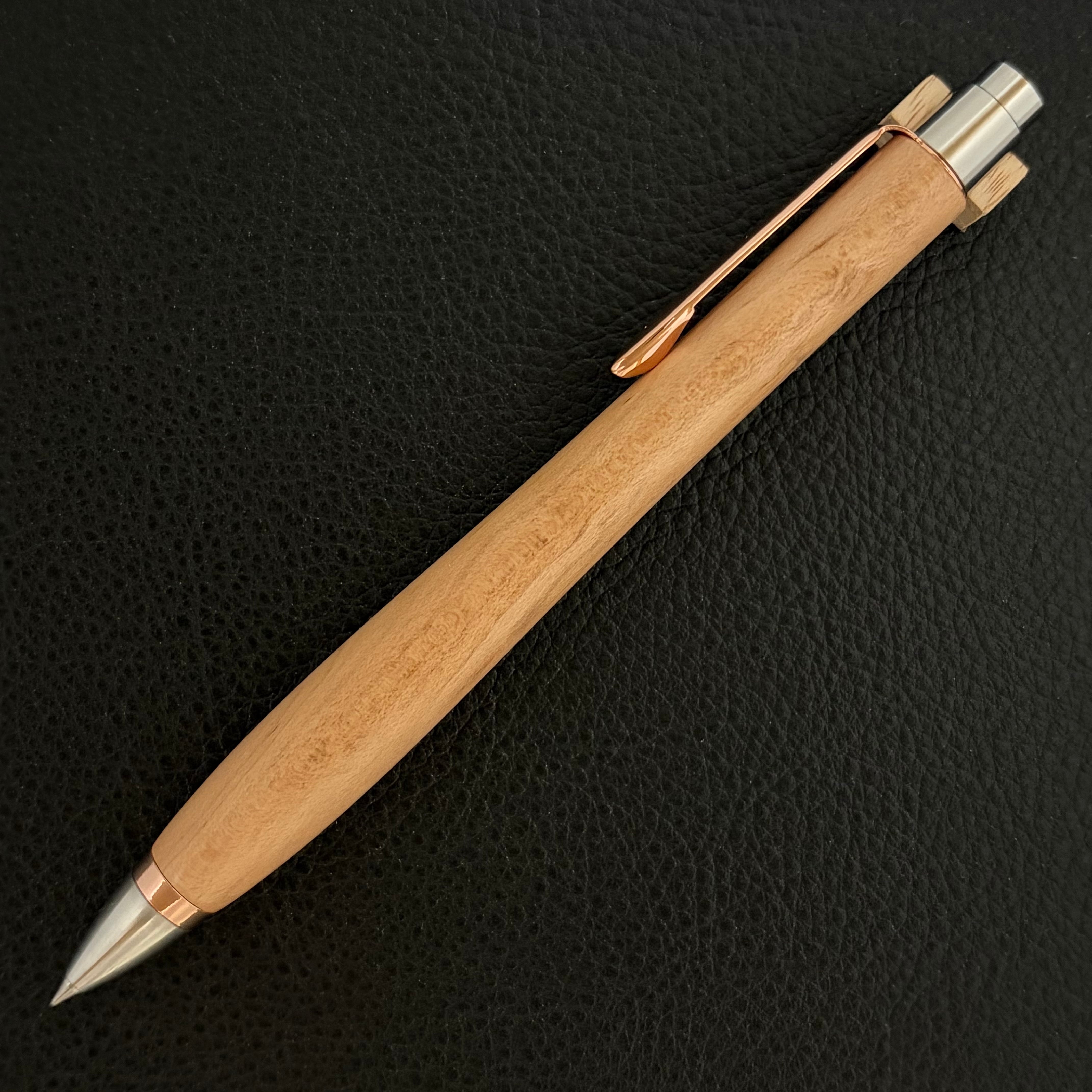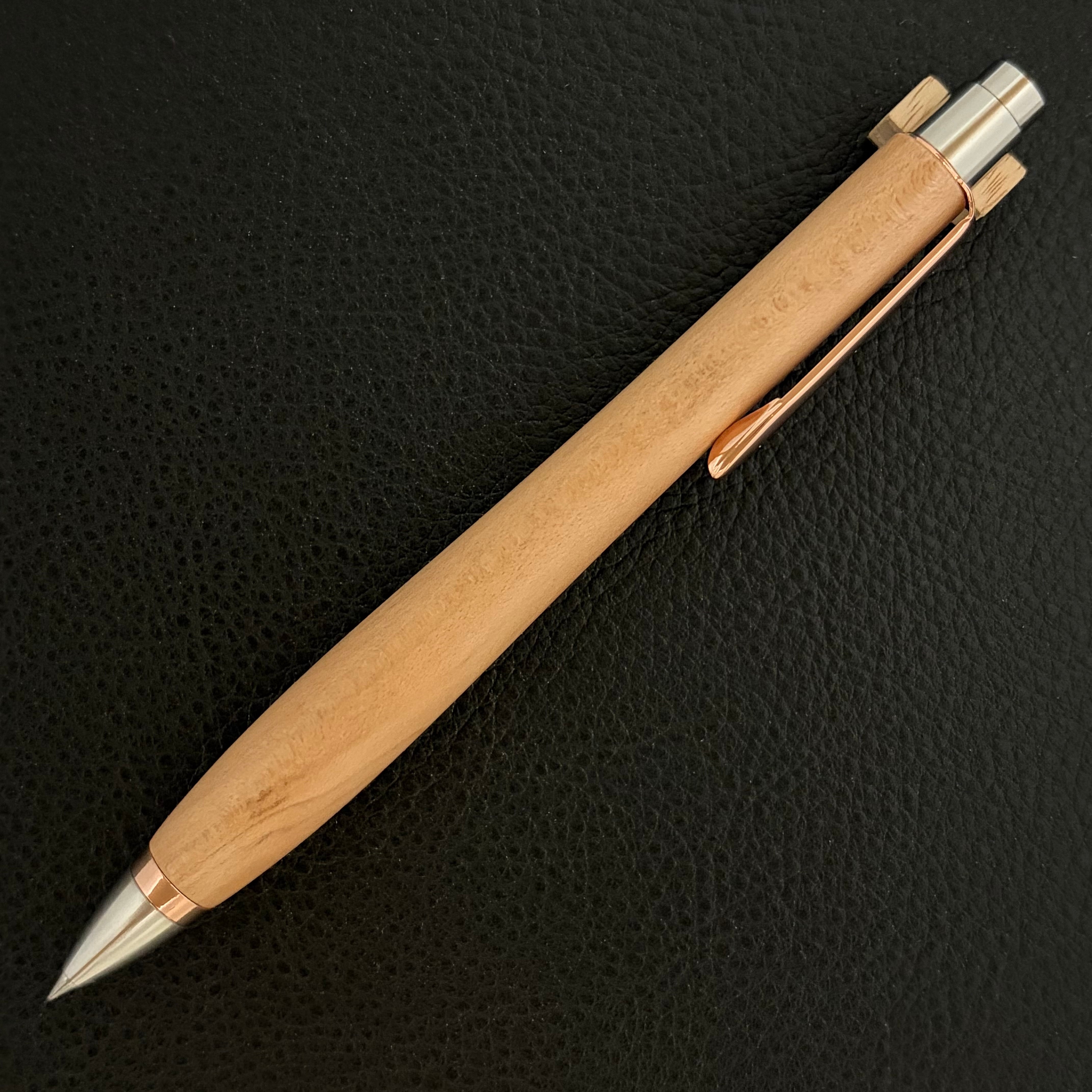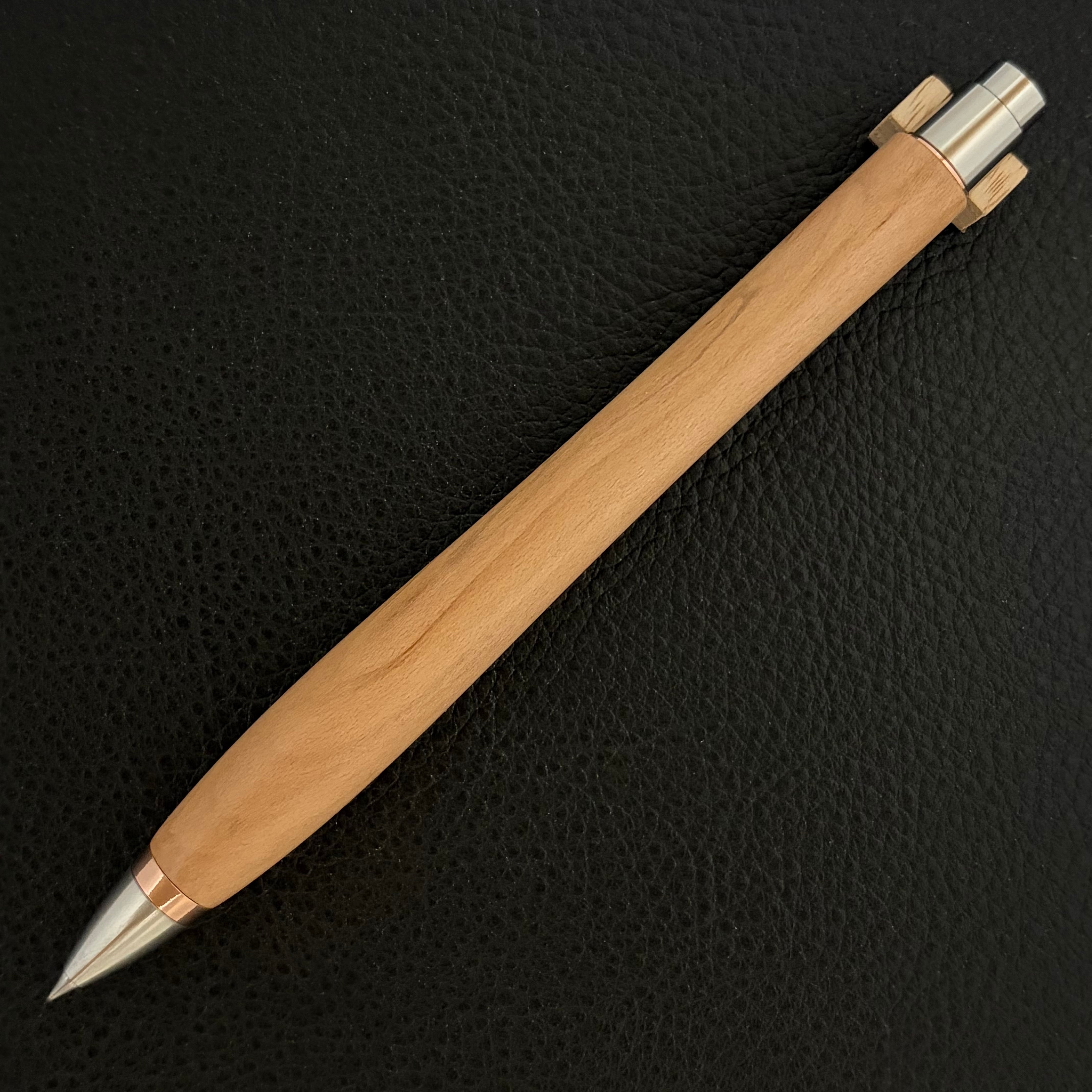 ボールペンのノックシステムは、ドイツ最高のクリックメカニズムを採用してあります。このメカニズムはユニークな機構のため、クリックしたときのカチカチ音が静かで、どんな場所でも気兼ねなく使うことができます。滑らかに動くこのプッシュ感覚を一度味わうと他には戻れなくなってしまうほどの魅力があります。 100分の1単位の加工精度で削り出されたペン先は、軸ブレも全くありません。